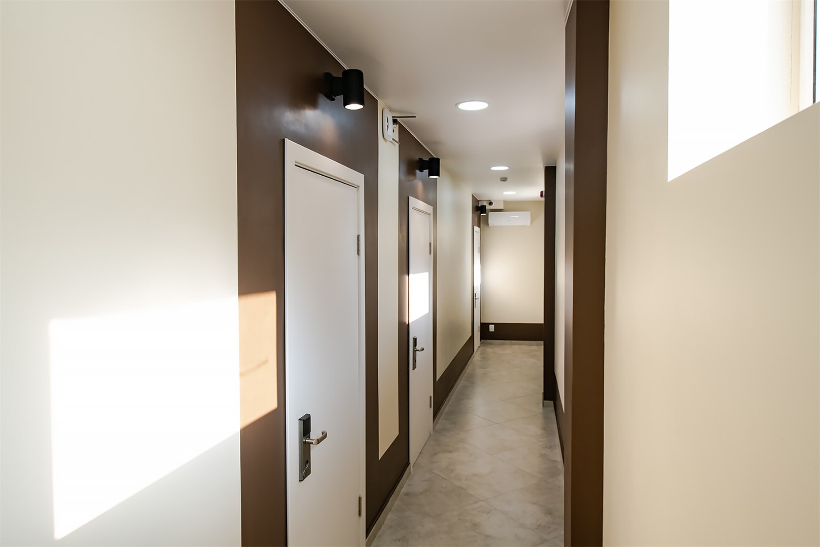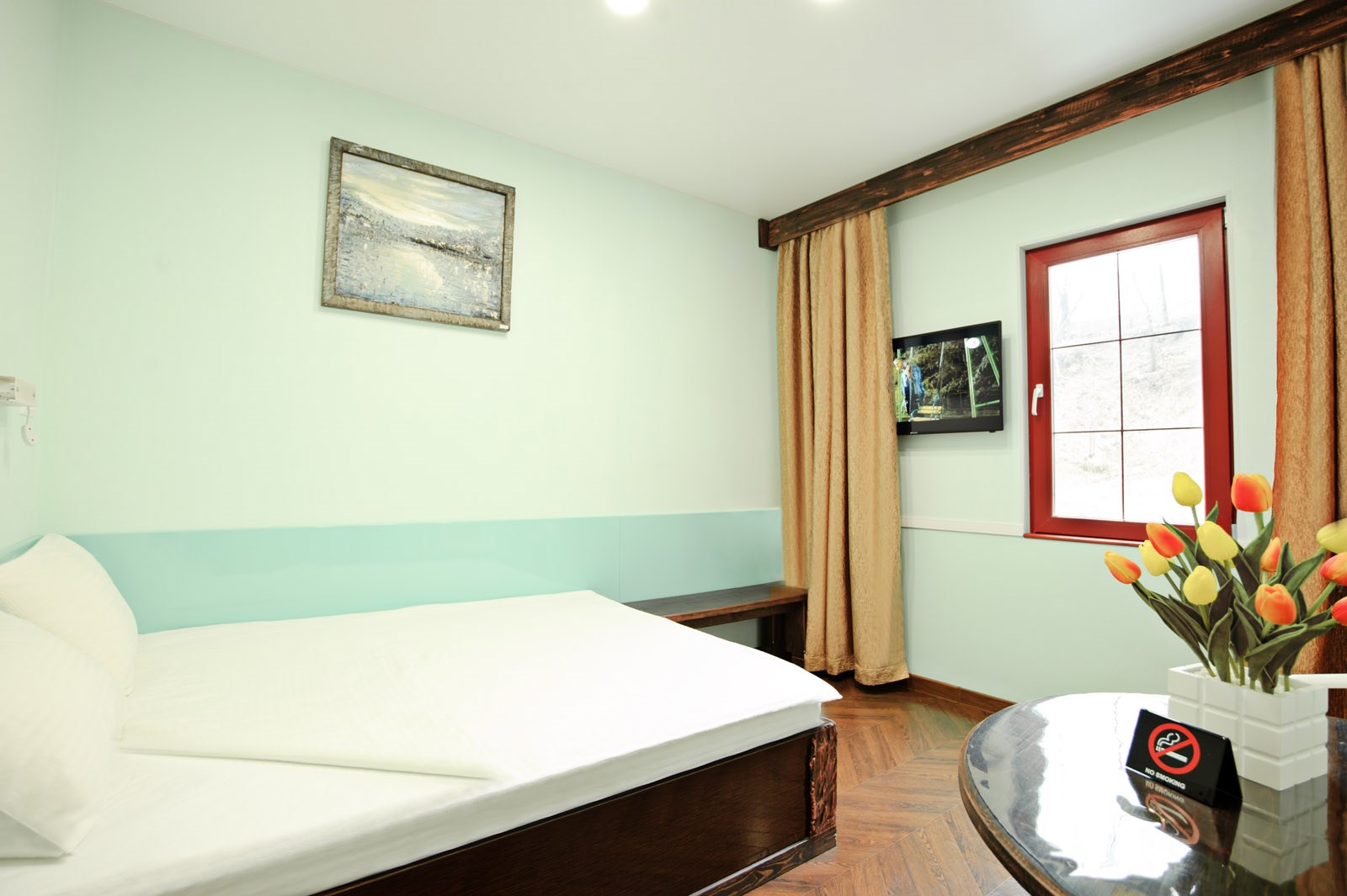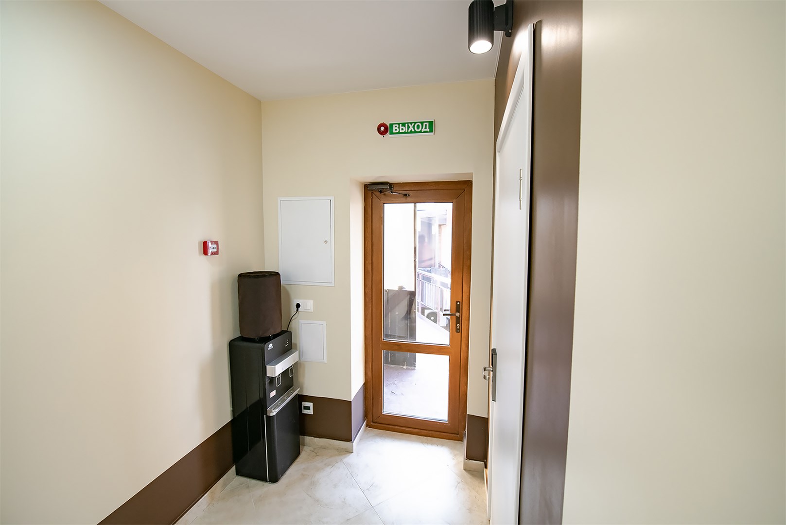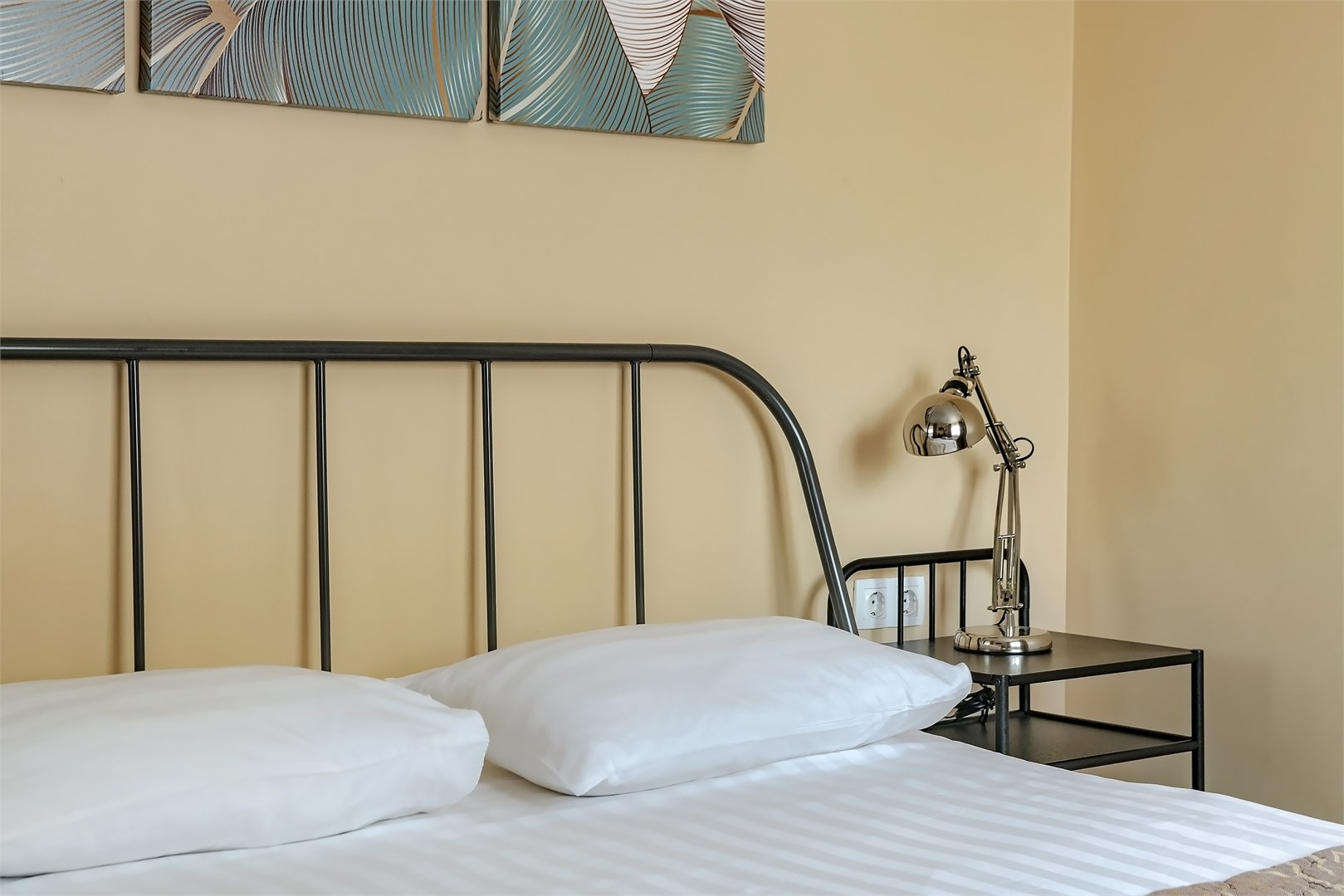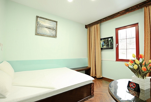 В номере: вешалка, зеркало, кровать двуспальная, стол, стулья, шкаф, кондиционер, мини-холодильник, телевизор, телефон, чайный набор посуды, электрочайник
