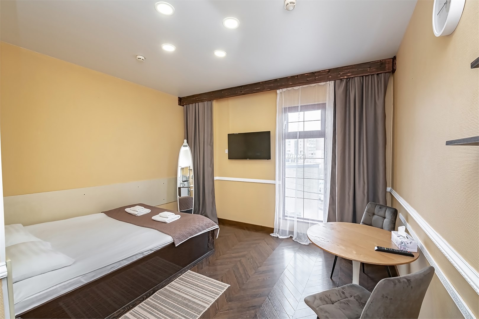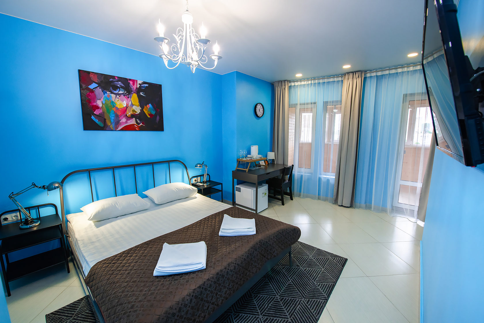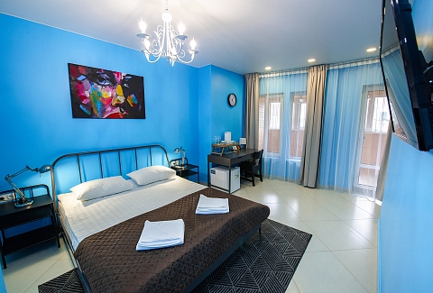 В номере: вешалка, зеркало, кровать двуспальная, прикроватная тумбочка, стол, стулья, шкаф, кондиционер, мини-холодильник, телевизор, телефон, чайный набор посуды, электрочайник