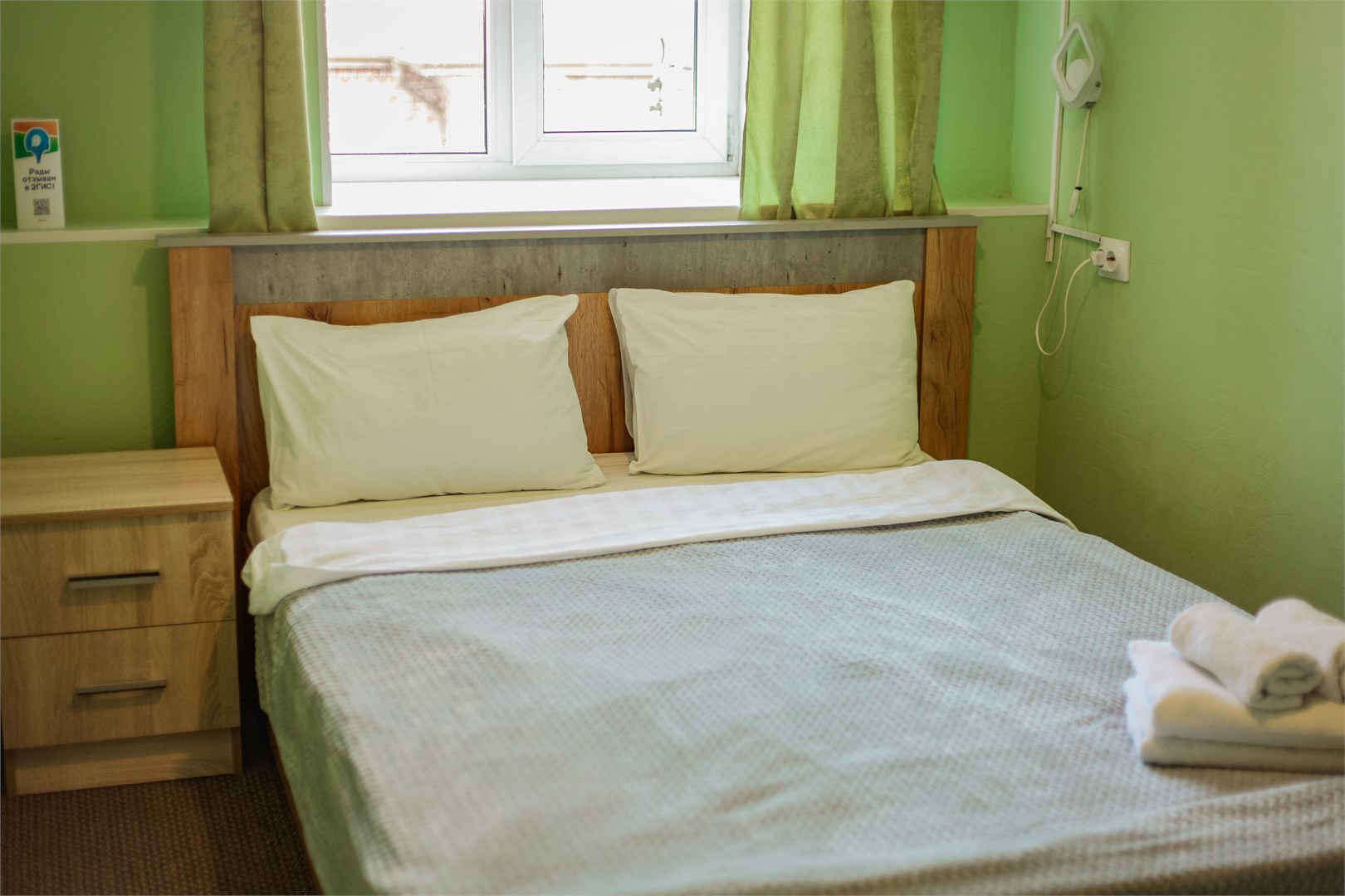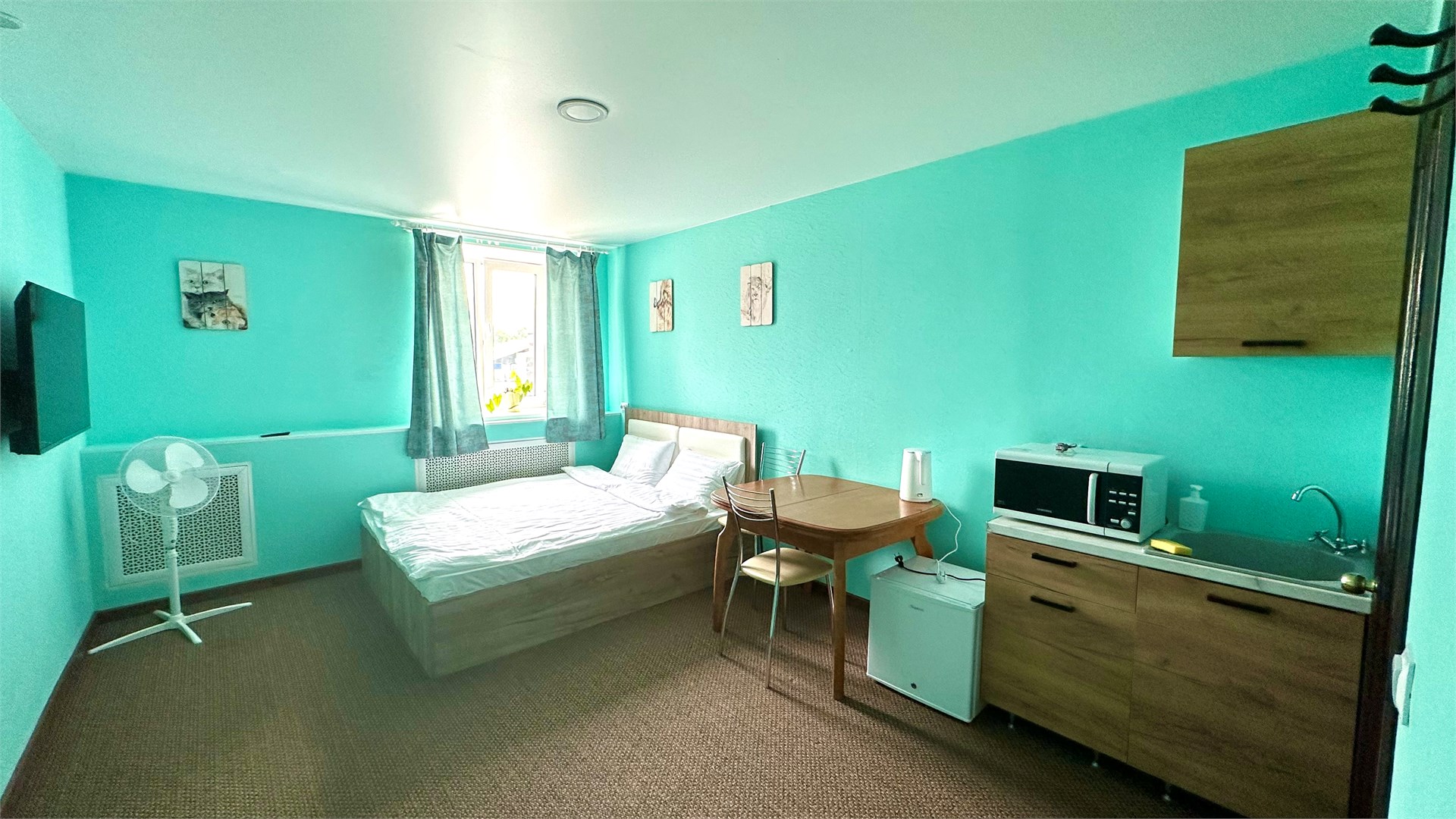 В номере: вешалка, зеркало, кровать двуспальная, прикроватные тумбочки, стол, стул, вентилятор, микроволновая печь, мини-холодильник, телевизор, утюг, чайник