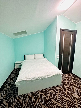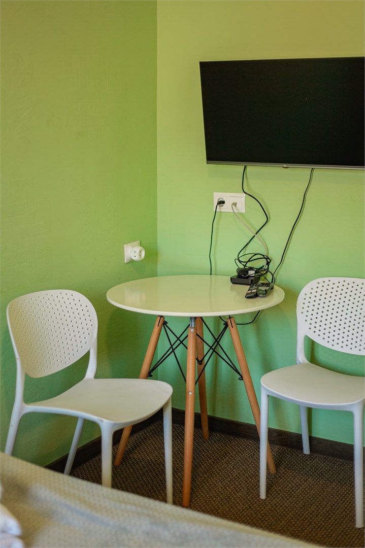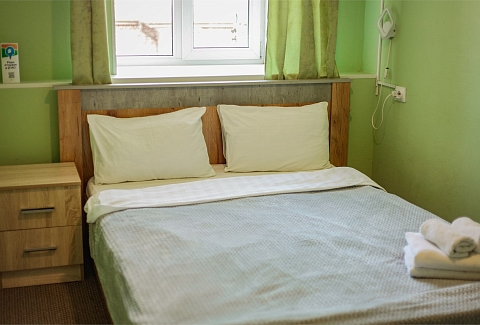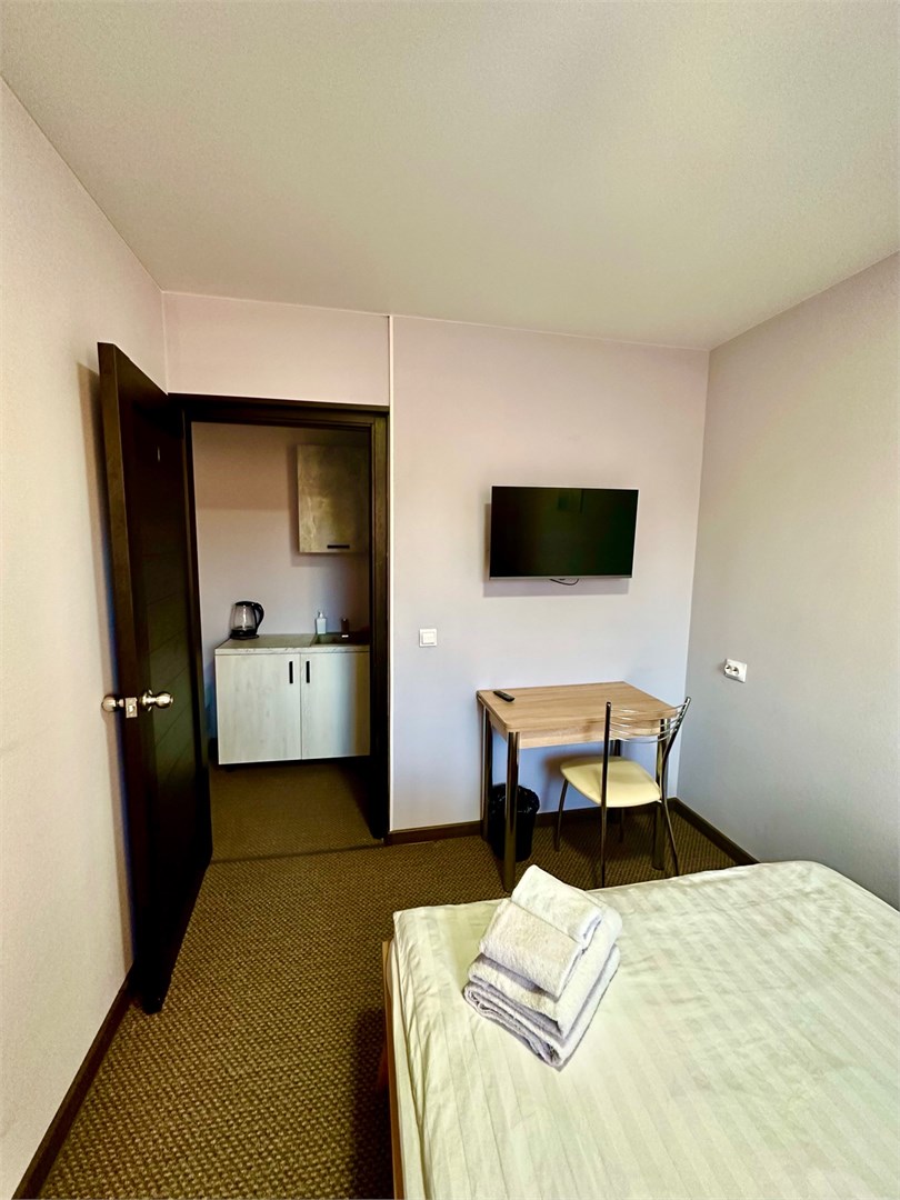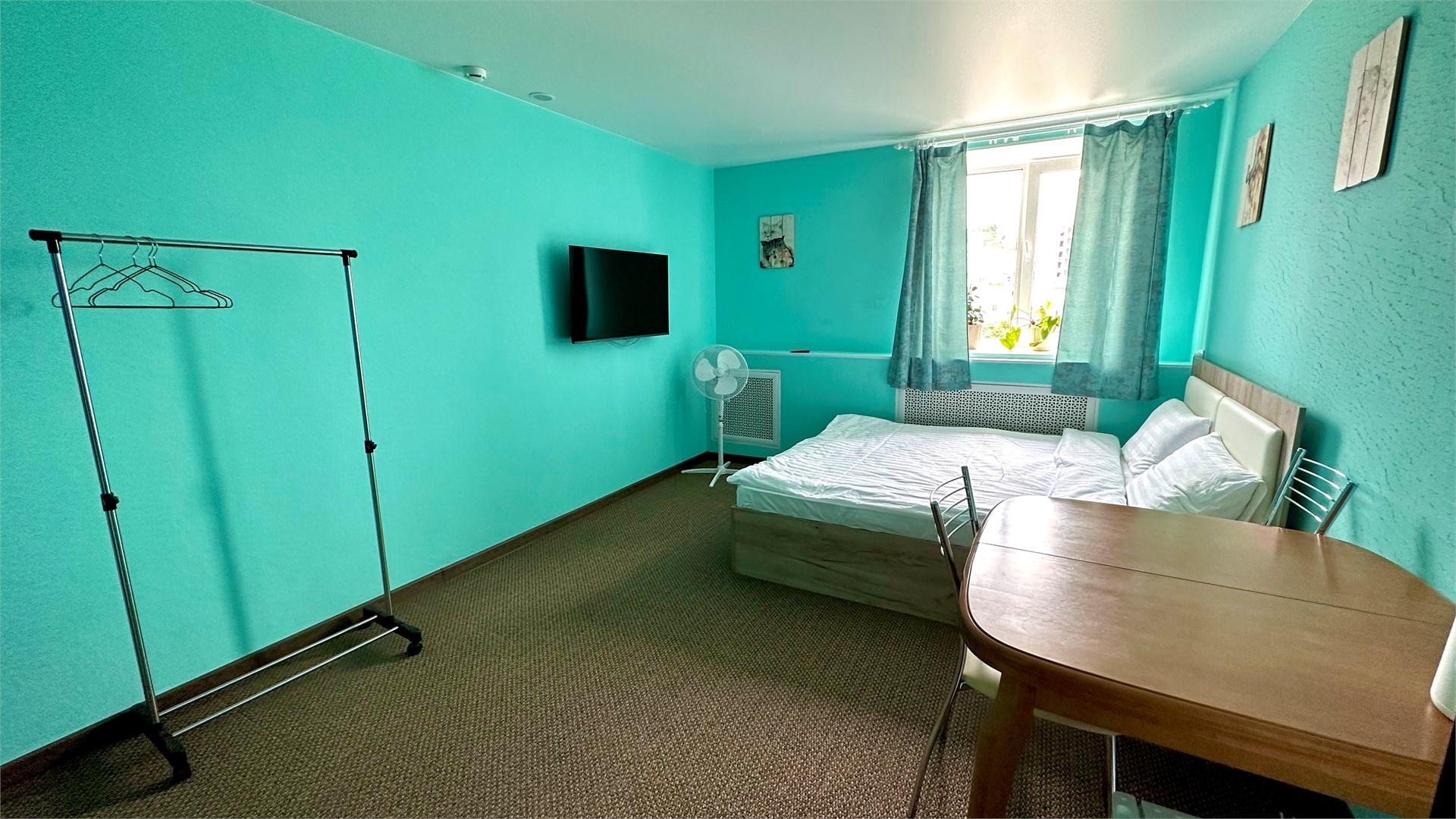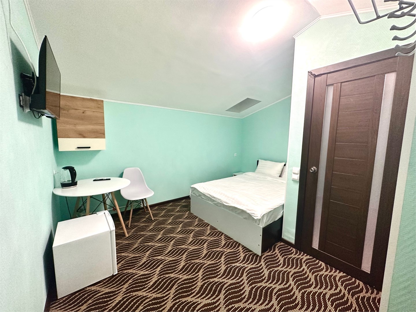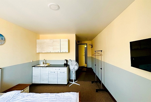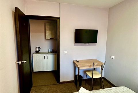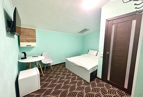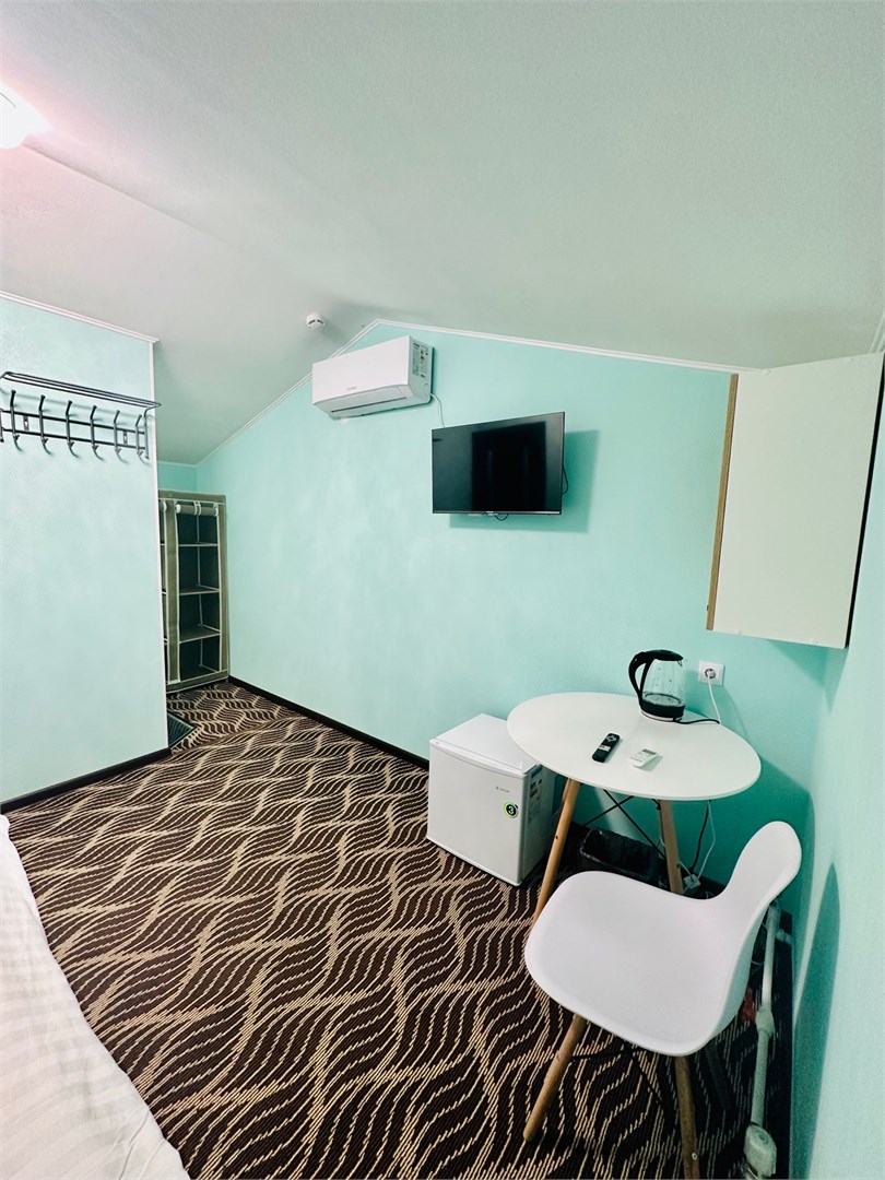 В номере: вешалка, зеркало, кровать двуспальная, прикроватные тумбочки, стол, стул, вентилятор, мини-холодильник, телевизор, утюг, чайная станция, чайник