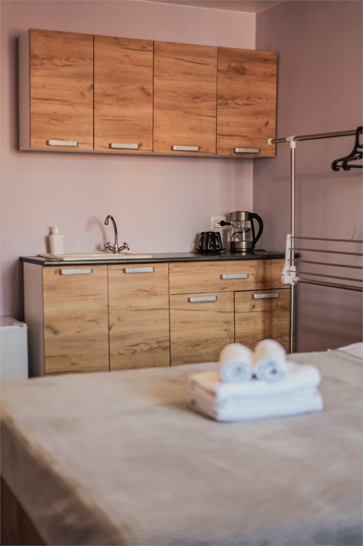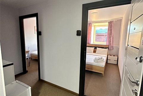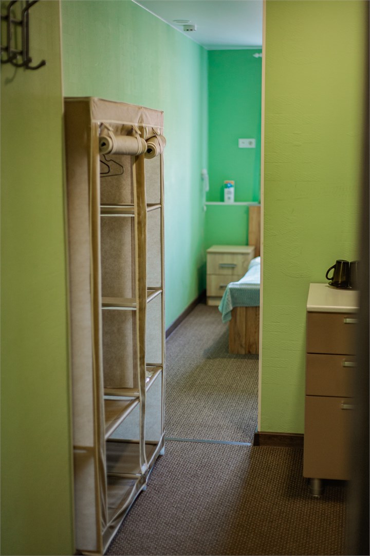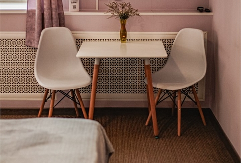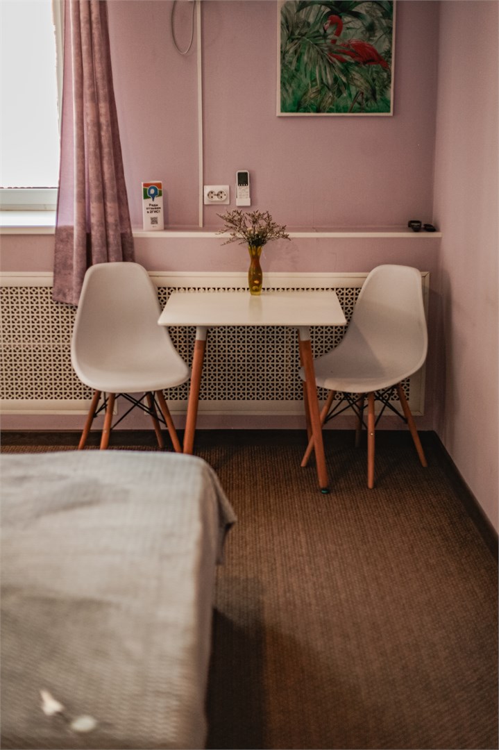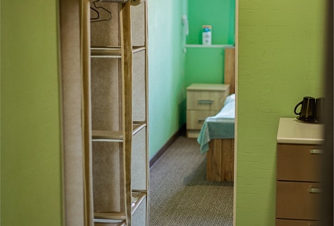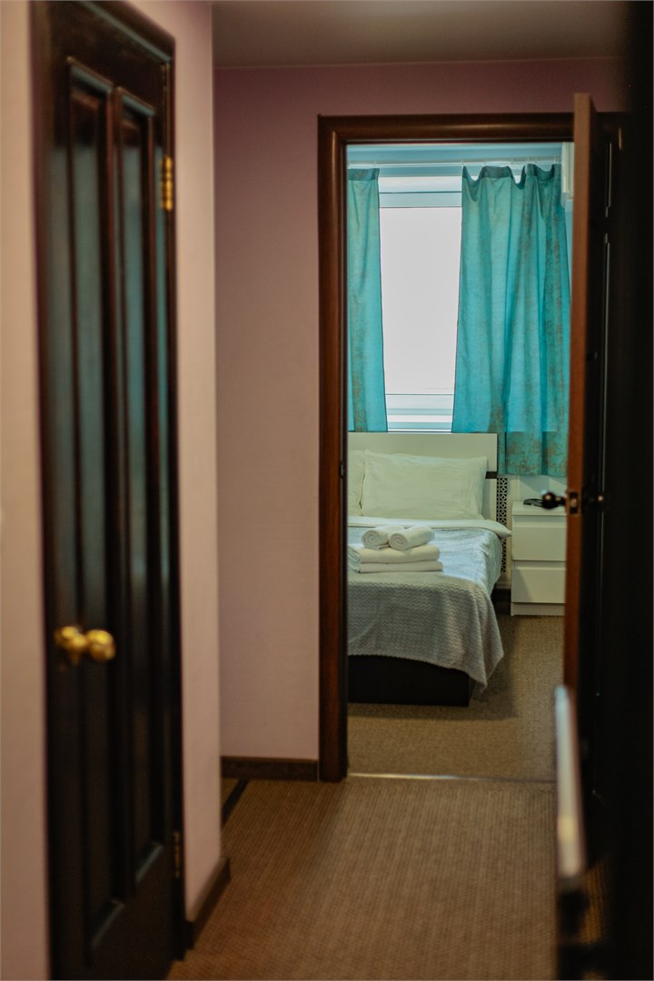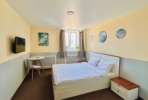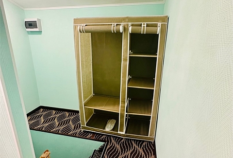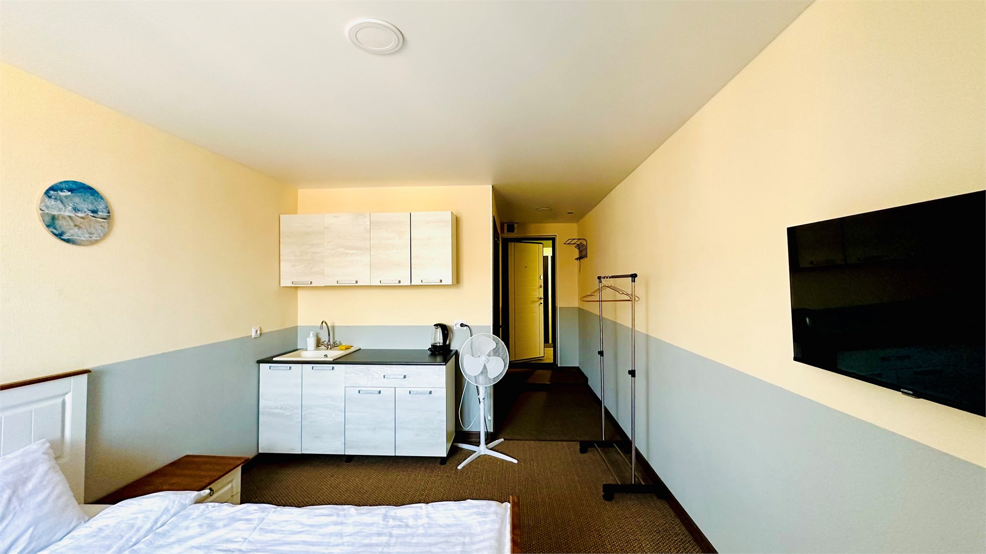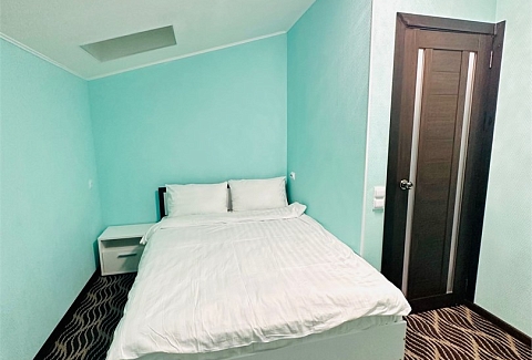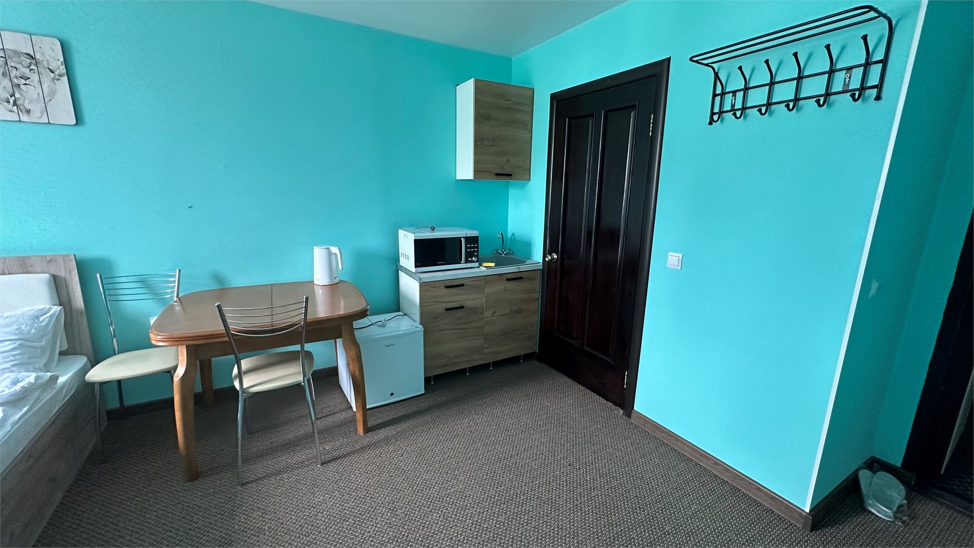 В номере: вешалка, зеркало, кровать двуспальная, прикроватные тумбочки, стол, стул, вентилятор, мини-холодильник, телевизор, утюг, чайная станция, чайник