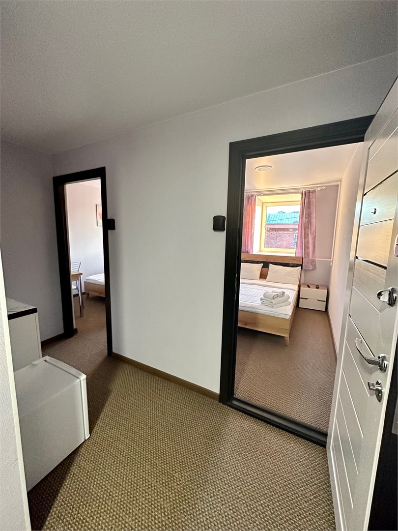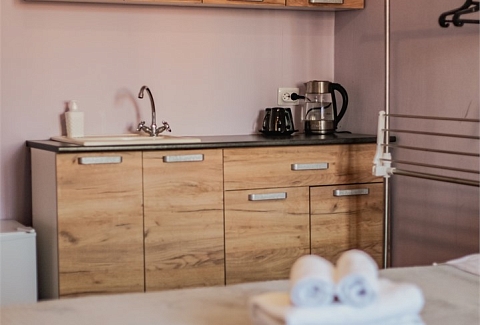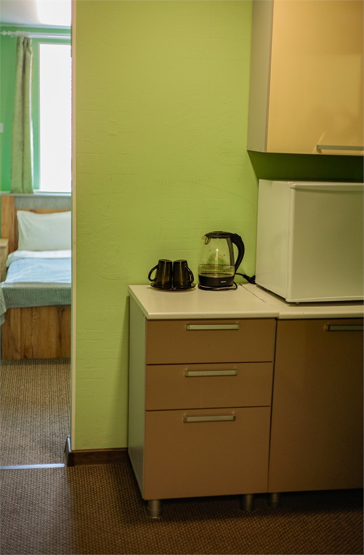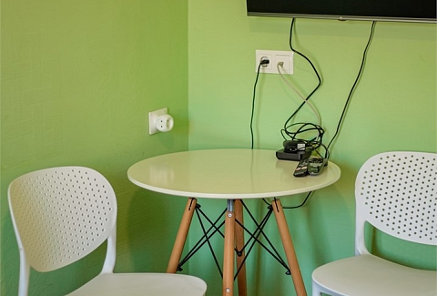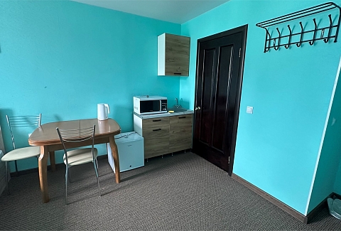 В номере: вешалка, зеркало, кровать двуспальная, кровать односпальная, прикроватные тумбочки, стол, стул, вентилятор, микроволновая печь, мини-холодильник, набор посуды, телевизор, утюг, чайная станция, чайник
