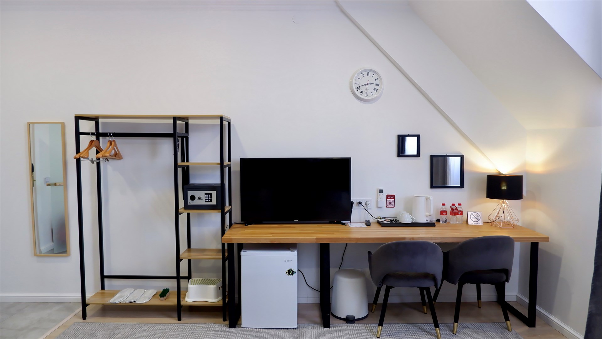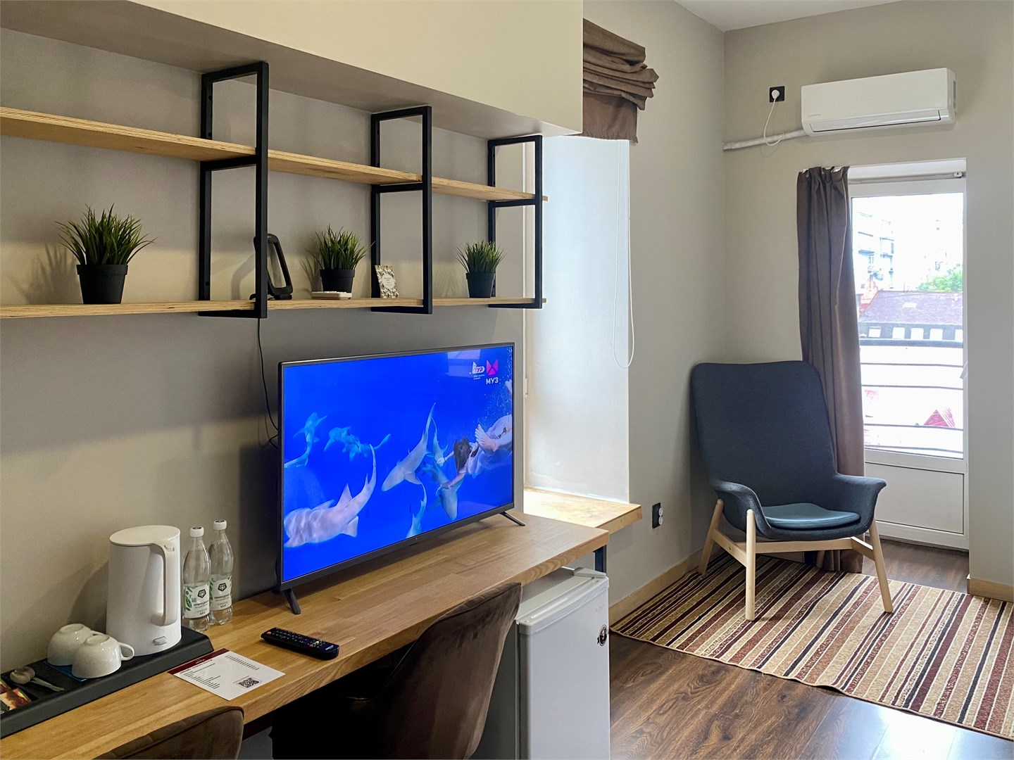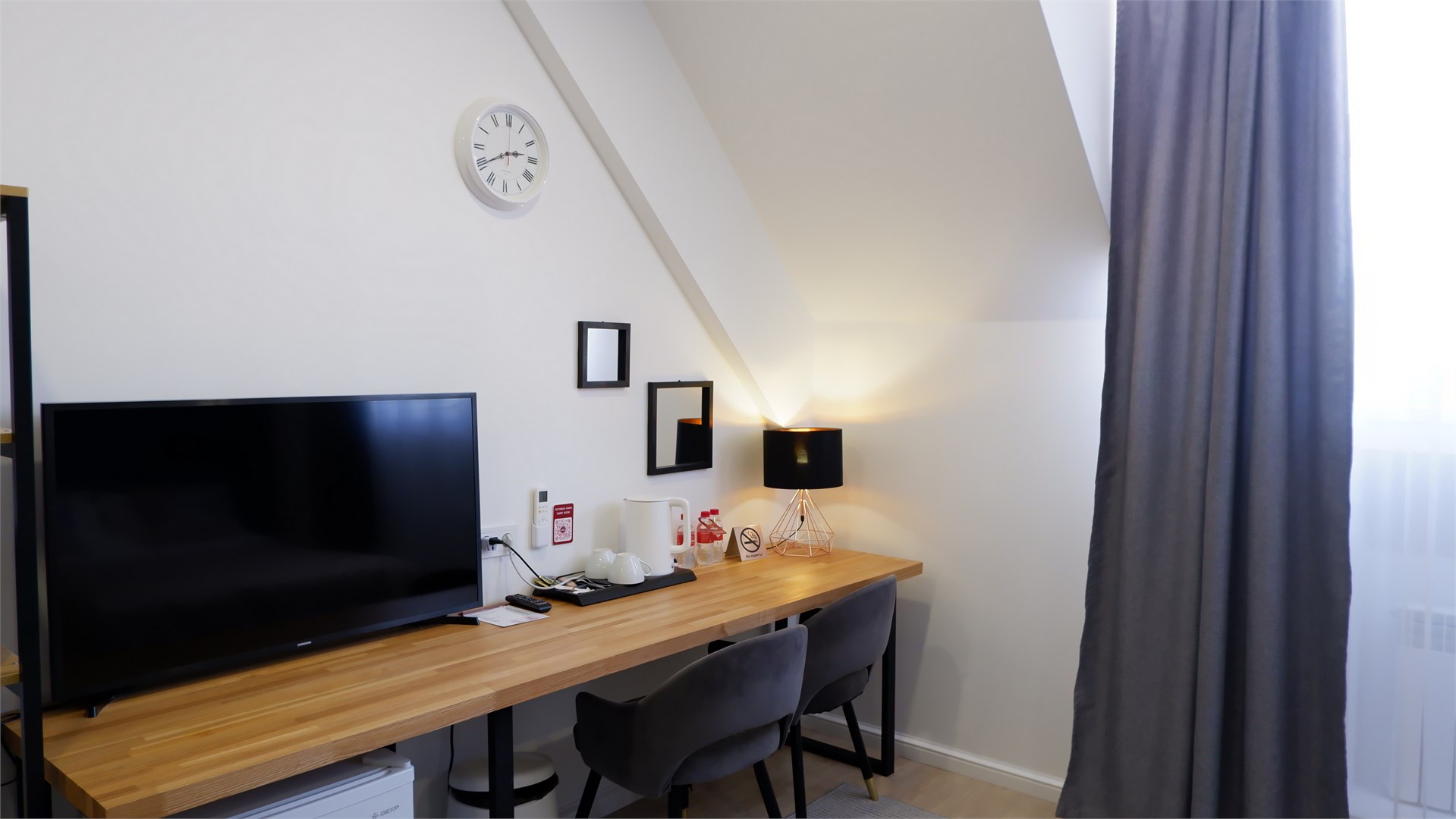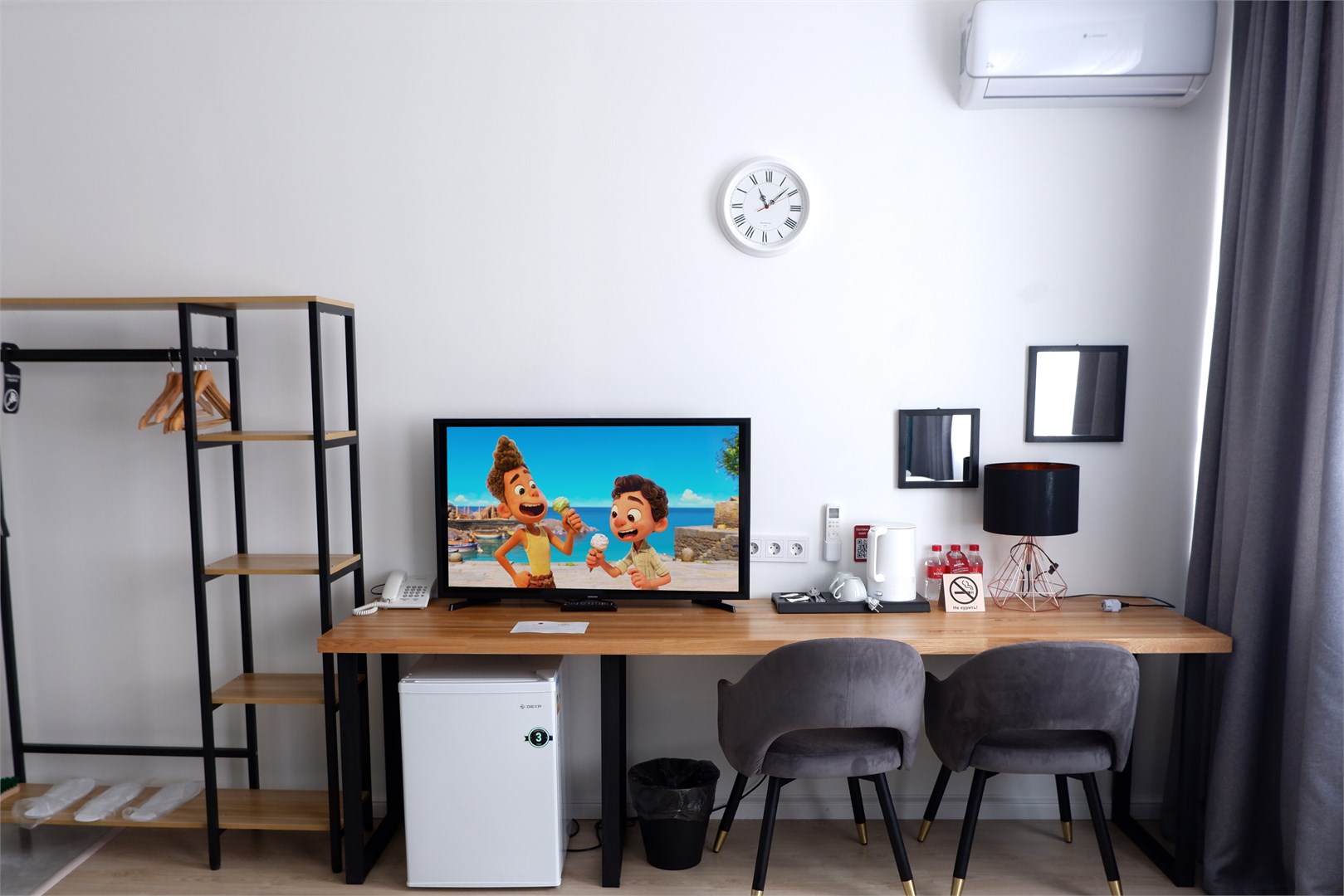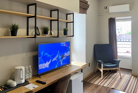 В номере: кровать двуспальная, прикроватные тумбочки, стол, стулья, шкаф, кондиционер, мини-холодильник, телевизор, чайная станция