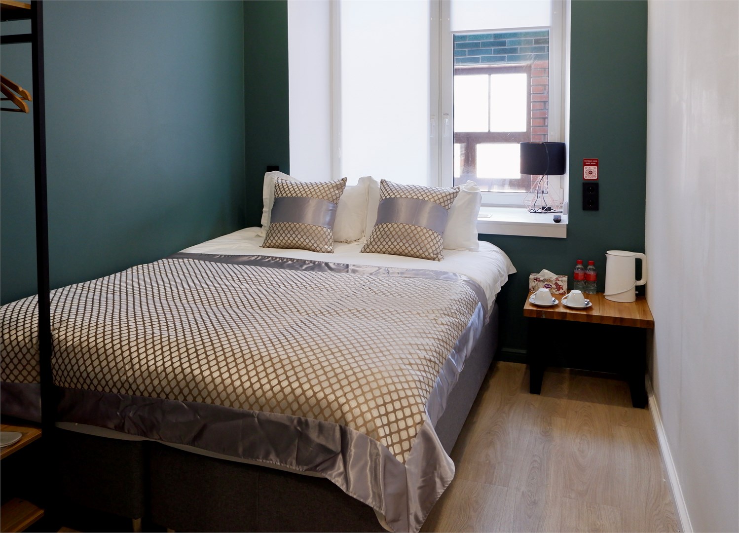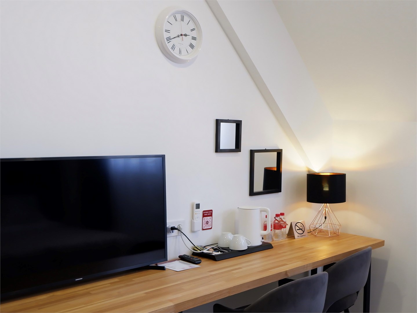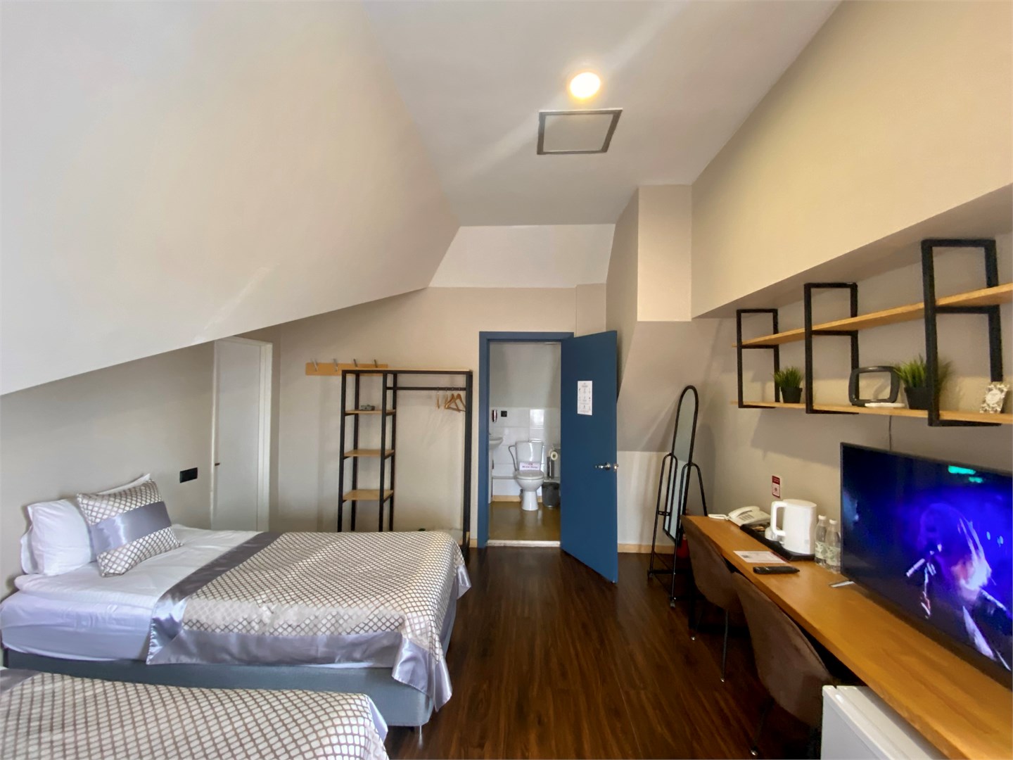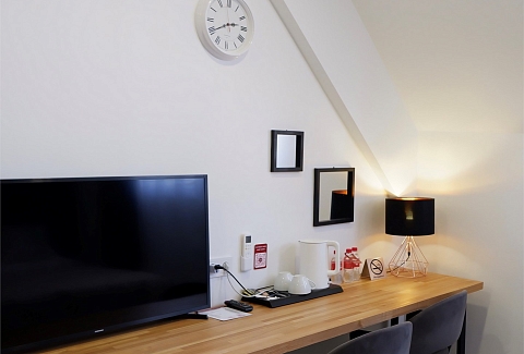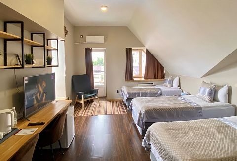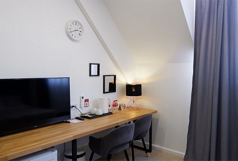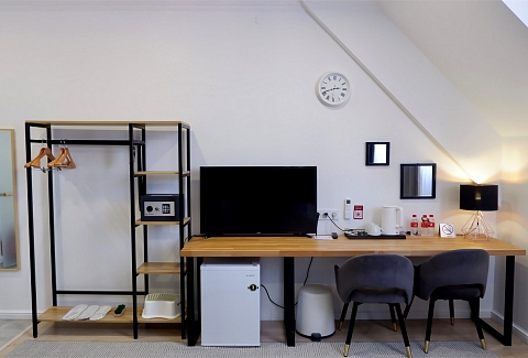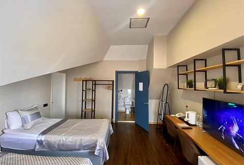 В номере: кровать двуспальная, прикроватные тумбочки, стол, стулья, шкаф, кондиционер, мини-холодильник, телевизор, чайная станция