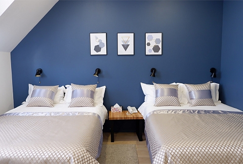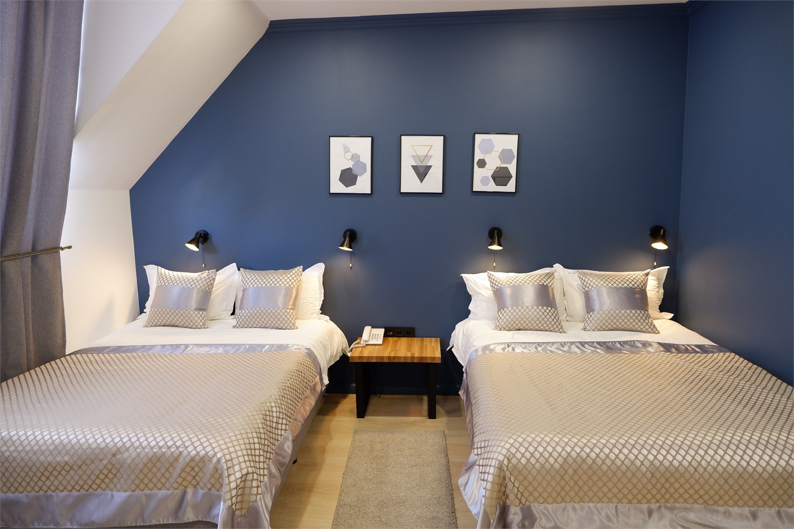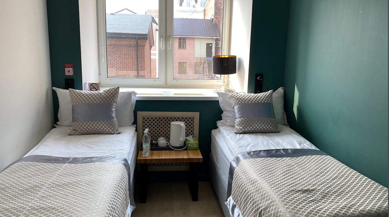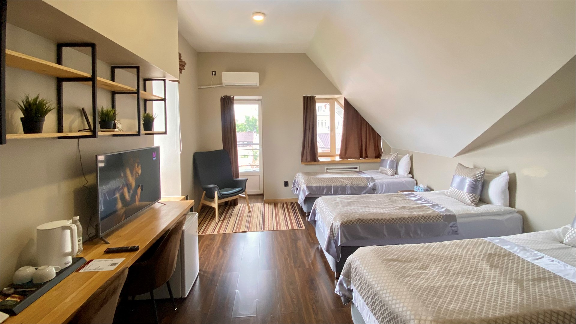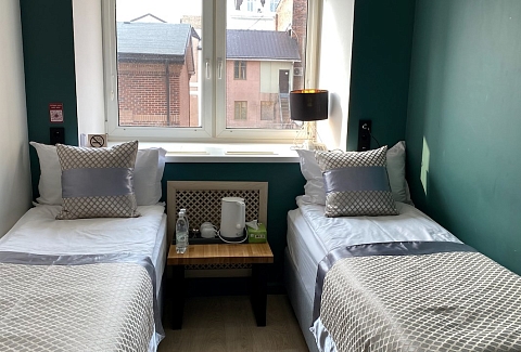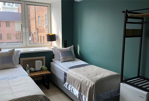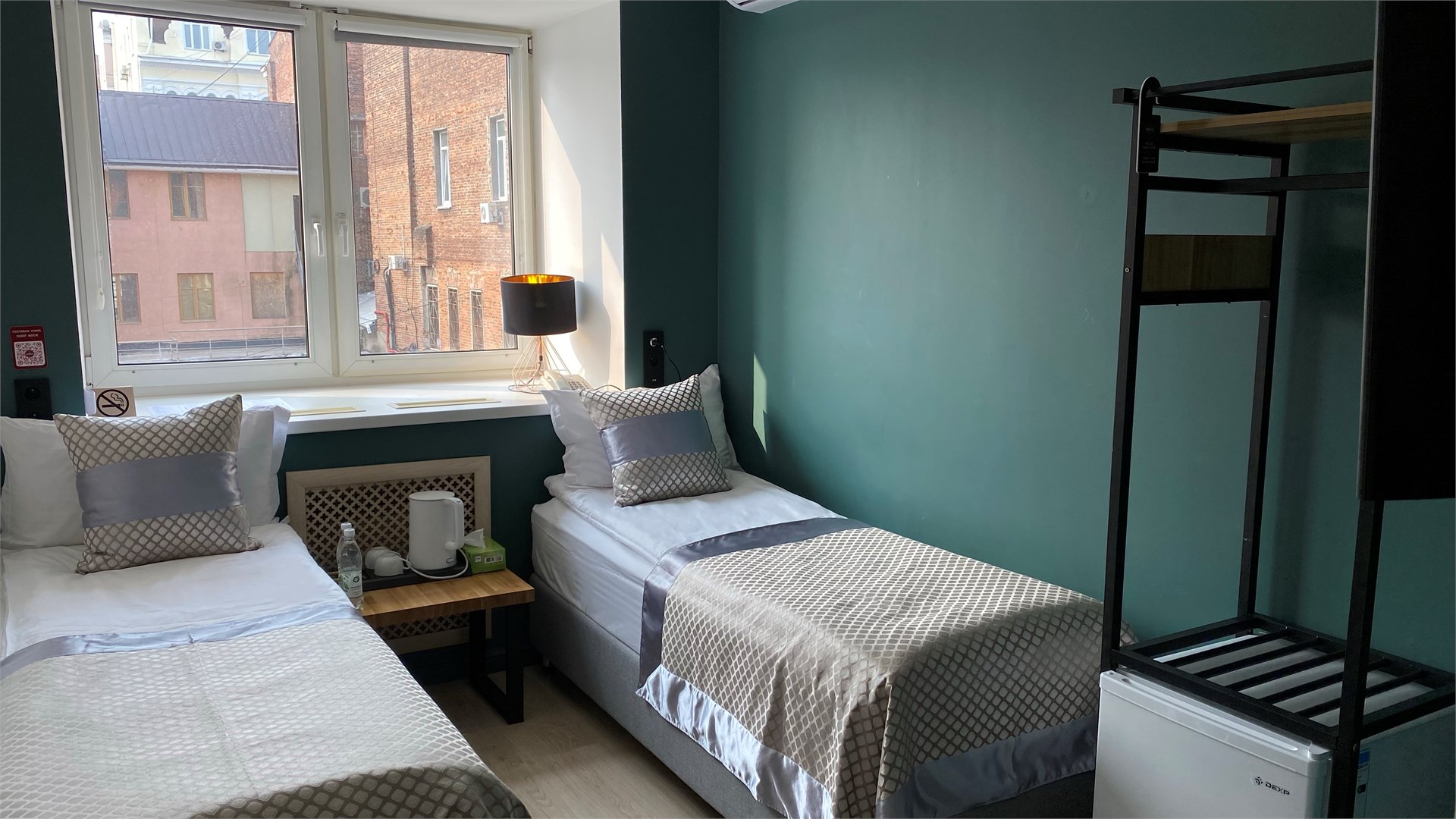 В номере: кровати односпальные, прикроватные тумбочки, стол, стулья, шкаф, кондиционер, телевизор