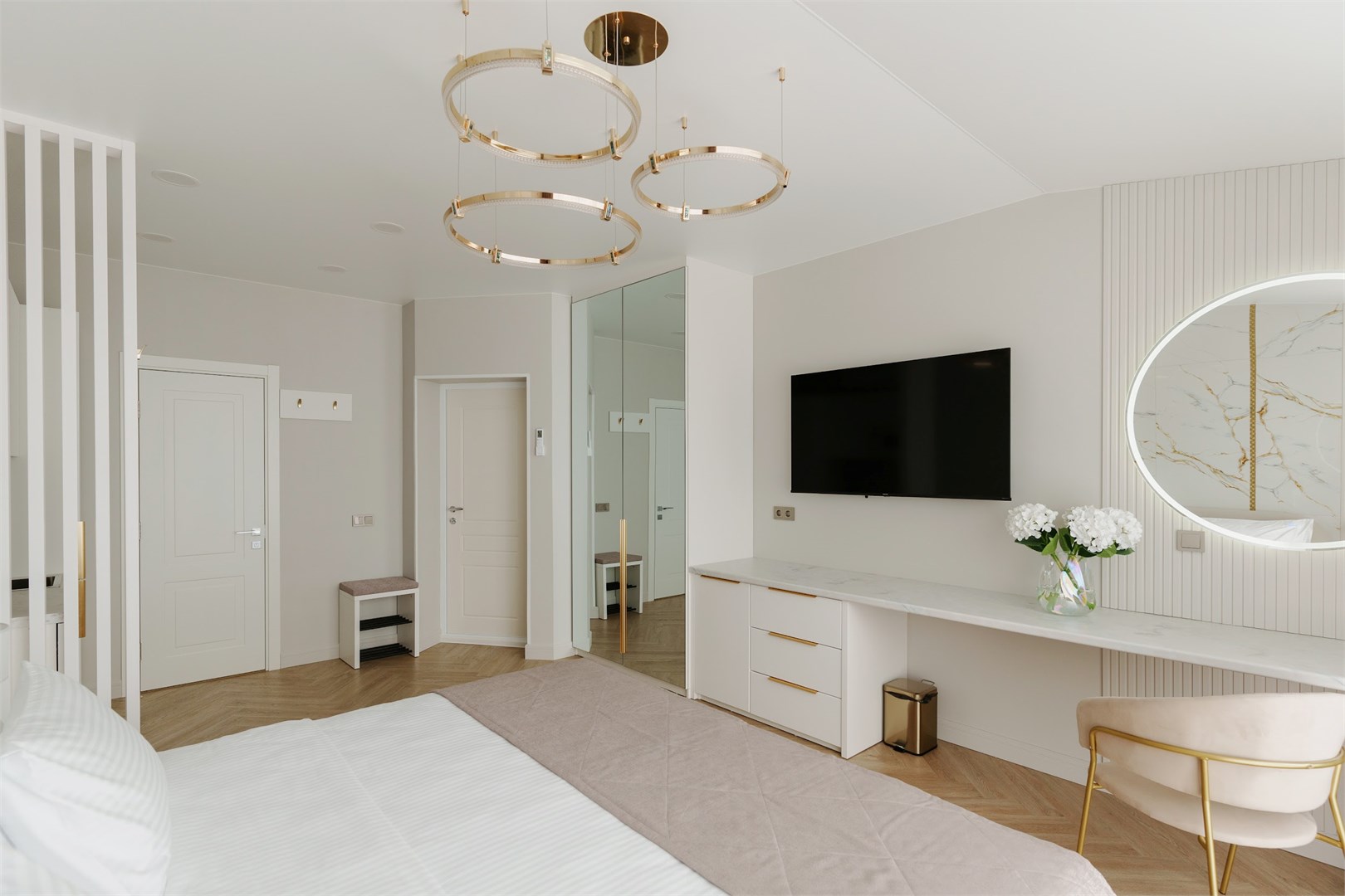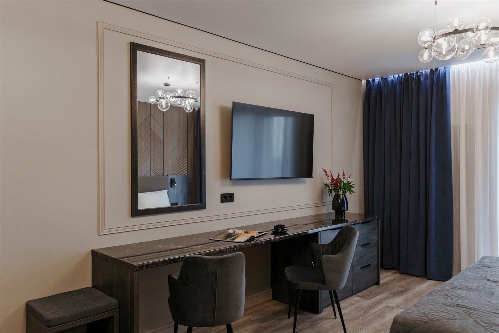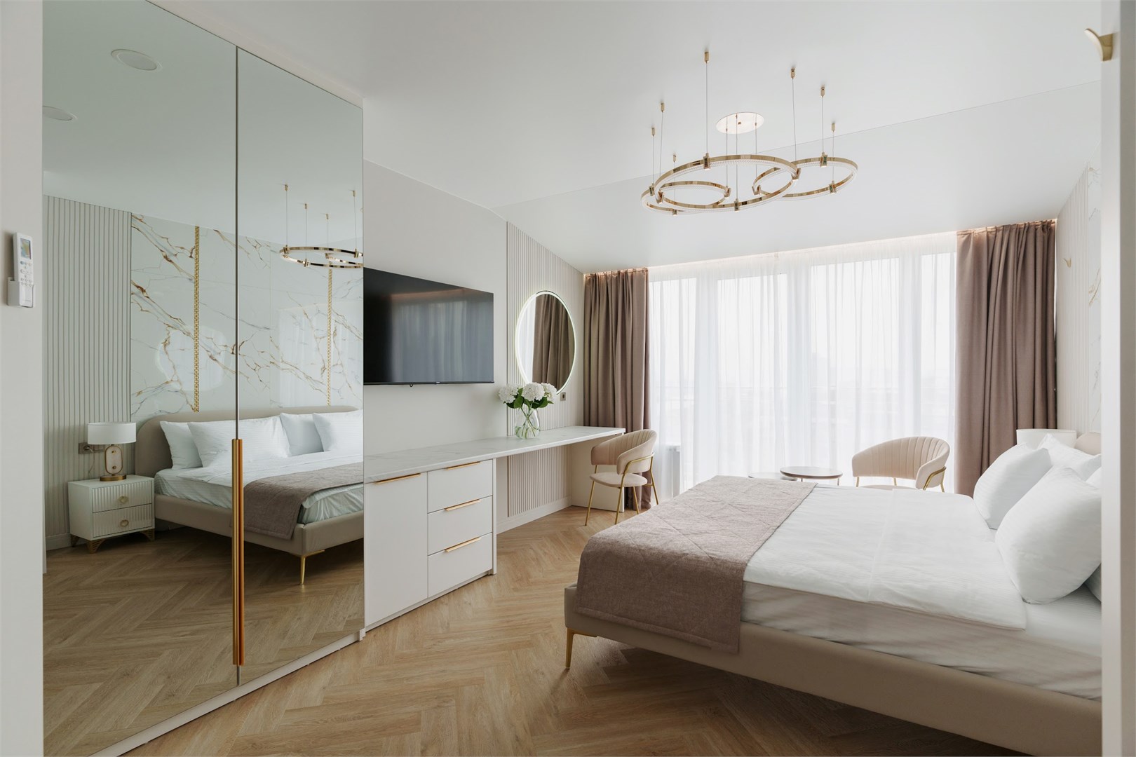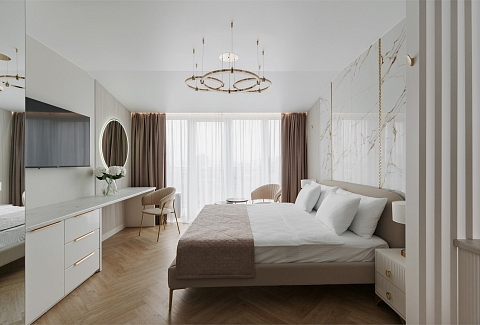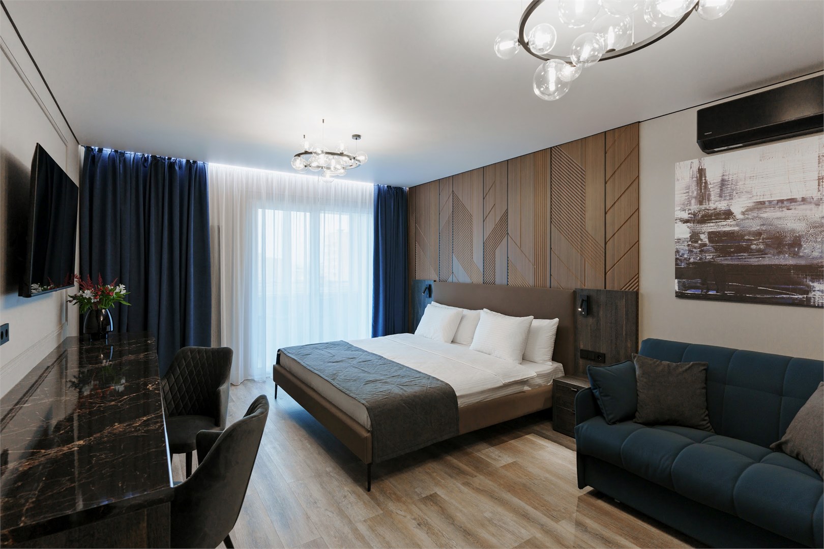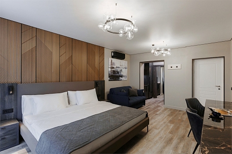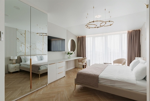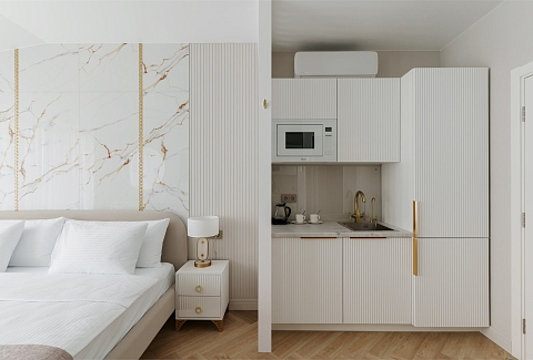 В номере: вешалка, зеркало, кровать двуспальная, прикроватные тумбочки, стол, стулья, шкаф, кондиционер, микроволновая печь, набор посуды, телевизор, холодильник, электрочайник