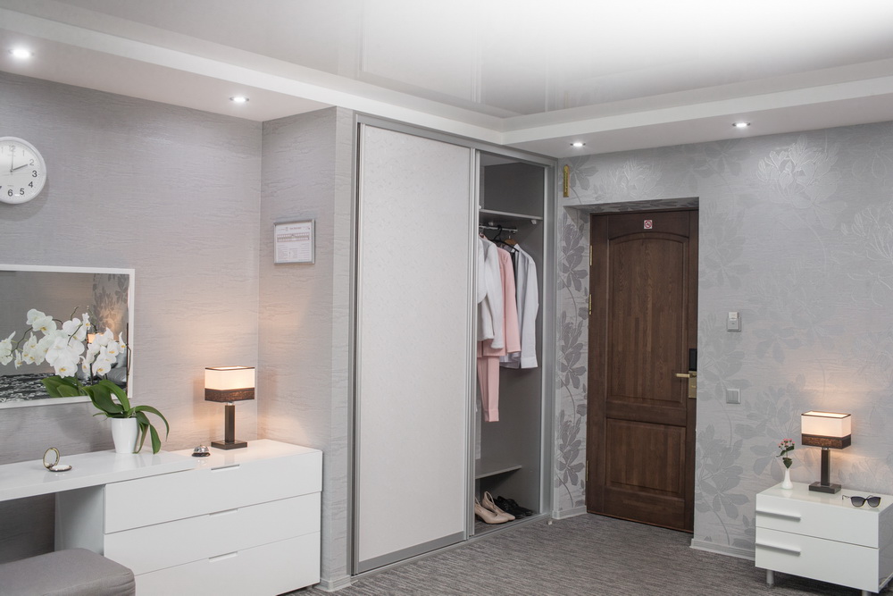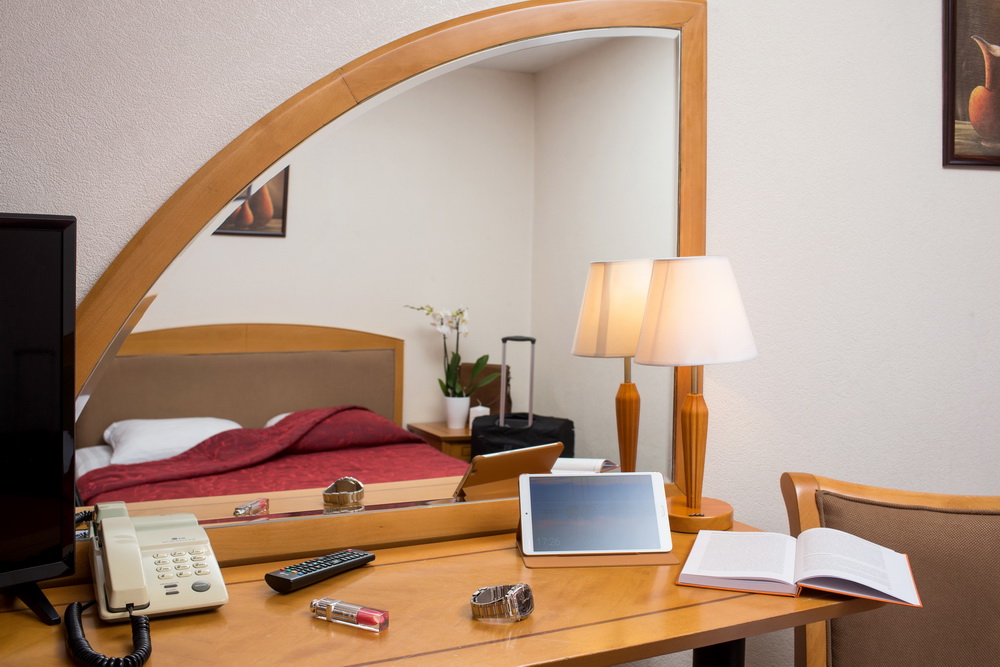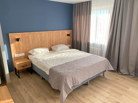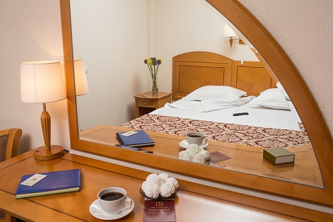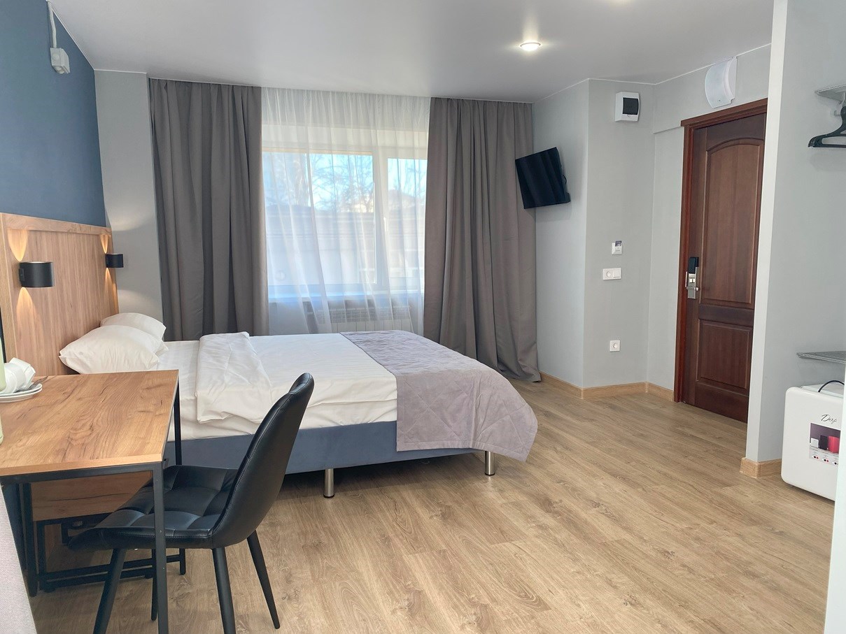 В номере: вешалка, зеркало, кровать двуспальная, прикроватные тумбочки, стол, стул, шкаф, телевизор, холодильник, чайная станция