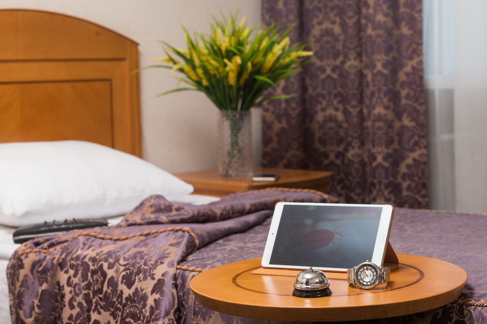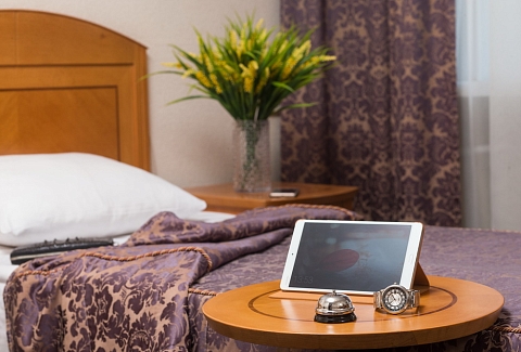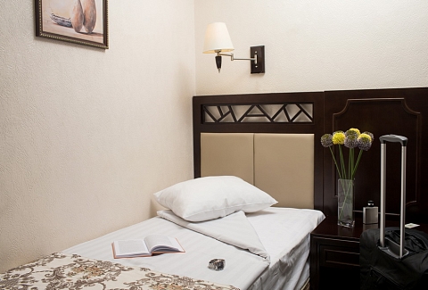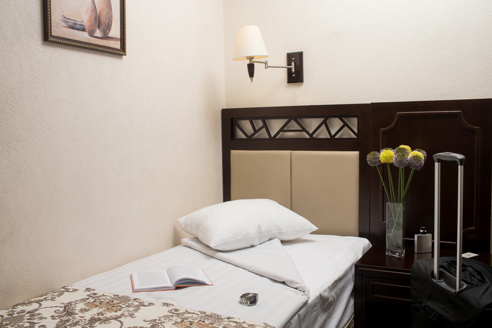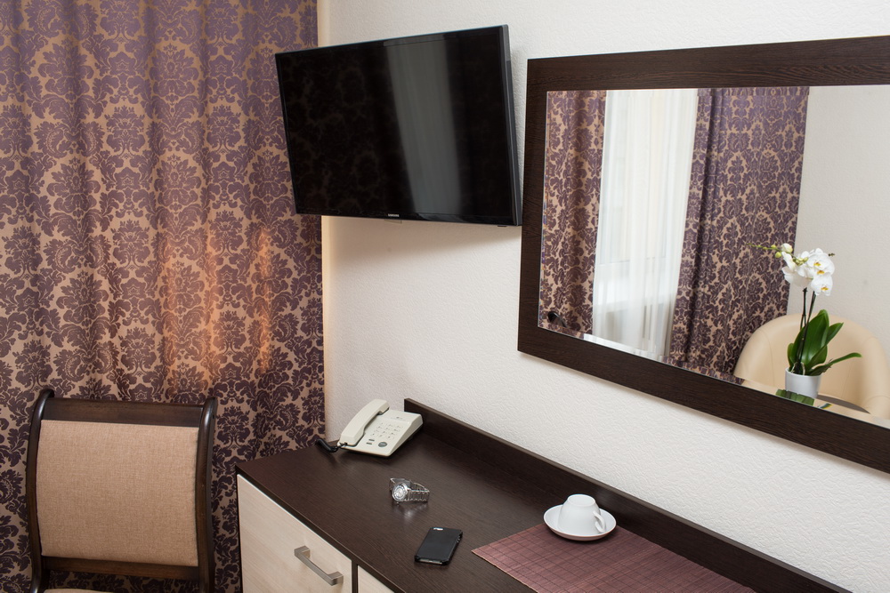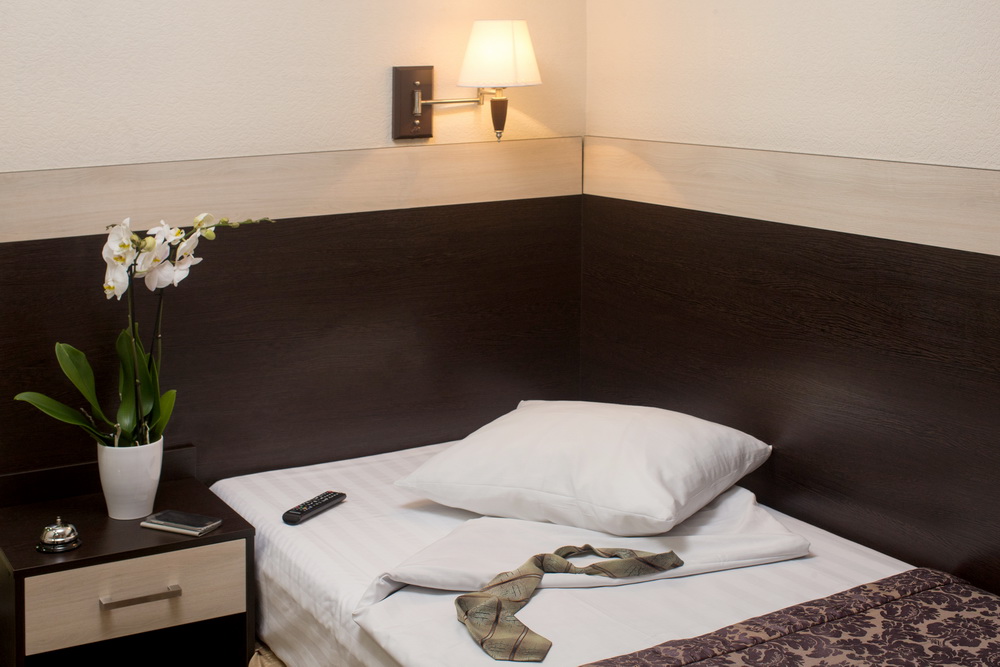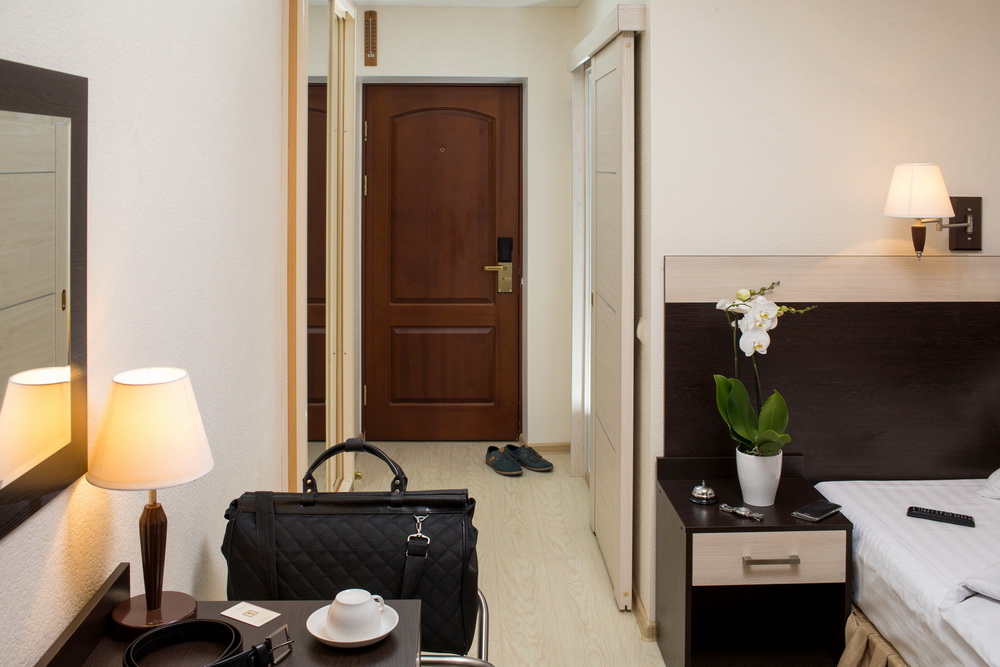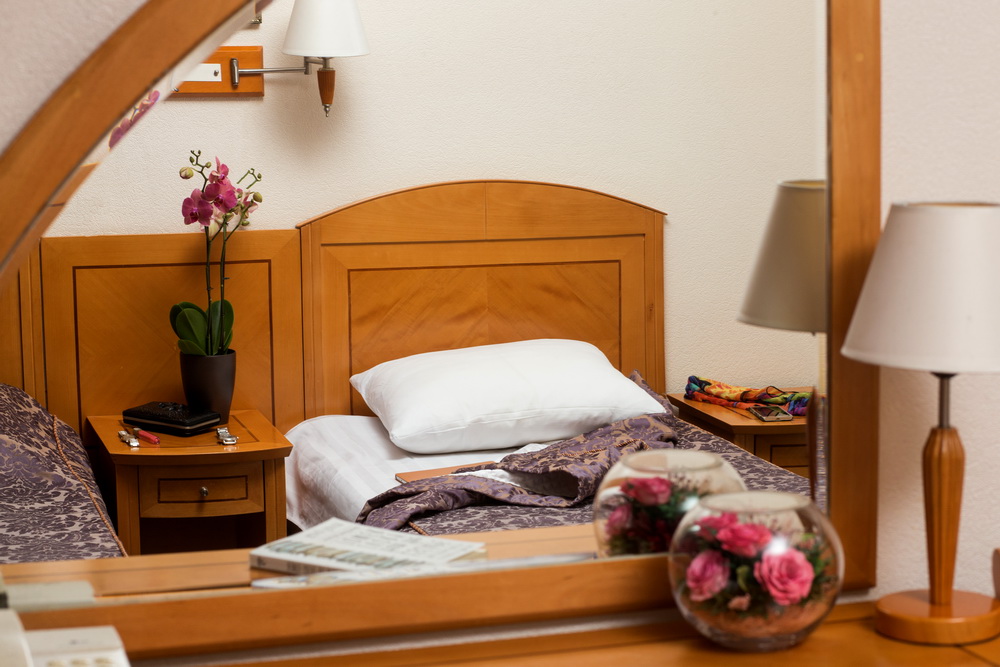 В номере: вешалка, зеркало, кровать односпальная, прикроватные тумбочки, стол, стул, шкаф, телевизор, холодильник, чайная станция