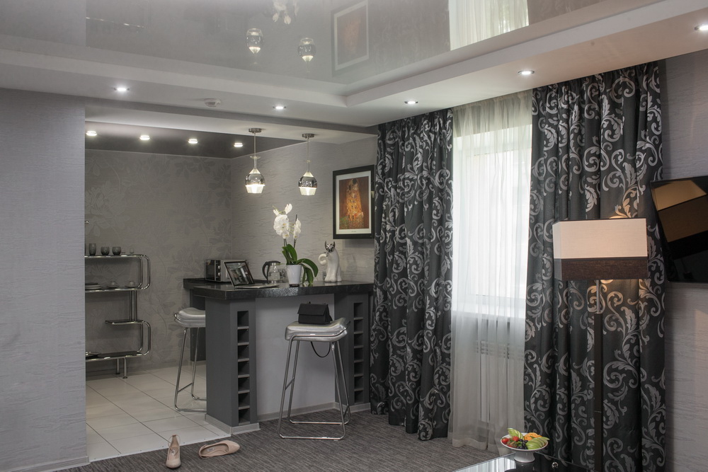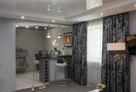 Жилой фонд состоит из однокомнатных и двухкомнатных номеров, оформленных в пастельных тонах. В номерах обустроены рабочие зоны и зона для отдыха, везде имеется собственный санузел, плазменный телевизор, кондиционер, фен, холодильник. В номерах-студиях есть мини-кухня, оборудованная бытовой техникой.На первом этаже отеля открыт круглосуточный ресторан «Пицца-М», как в номерах, так и в общих зонах доступен беспроводной интернет.
