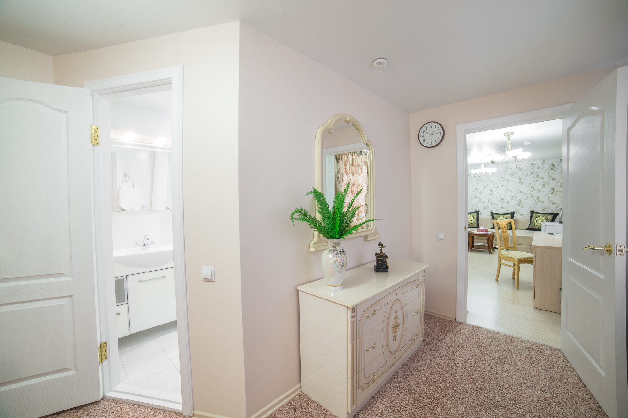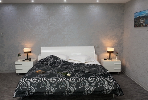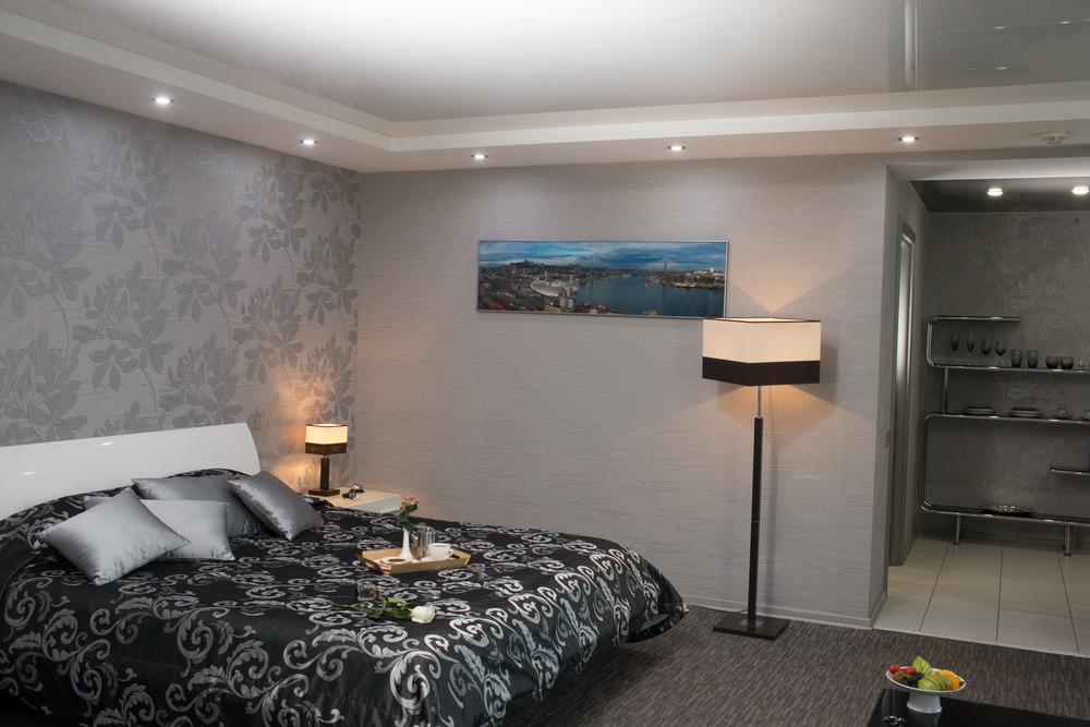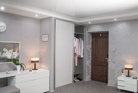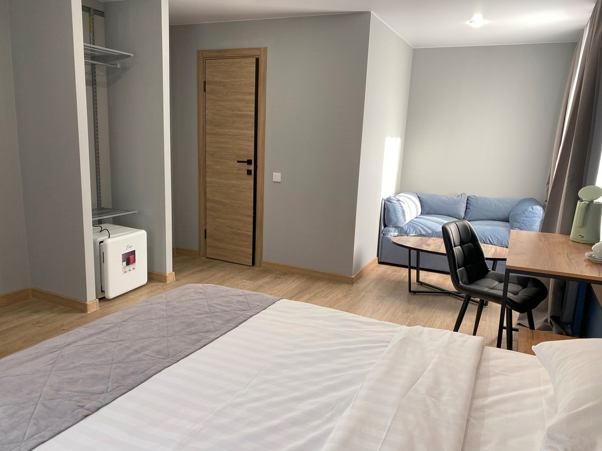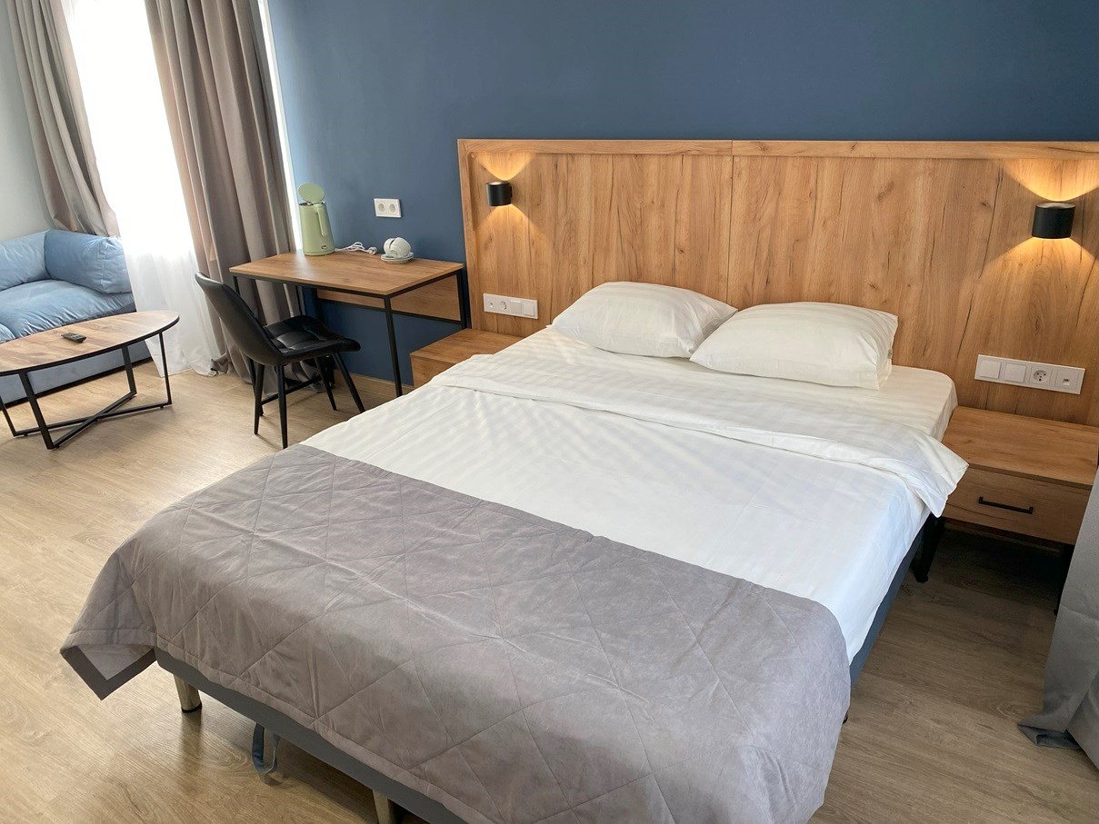 В номере: вешалка, диван, зеркало, кровать двуспальная, прикроватные тумбочки, стол, стул, шкаф, кондиционер, телевизор, холодильник, чайная станция