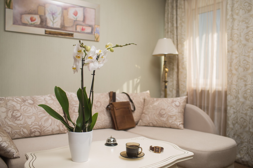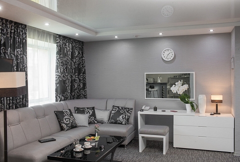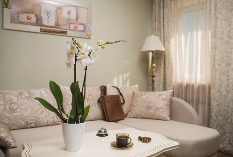В номере: диван, кровать двуспальная, прикроватные тумбочки, стол, стулья, шкаф, кондиционер, мини-холодильник, телевизор, чайная станция
