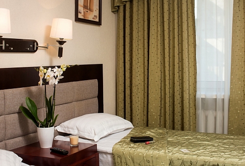 В номере: вешалка, зеркало, кровати односпальные, прикроватные тумбочки, стол, стул, шкаф, телевизор, холодильник