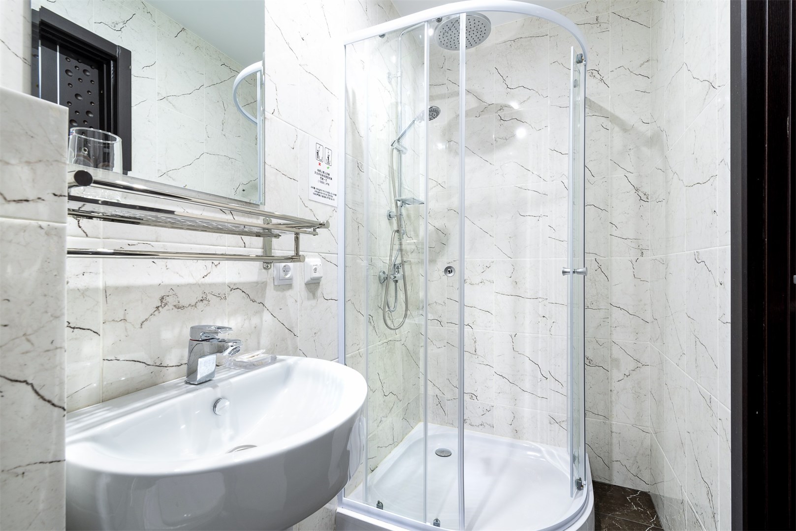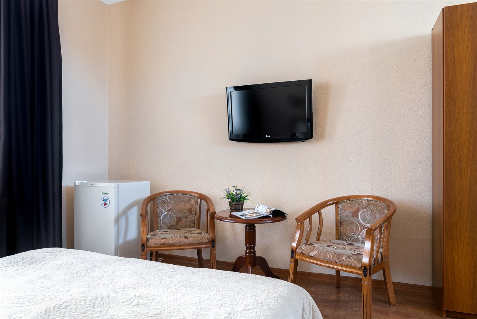 В номере: вешалка, зеркало, кровать односпальная, прикроватные тумбочки, стол, стулья, шкаф, гладильная доска, индивидуальная система обогрева, кондиционер, мини-холодильник, телевизор, телефон, утюг, чайный набор посуды, электрочайник