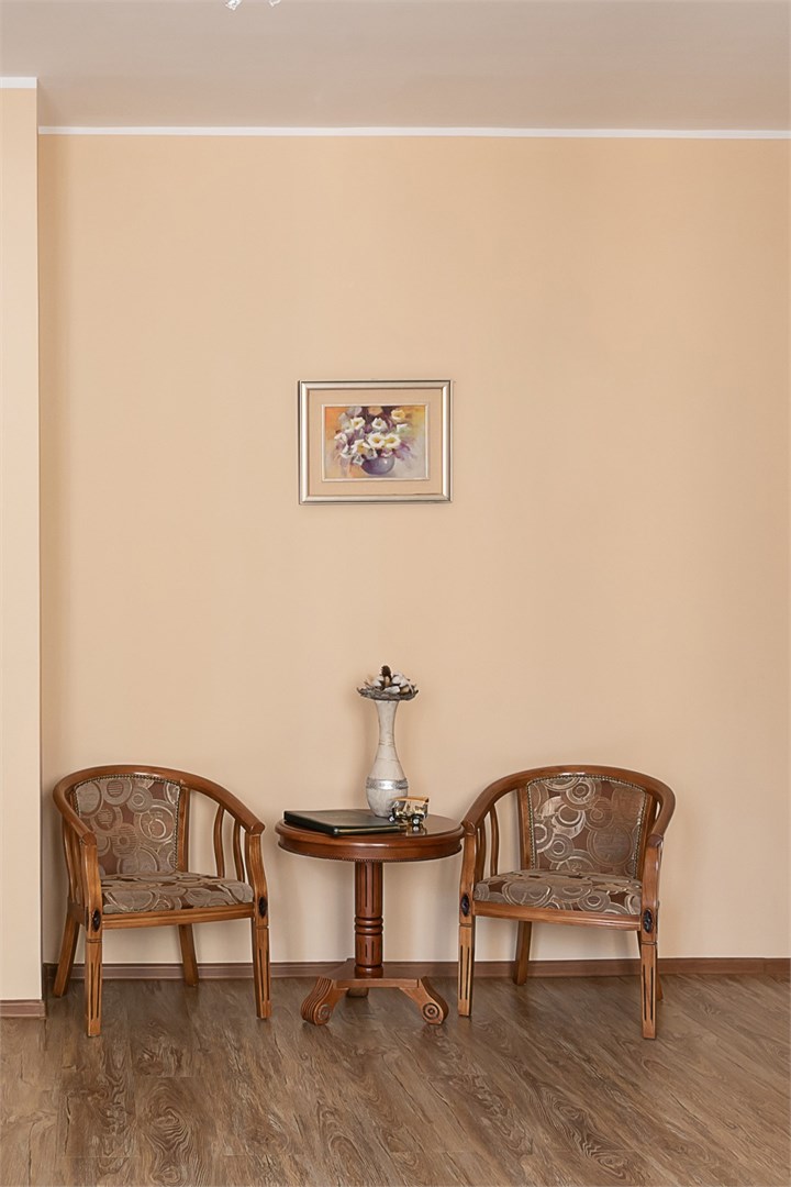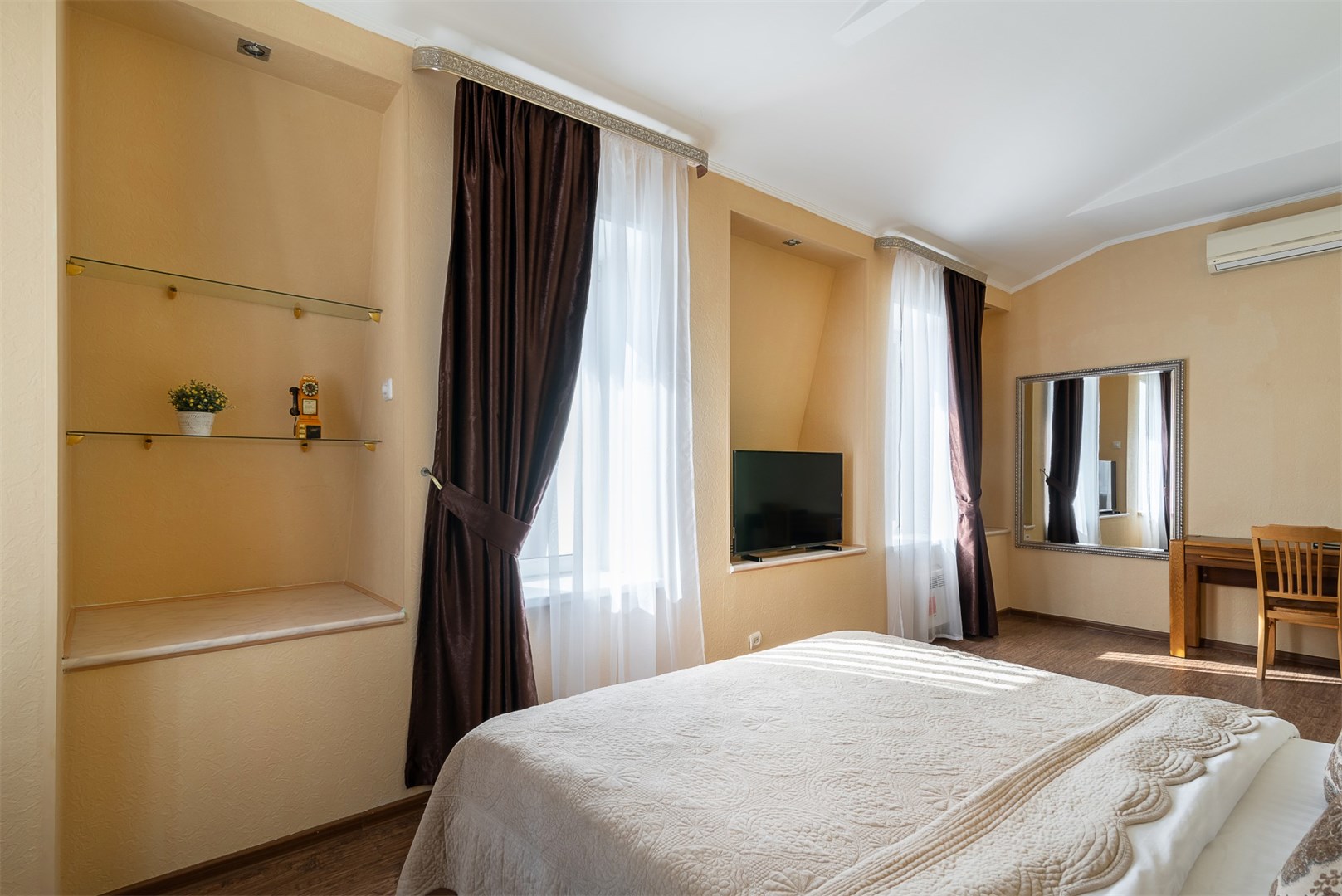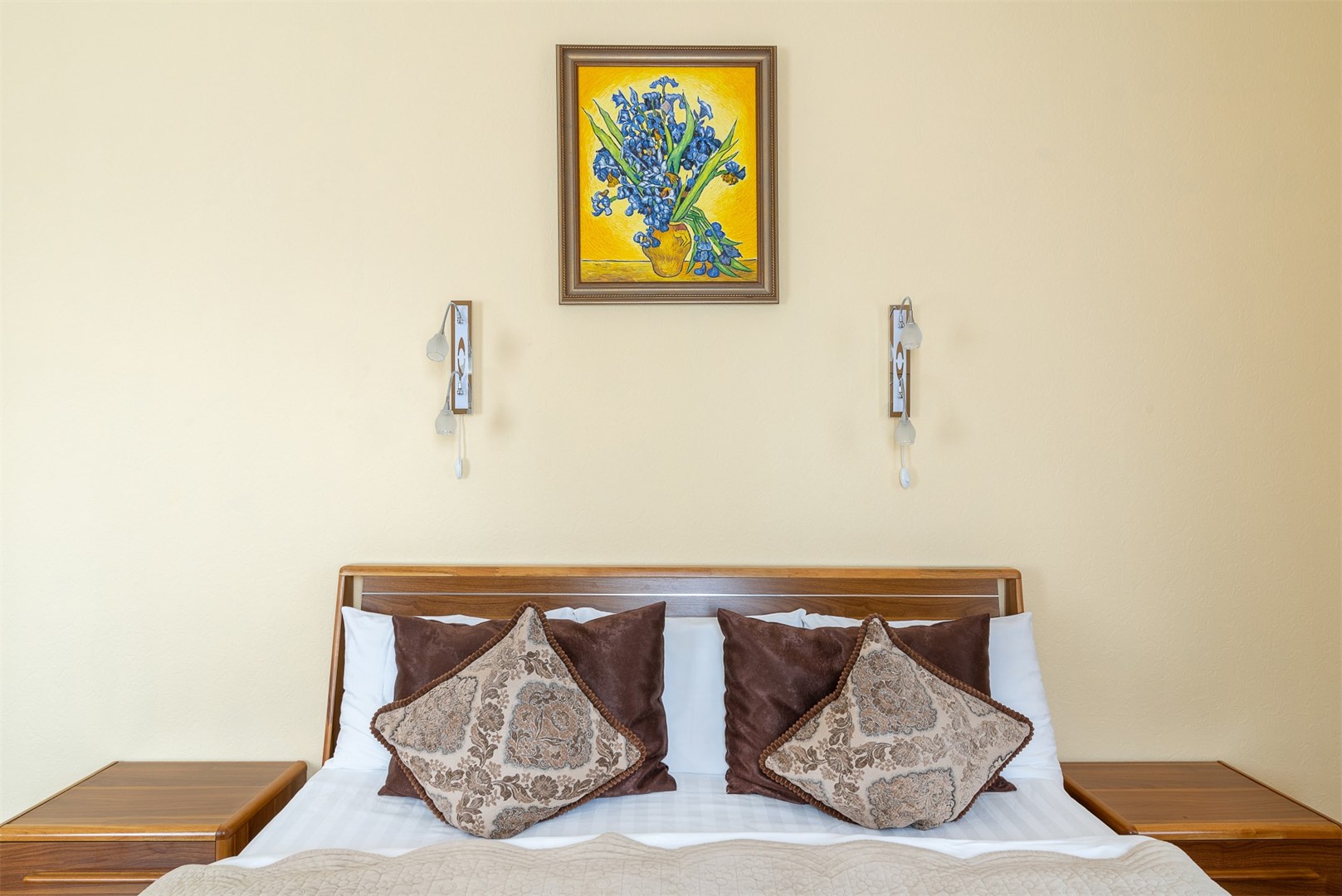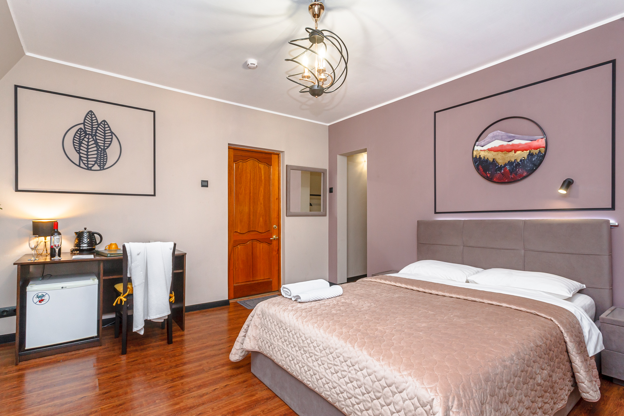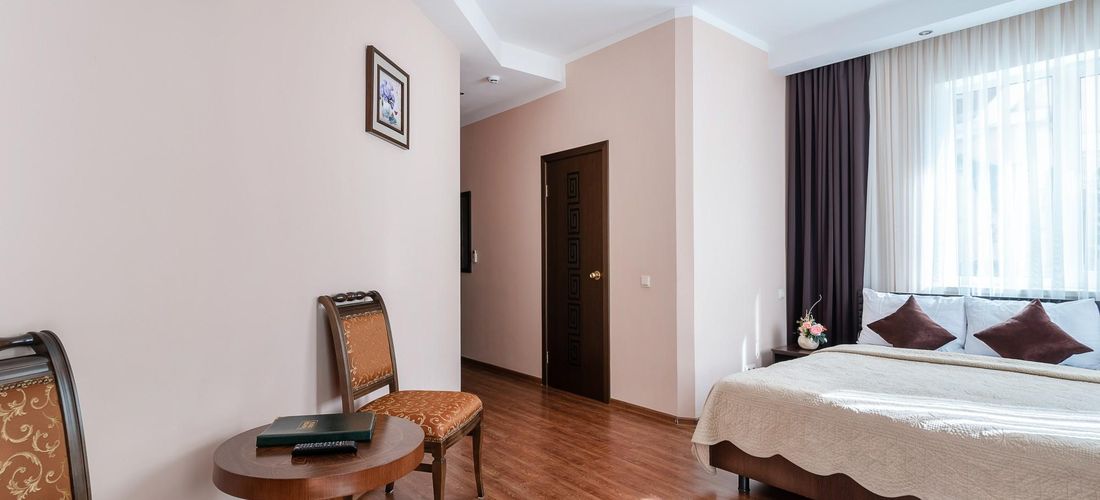 В номере: вешалка, зеркало, кровать двуспальная, прикроватные тумбочки, стол, стулья, шкаф, гладильная доска, индивидуальная система обогрева, кондиционер, мини-холодильник, телевизор, телефон, утюг, чайный набор посуды, электрочайник