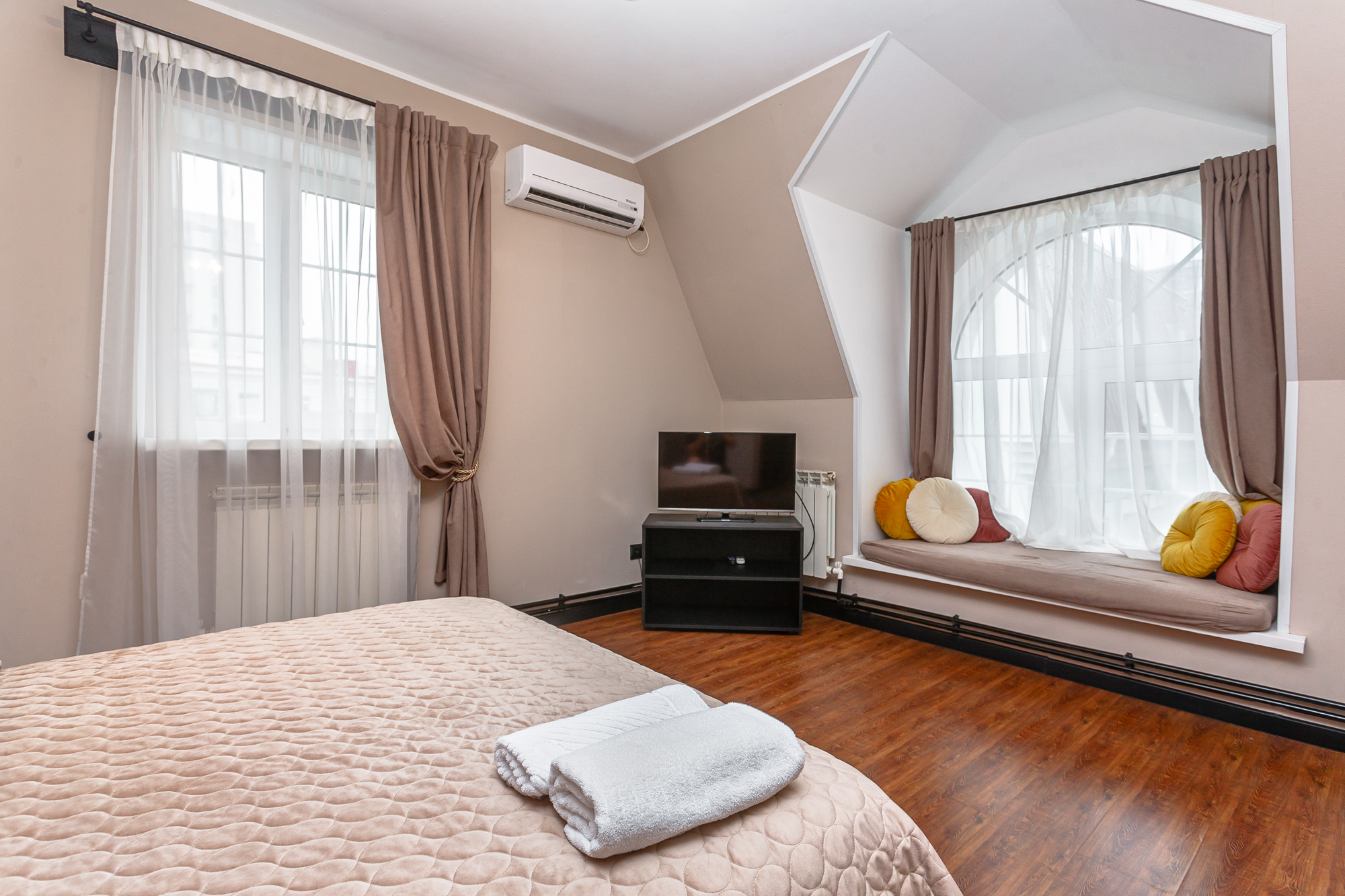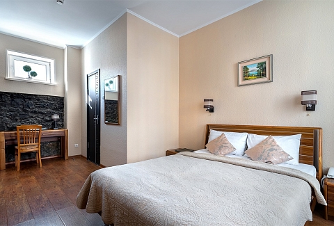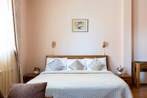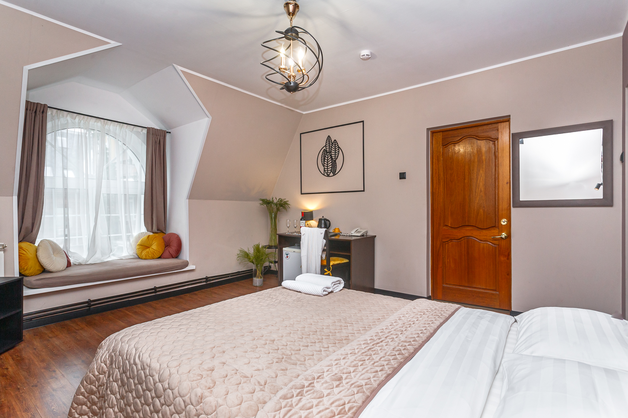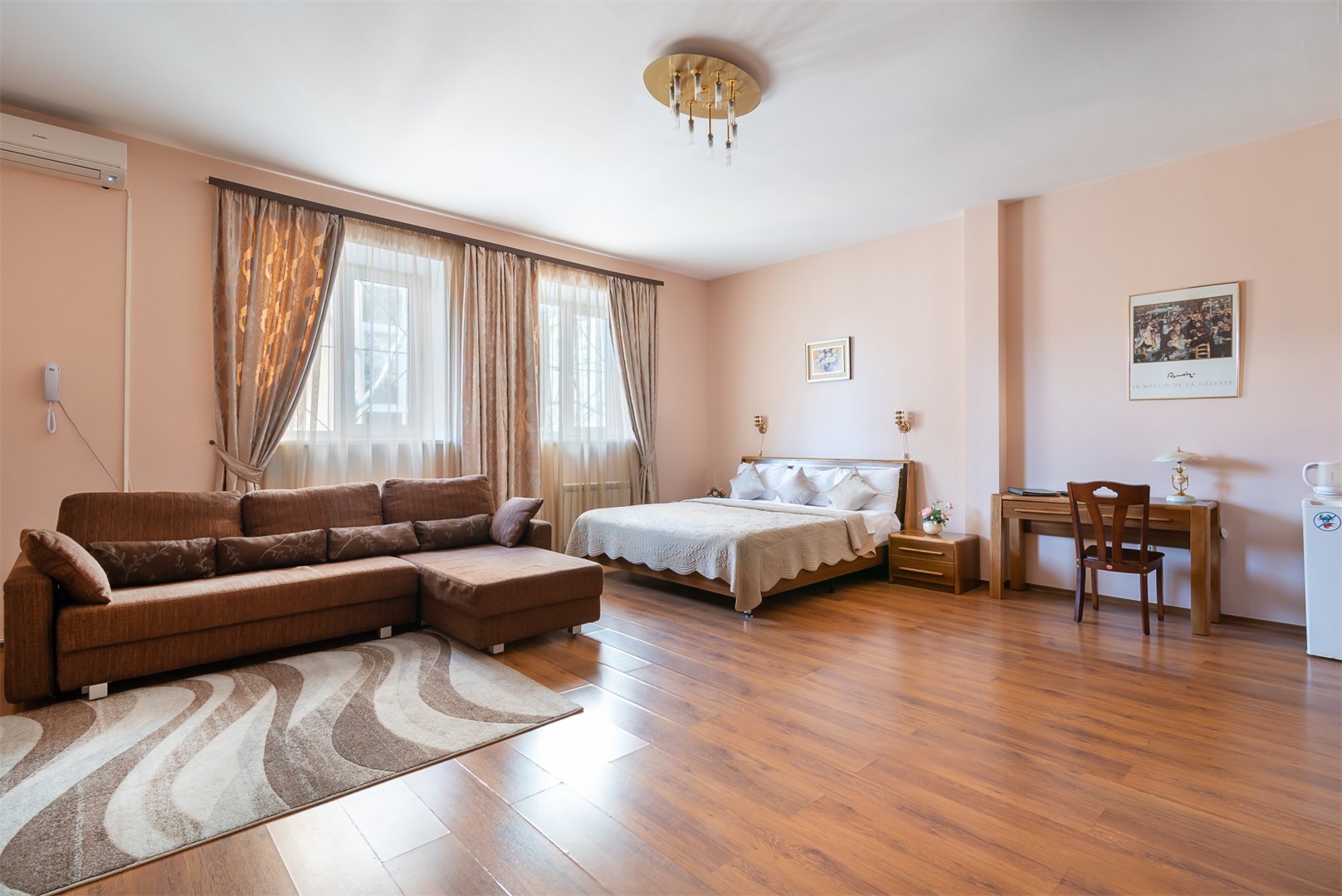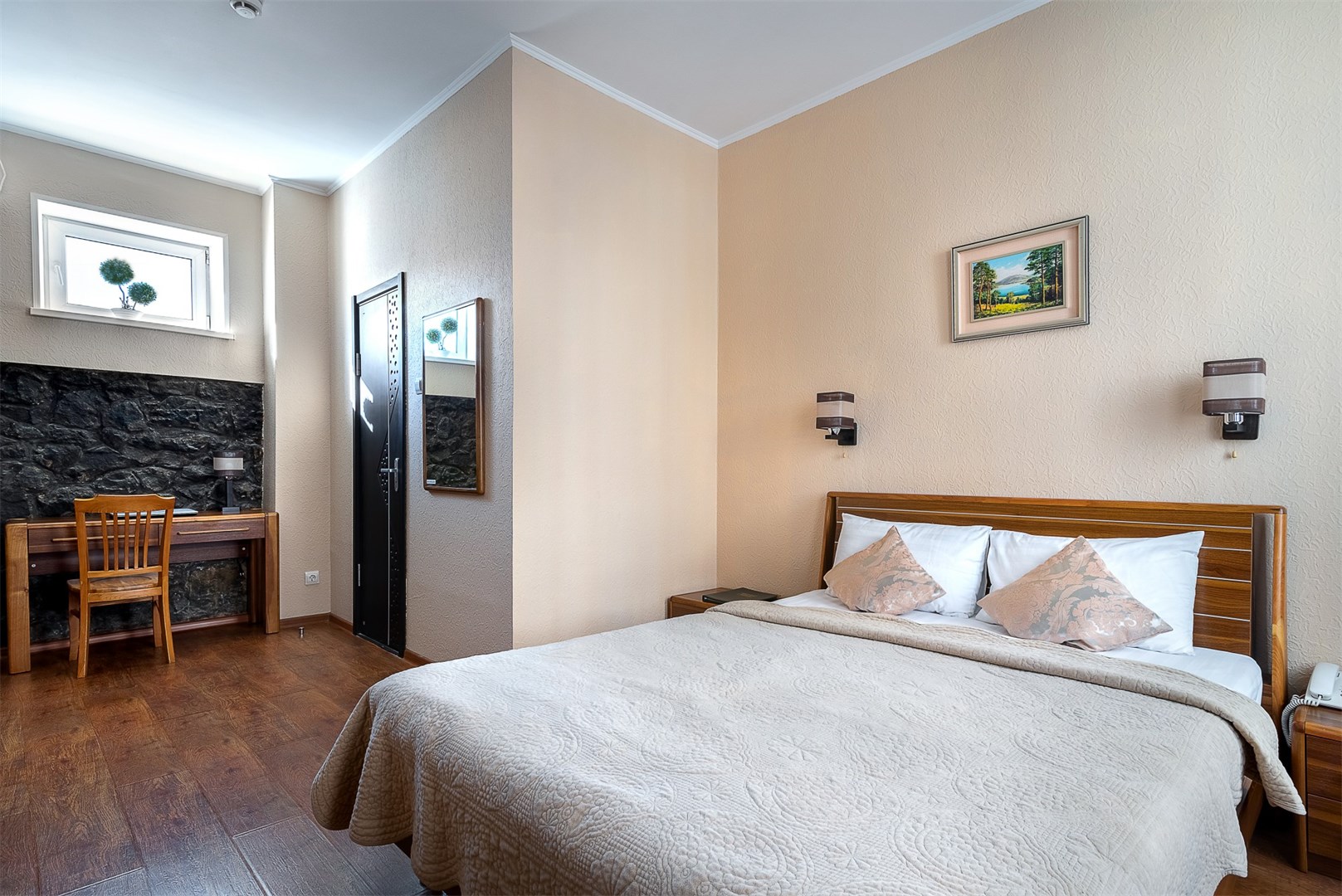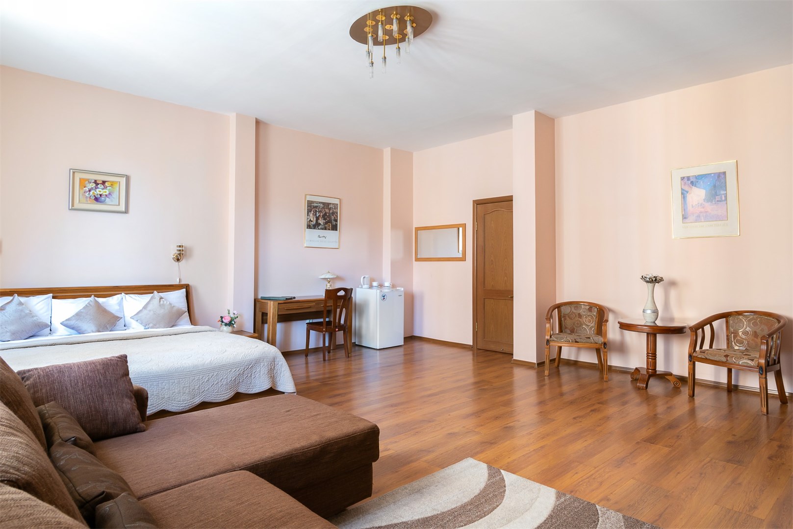 Небольшой жилой фонд предлагает отдыхающим номера разных категории — Эконом, Стандарт, Семейный, Люкс. В комнатах современный интерьер, выдержанный в приятной, преимущественно пастельной, цветовой гамме. Независимо от уровня комфорта везде имеются собственный санузел и кондиционер, есть необходимая бытовая техника, установлена индивидуальная система обогрева. В ряде номеров предусмотрены балконы.Для гостей в отеле работает ресторан, доступна сеть wi-fi, для автовладельцев организована парковочная зона, на ресепшене отдыхающим помогут вызвать трансфер в аэропорт или заказать такси.