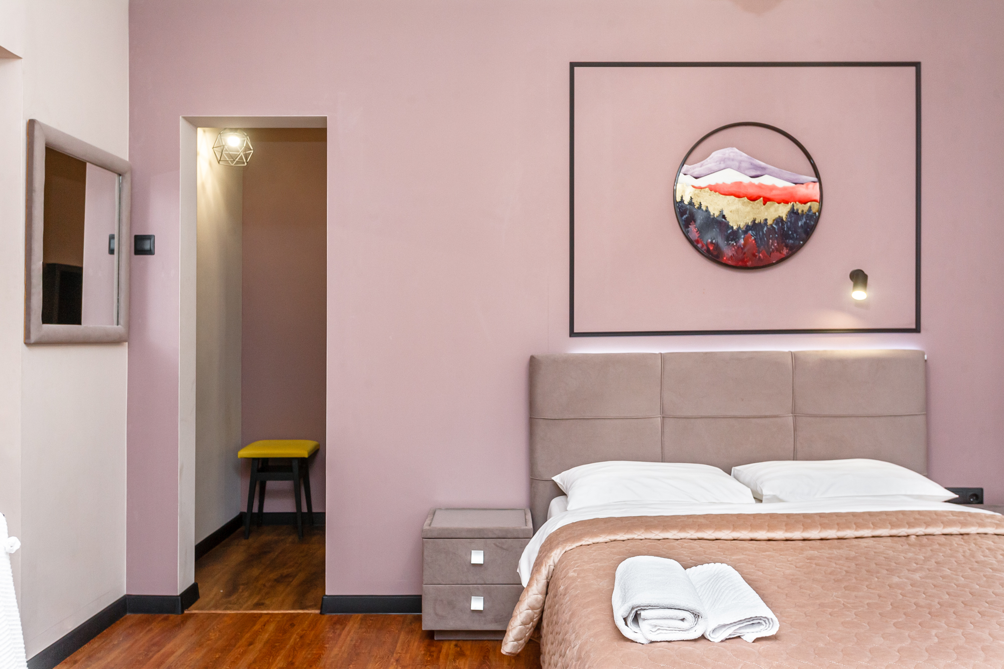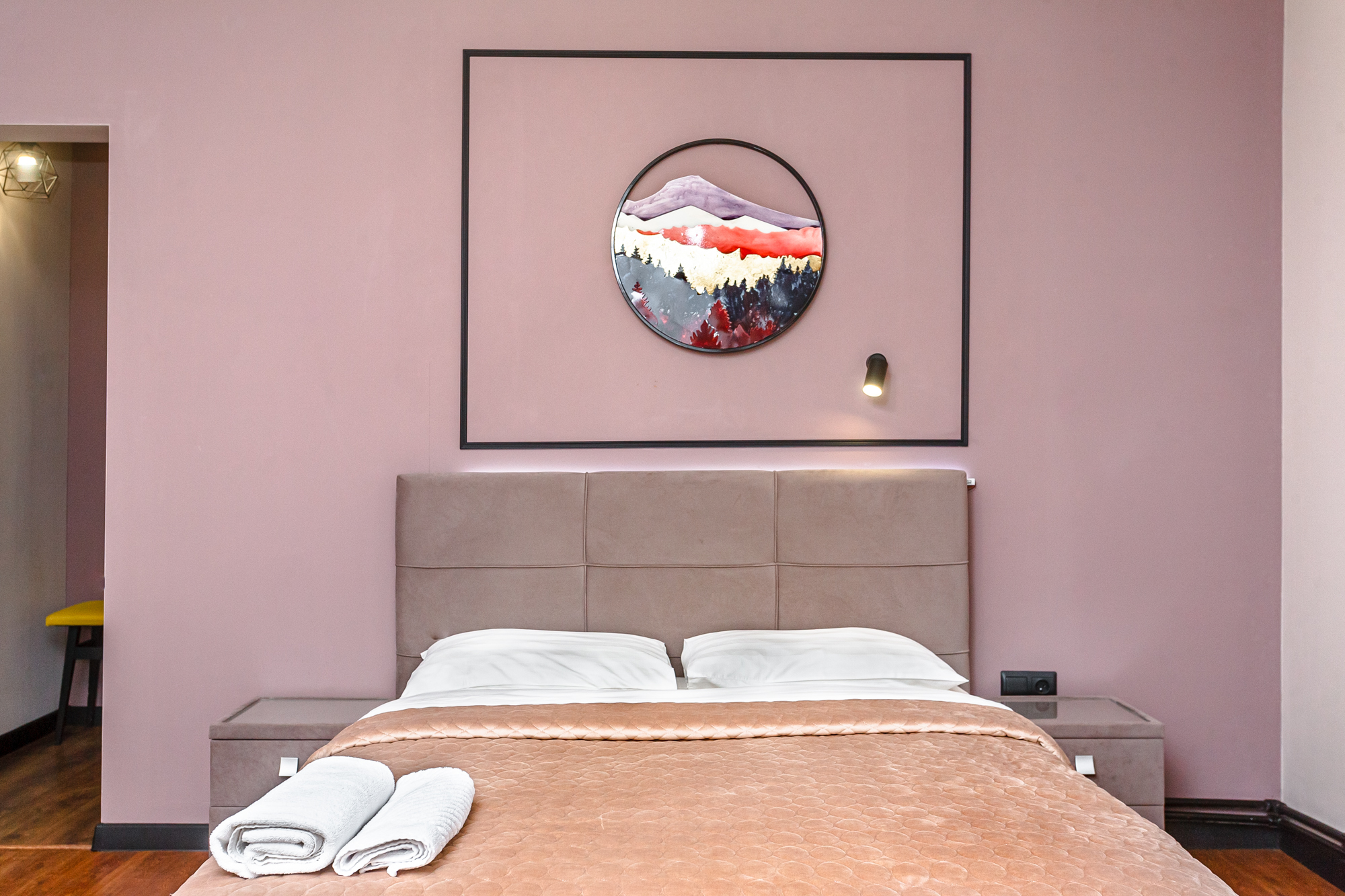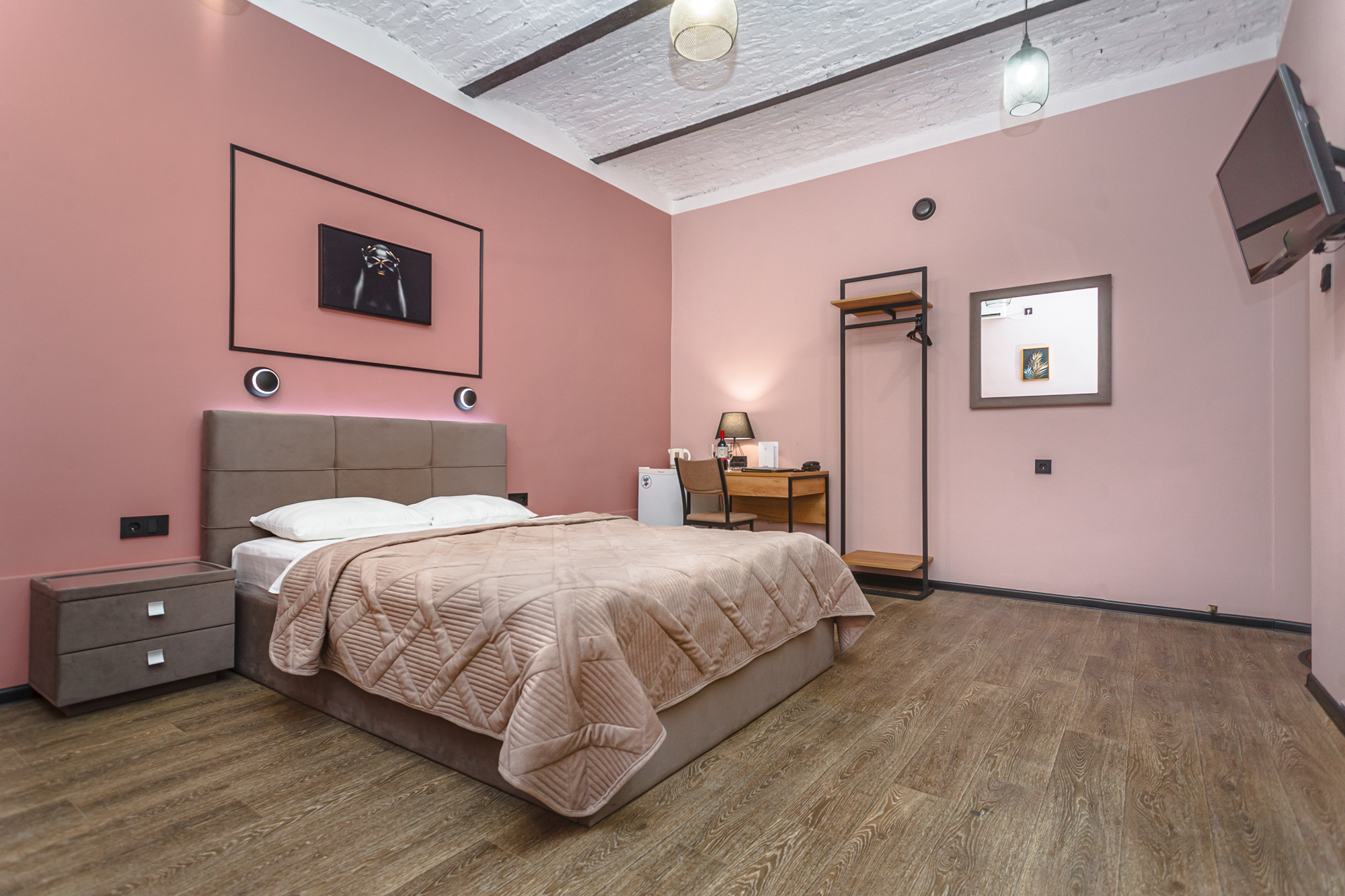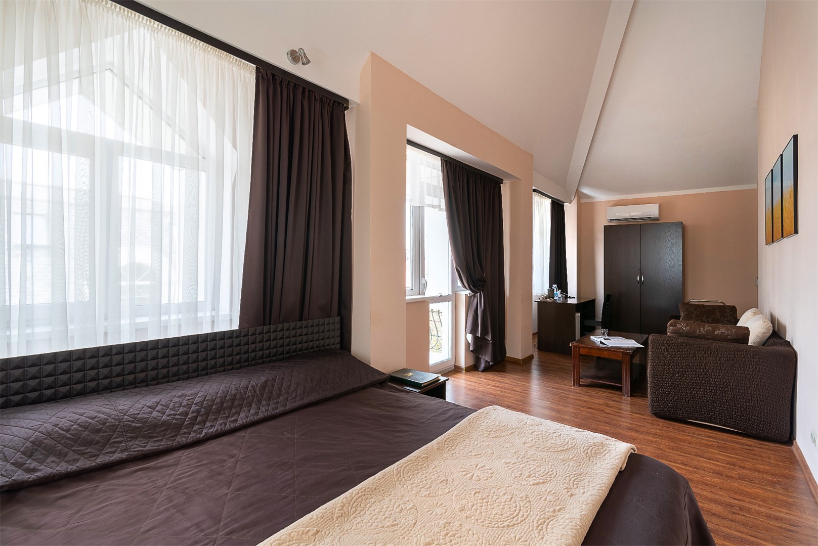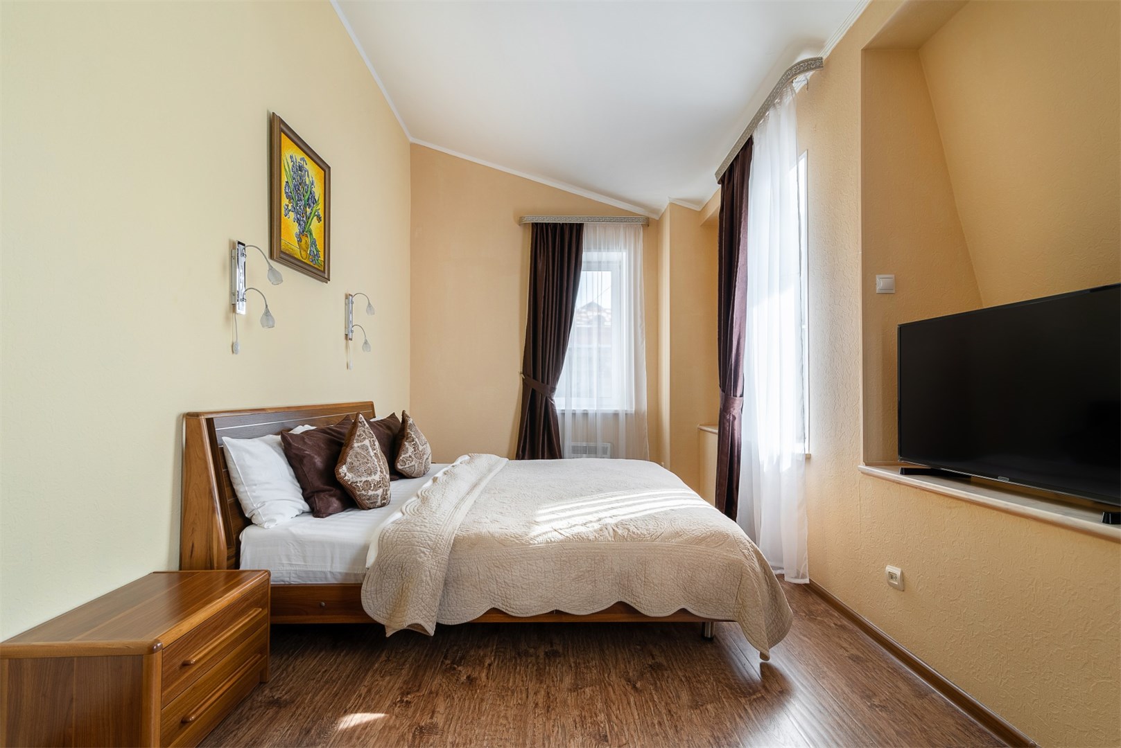 Небольшой жилой фонд предлагает отдыхающим номера разных категории — Эконом, Стандарт, Семейный, Люкс. В комнатах современный интерьер, выдержанный в приятной, преимущественно пастельной, цветовой гамме. Независимо от уровня комфорта везде имеются собственный санузел и кондиционер, есть необходимая бытовая техника, установлена индивидуальная система обогрева. В ряде номеров предусмотрены балконы.Для гостей в отеле работает ресторан, доступна сеть wi-fi, для автовладельцев организована парковочная зона, на ресепшене отдыхающим помогут вызвать трансфер в аэропорт или заказать такси.
