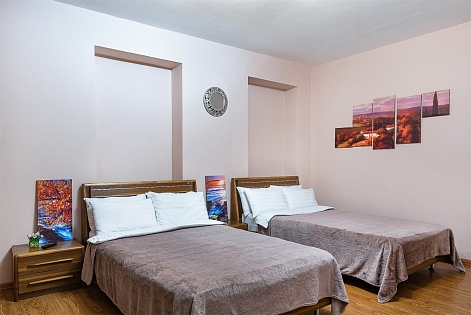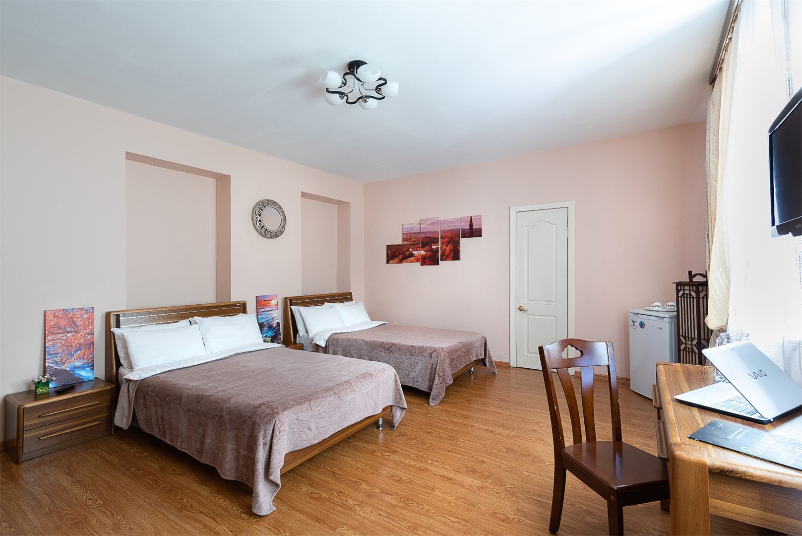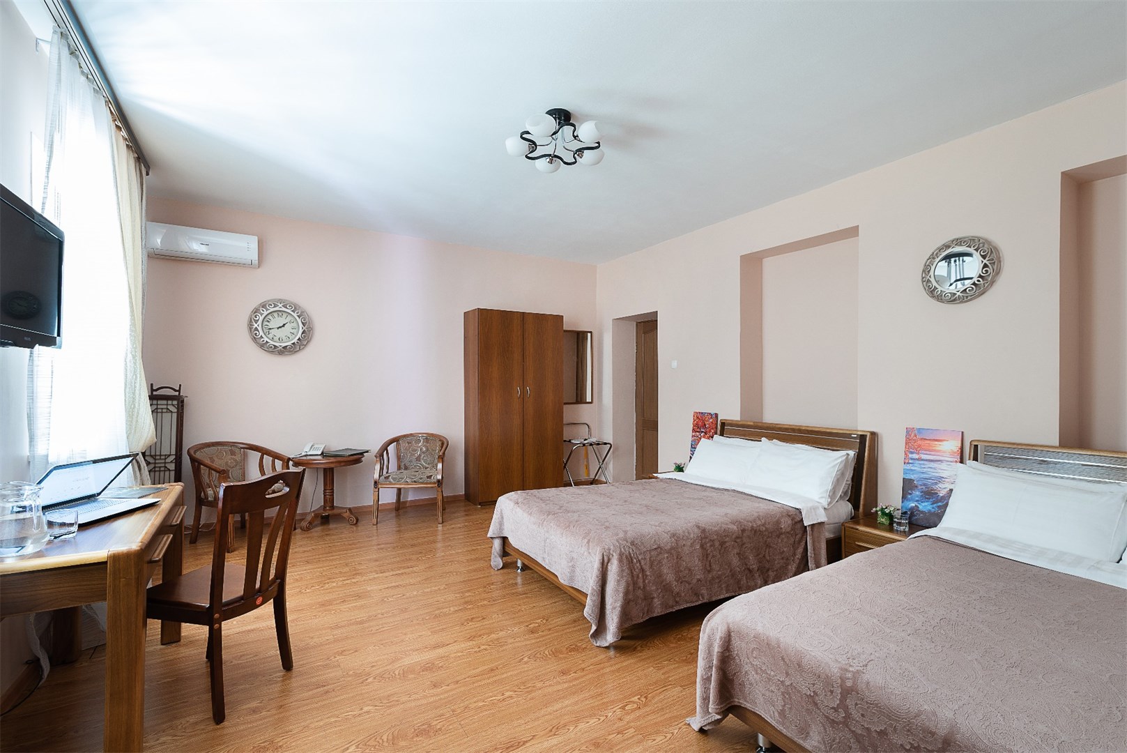 В номере: вешалка, зеркало, кровати односпальные, прикроватные тумбочки, стол, стулья, шкаф, индивидуальная система обогрева, кондиционер, мини-холодильник, телевизор, телефон, утюг, чайный набор посуды, электрочайник