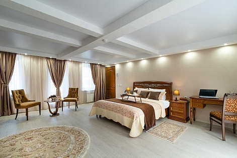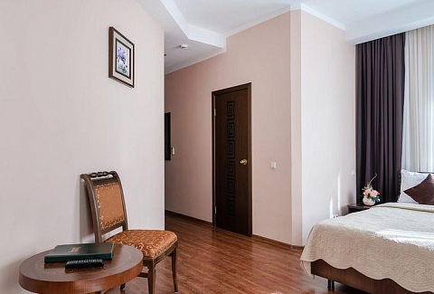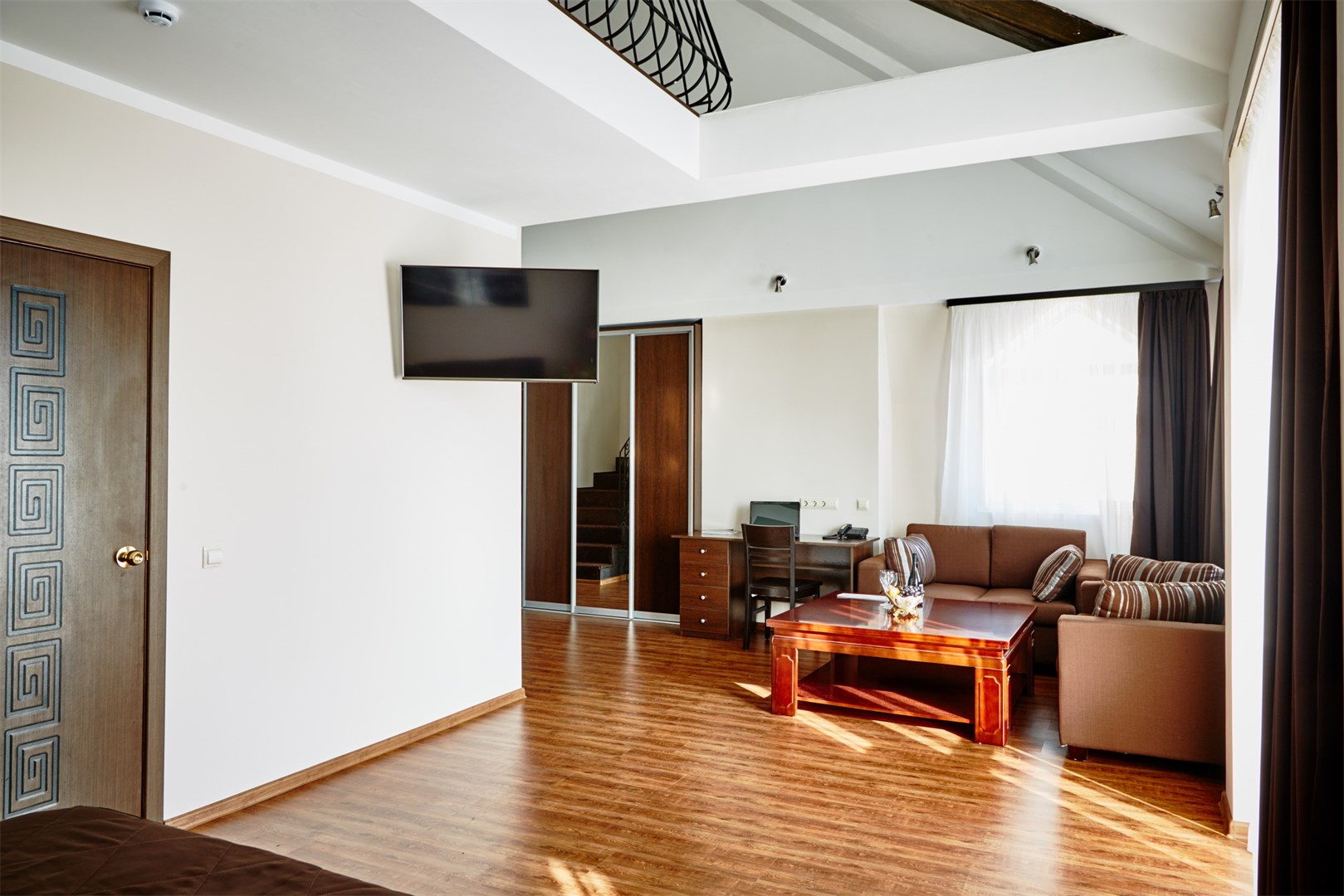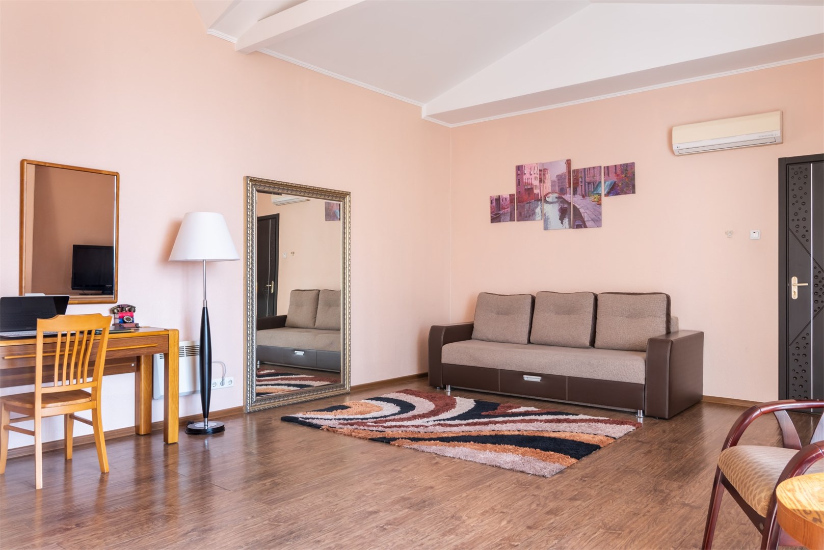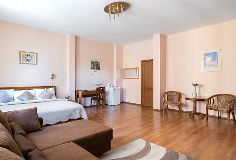 В номере: вешалка, зеркало, кровать двуспальная, набор мягкой мебели, прикроватные тумбочки, стол, стулья, шкаф, гладильная доска, индивидуальная система обогрева, кондиционер, мини-холодильник, телевизор, телефон, утюг, чайный набор посуды, электрочайник