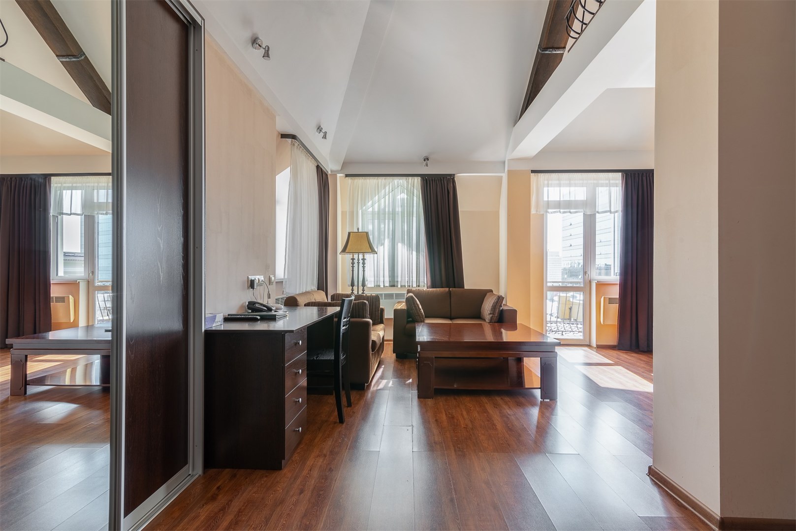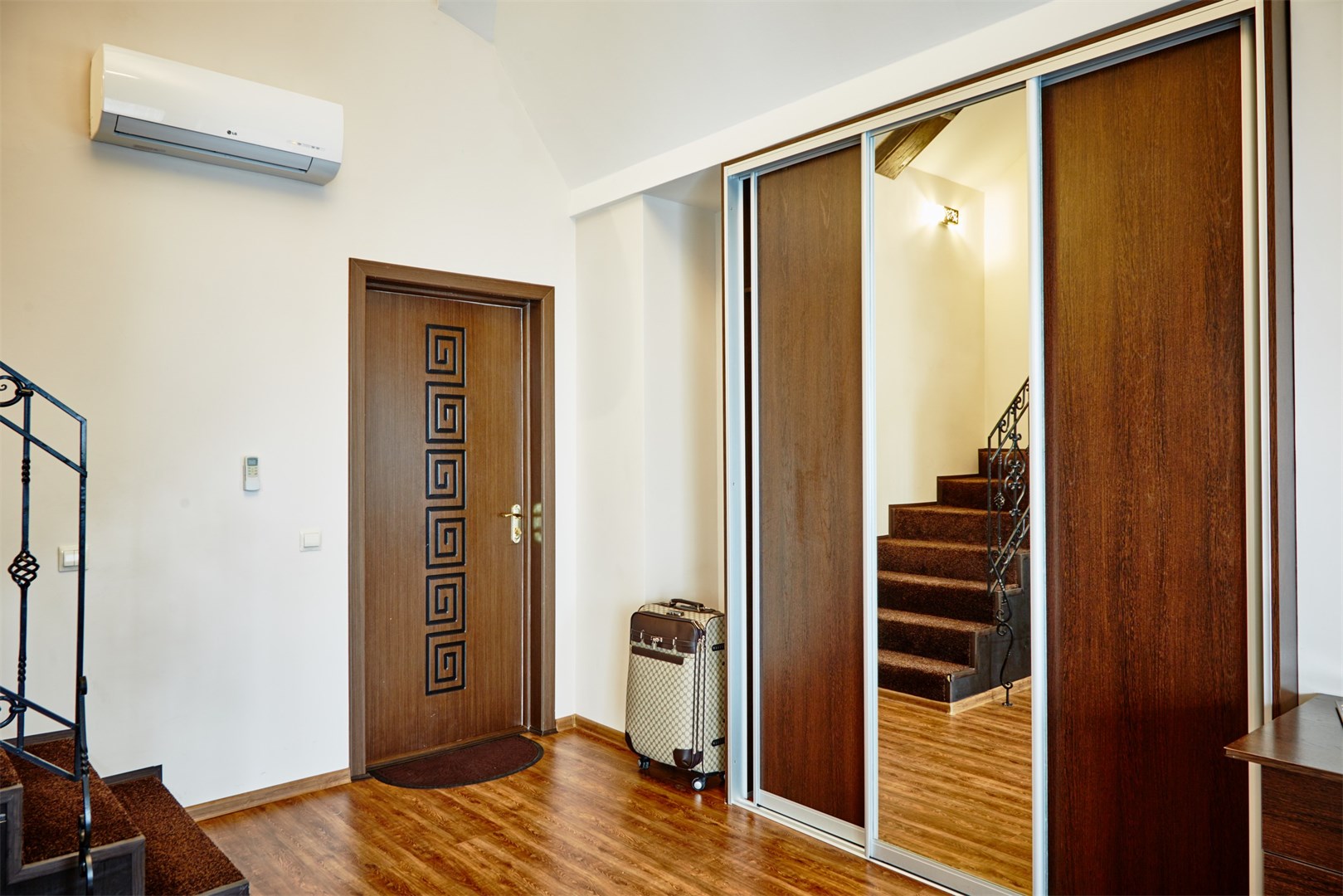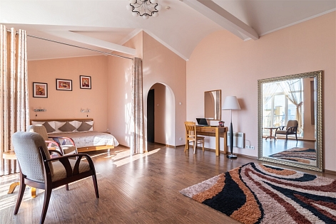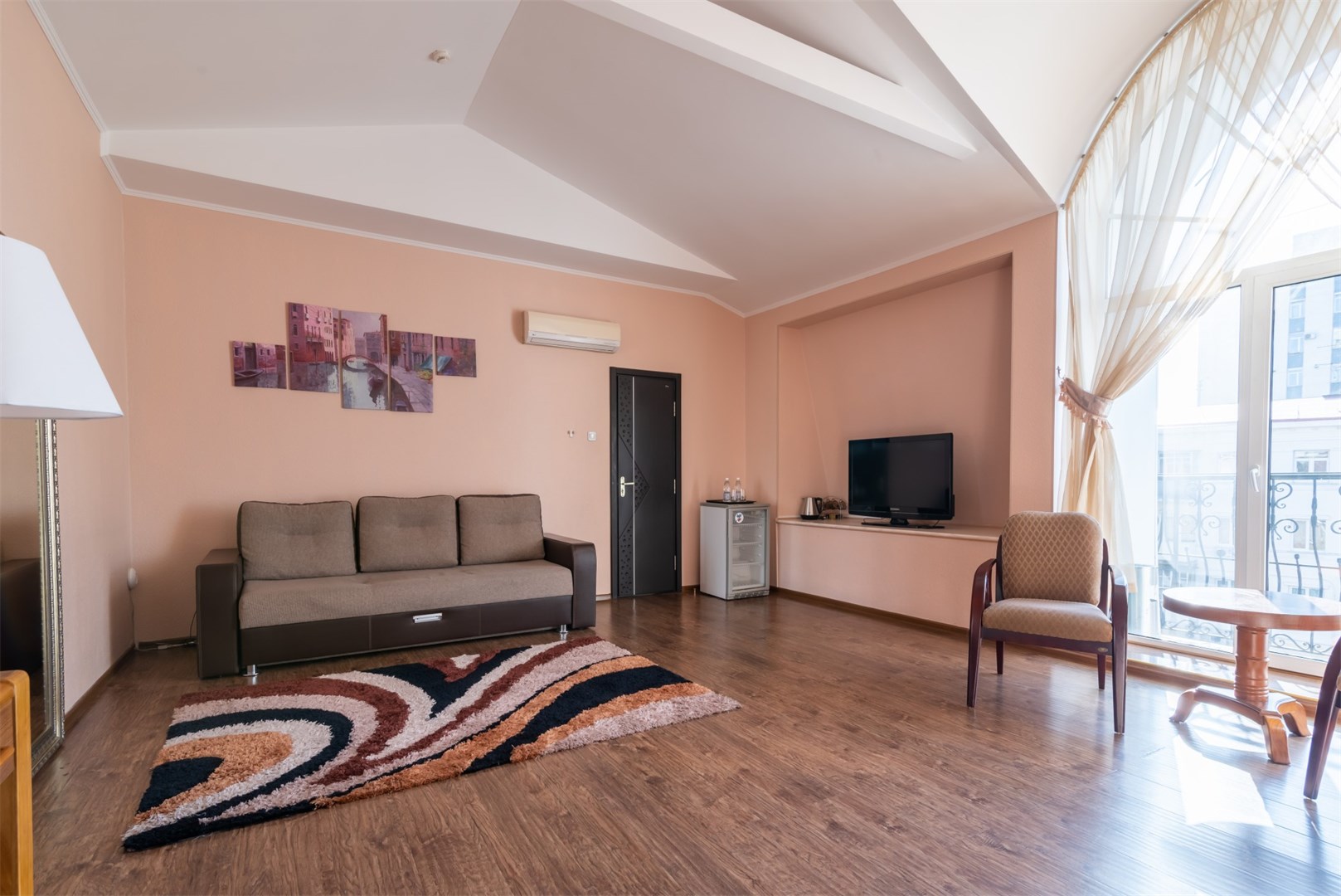 В номере: вешалка, зеркало, кровать двуспальная, набор мягкой мебели, прикроватные тумбочки, стол, стулья, шкаф, гладильная доска, индивидуальная система обогрева, кондиционер, мини-холодильник, телевизор, телефон, утюг, чайный набор посуды, электрочайник