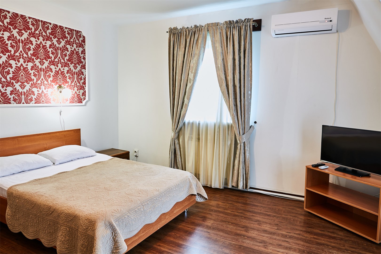 В номере: вешалка, зеркало, кровать двуспальная, прикроватные тумбочки, стол, стулья, шкаф, индивидуальная система обогрева, кондиционер, мини-холодильник, телевизор, телефон, утюг, чайный набор посуды, электрочайник