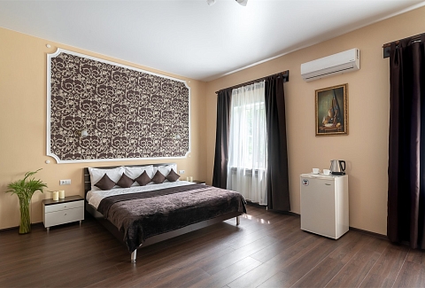 В номере: вешалка, зеркало, кровать двуспальная, набор мягкой мебели, прикроватные тумбочки, стол, стулья, шкаф, гладильная доска, индивидуальная система обогрева, кондиционер, мини-холодильник, плита электрическая, телевизор, телефон, утюг, электрочайник