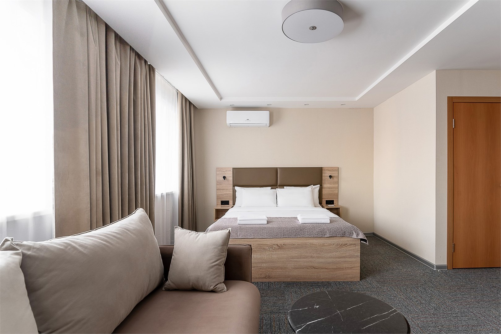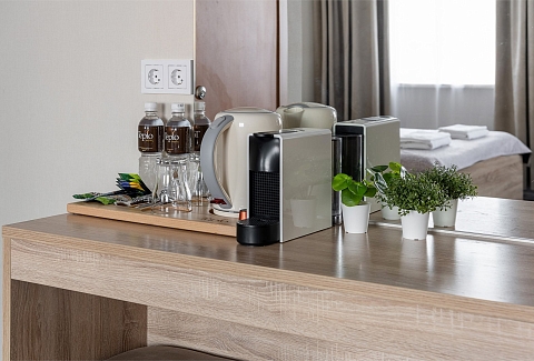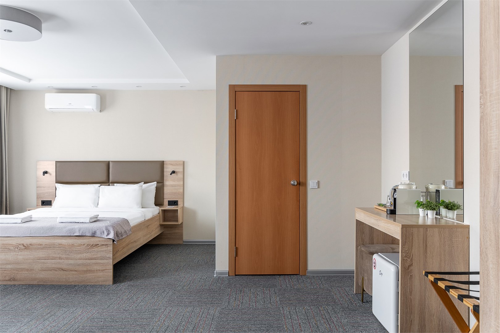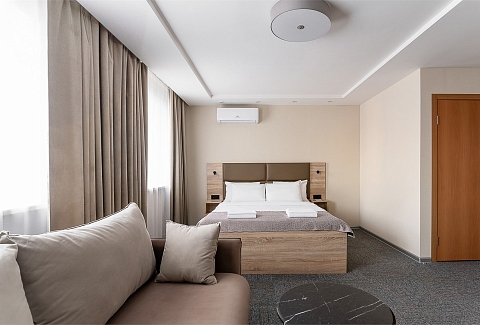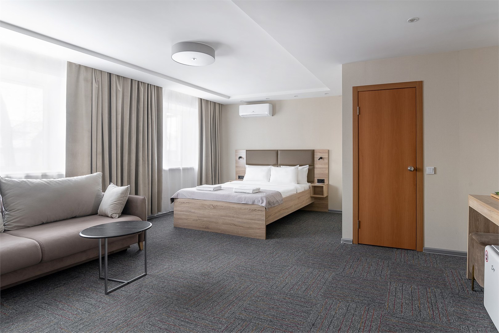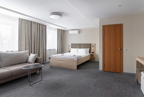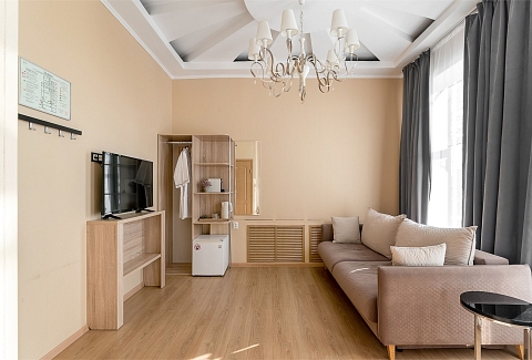 В номере: вешалка, диван, зеркало, кровать двуспальная, прикроватные тумбочки, стол, стул, шкаф, кондиционер, кофемашина, мини-холодильник, набор посуды, телевизор ЖК, чайный набор посуды, электрочайник
