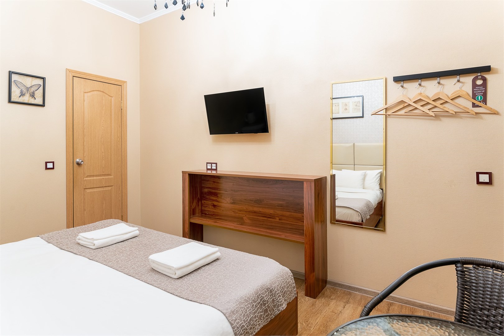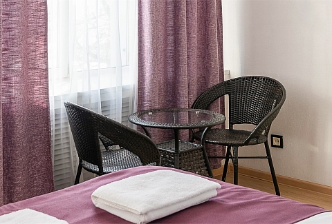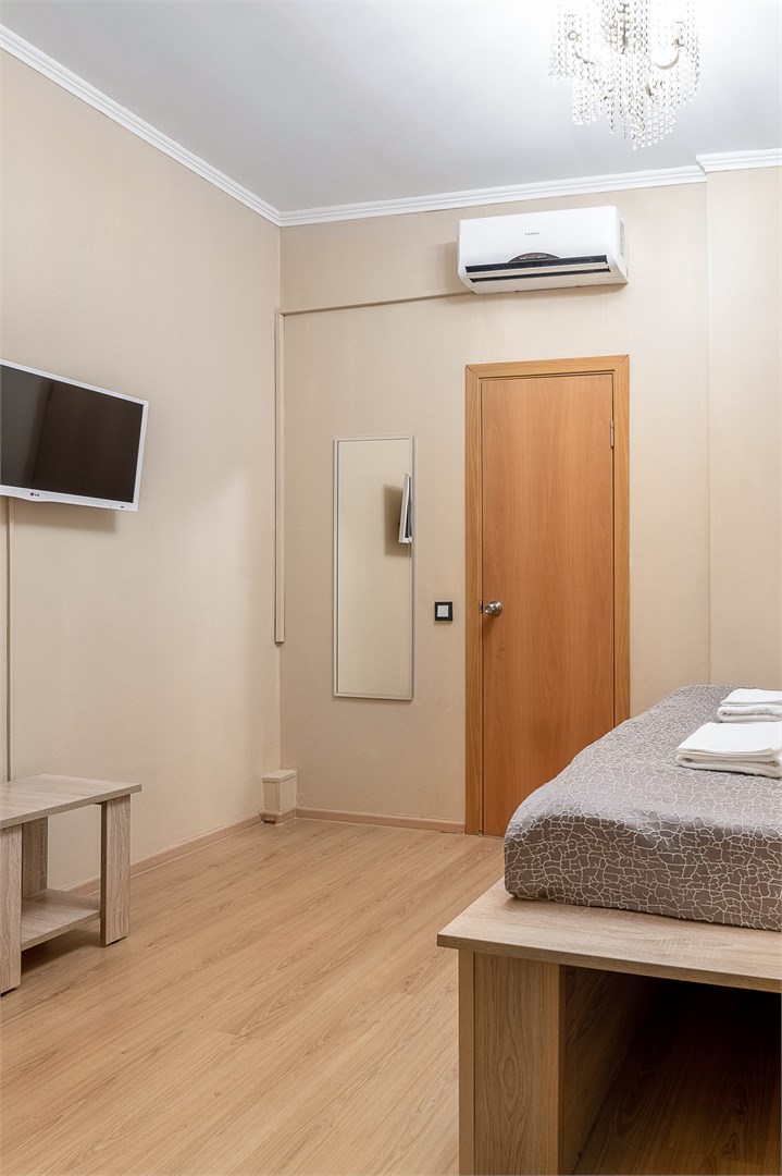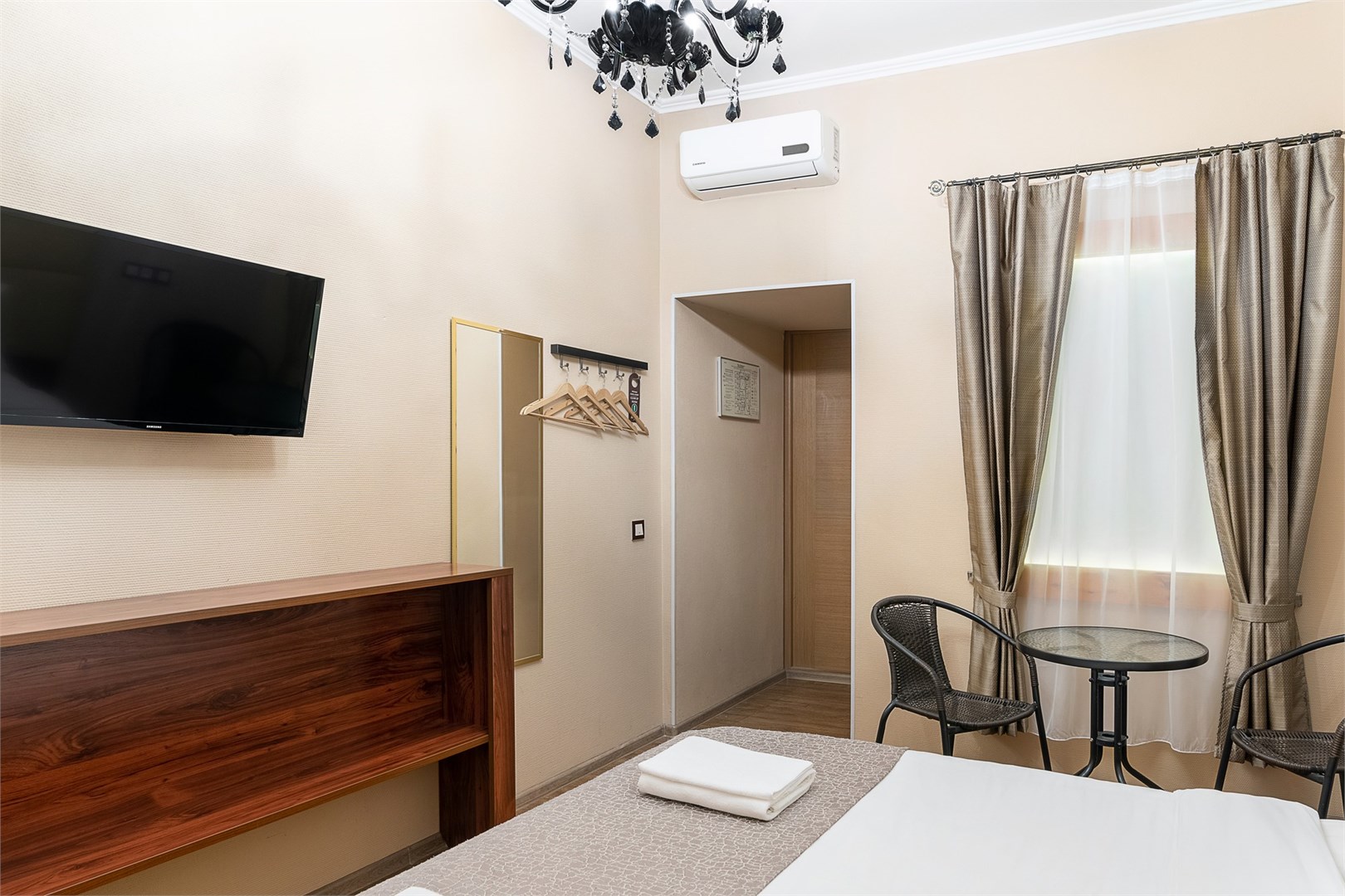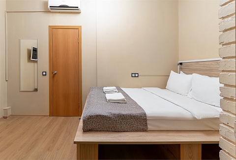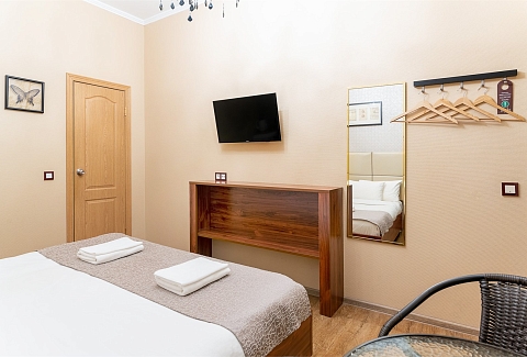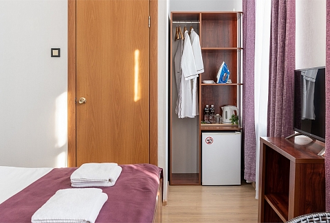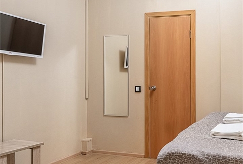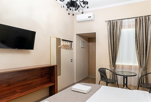 В номере: вешалка, зеркало, кровать двуспальная, стол, стул, шкаф, кондиционер, мини-холодильник, телевизор ЖК, чайный набор посуды, электрочайник