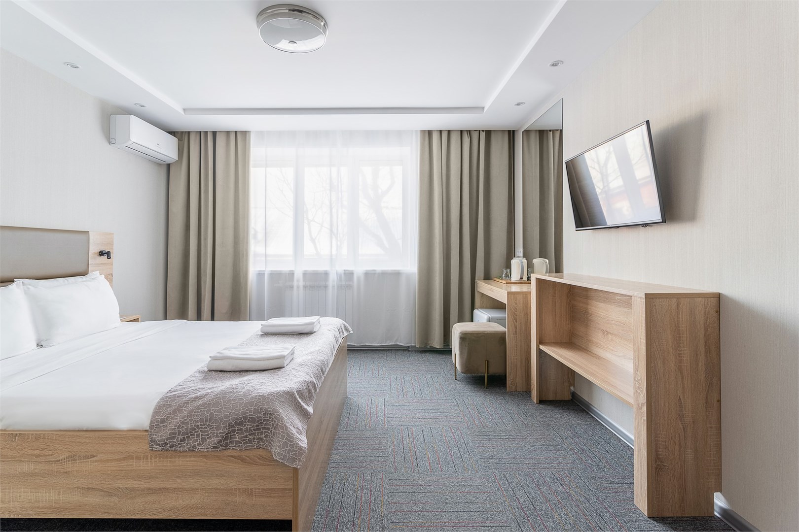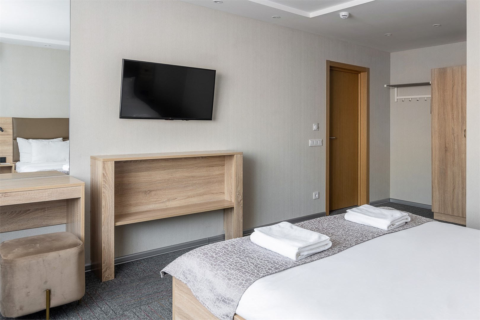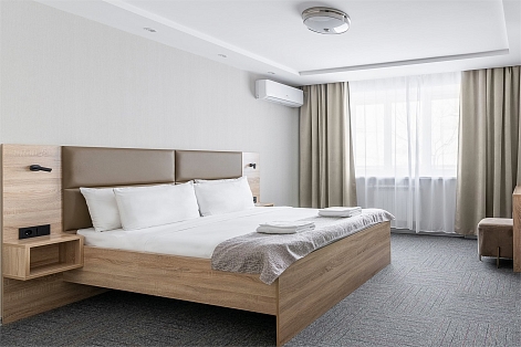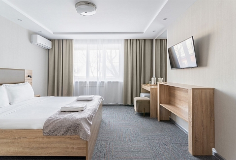 В номере: вешалка, зеркало, кровать двуспальная, прикроватные тумбочки, стол, стул, шкаф, кондиционер, мини-холодильник, телевизор ЖК, чайный набор посуды, электрочайник