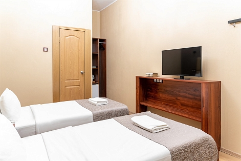 В номере: вешалка, зеркало, кровати односпальные /одна двуспальная кровать, прикроватные тумбочки, стол, стул, шкаф, кондиционер, мини-холодильник, телевизор ЖК, чайный набор посуды, электрочайник
