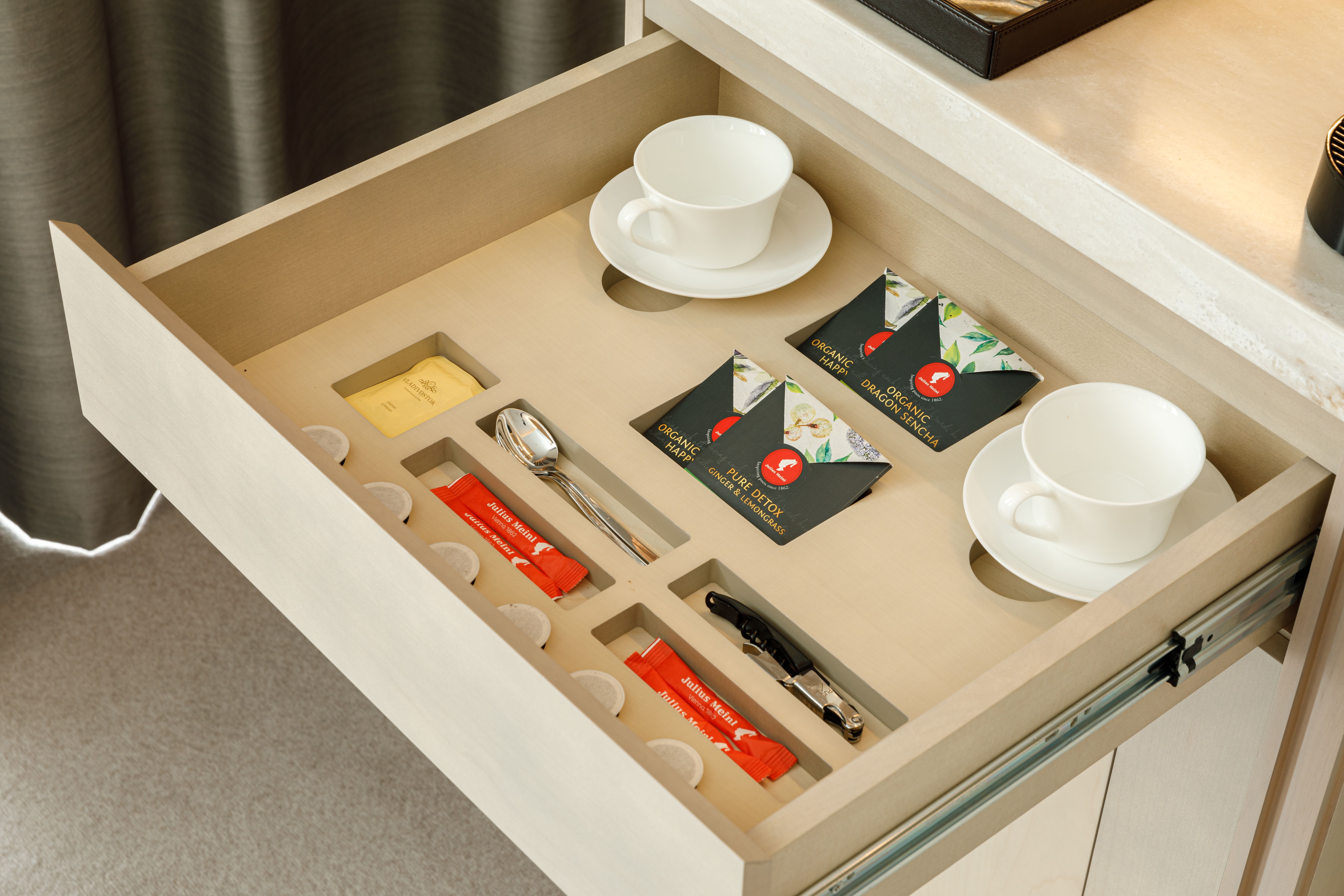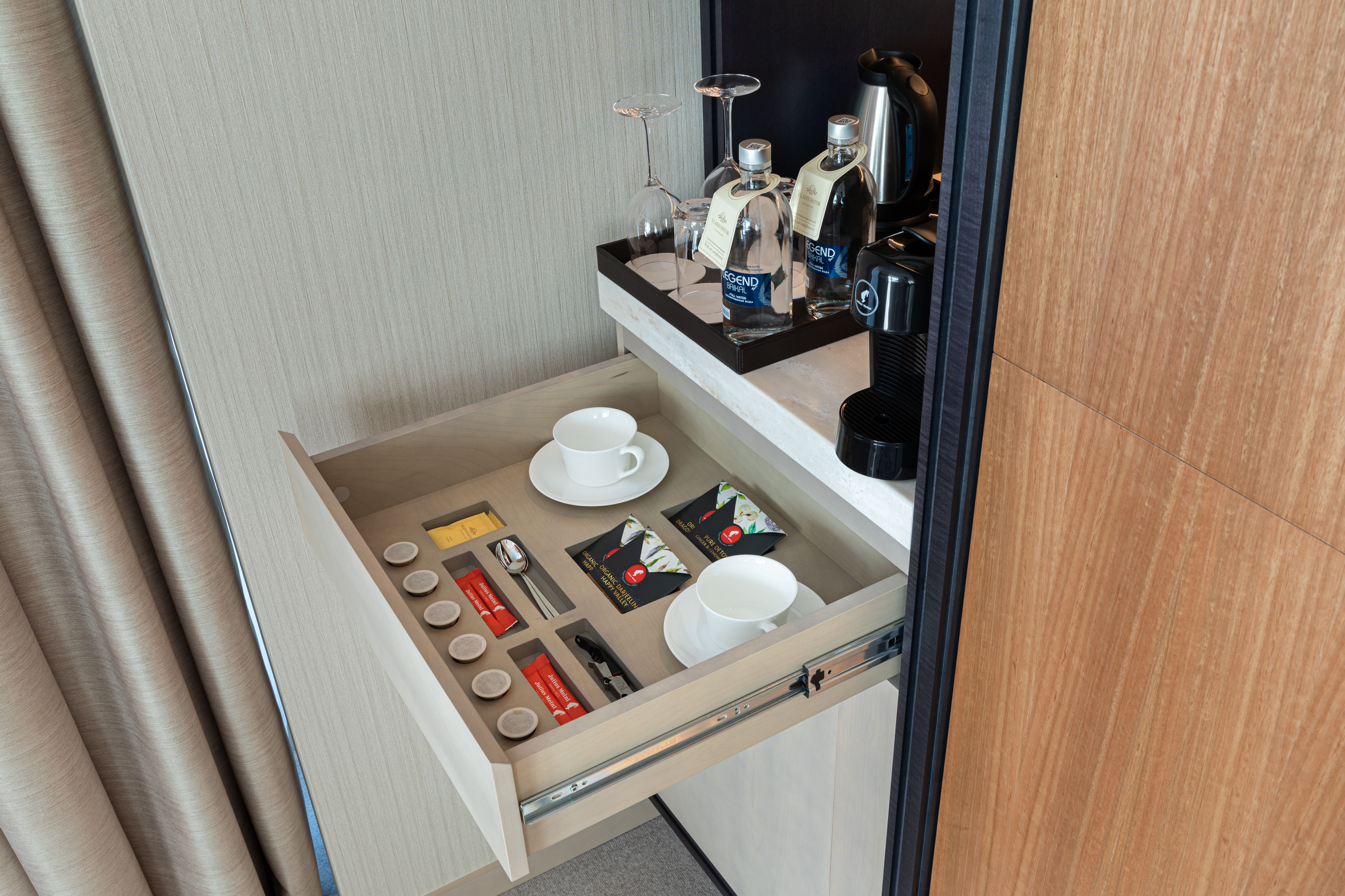 В номере: вешалка, диван, зеркало, кресло, кровать двуспальная, прикроватные тумбочки, стол, стулья, шкаф, кондиционер, кофемашина, сейф, телевизор, телефон, утюг, чайный набор посуды, электрочайник