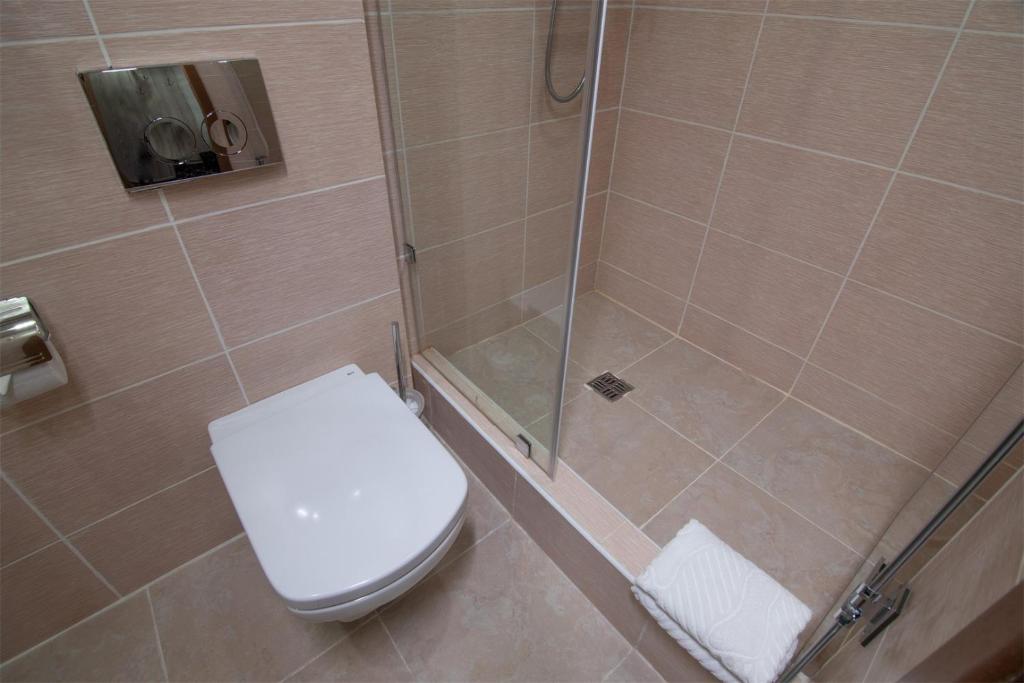 Санузел: с душевой кабиной, тапочки, туалетные принадлежности, фен