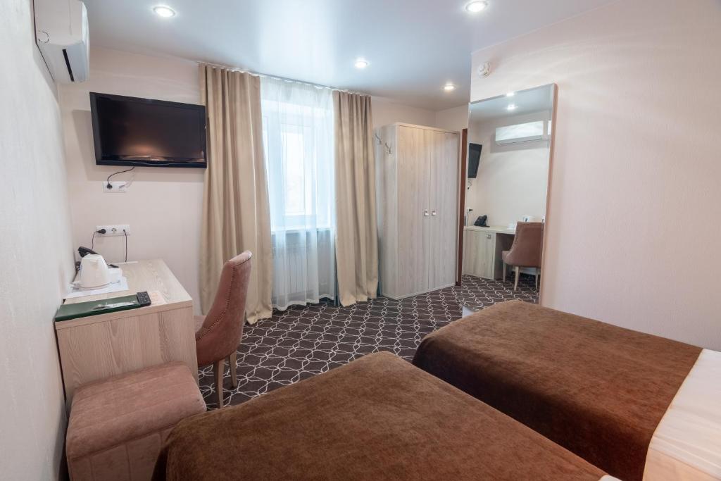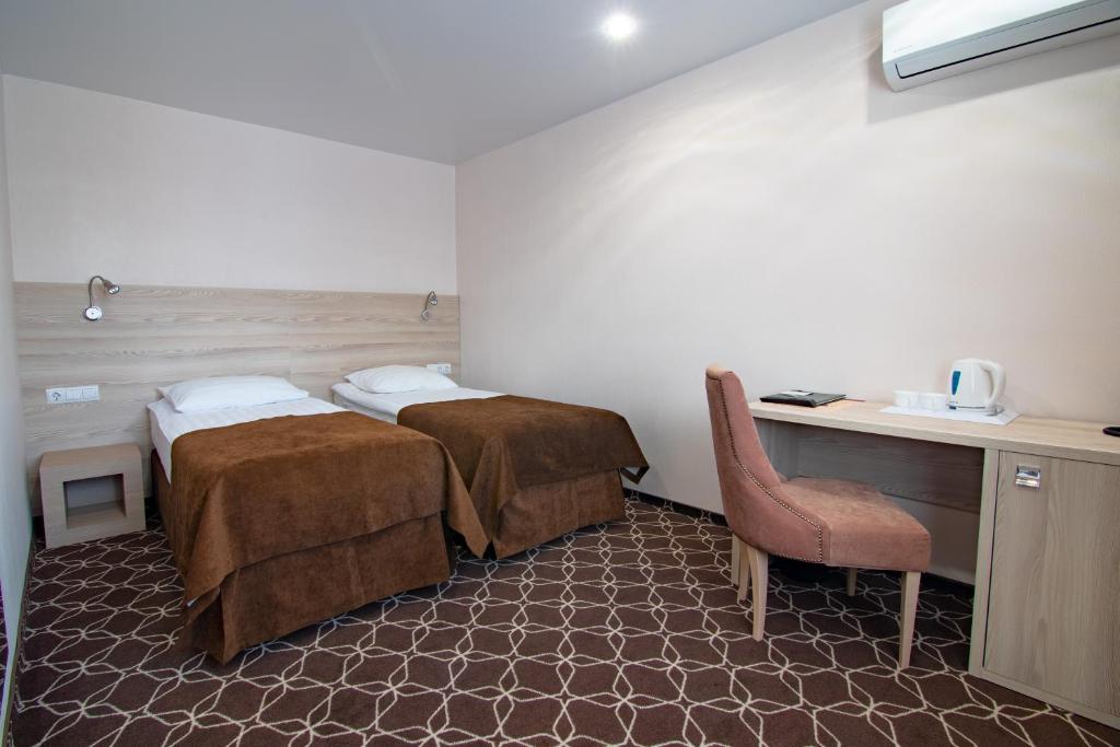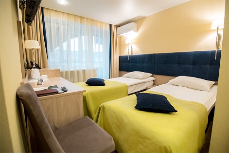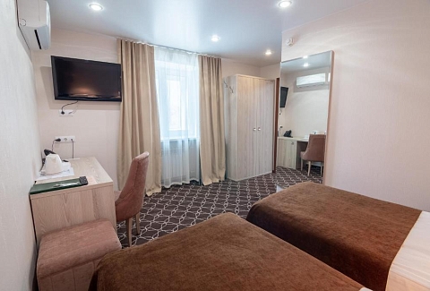 В номере: вешалка, зеркало, кровати односпальные, прикроватные тумбочки, стол, стулья, шкаф, кондиционер, мини-холодильник, телевизор, телефон, чайник