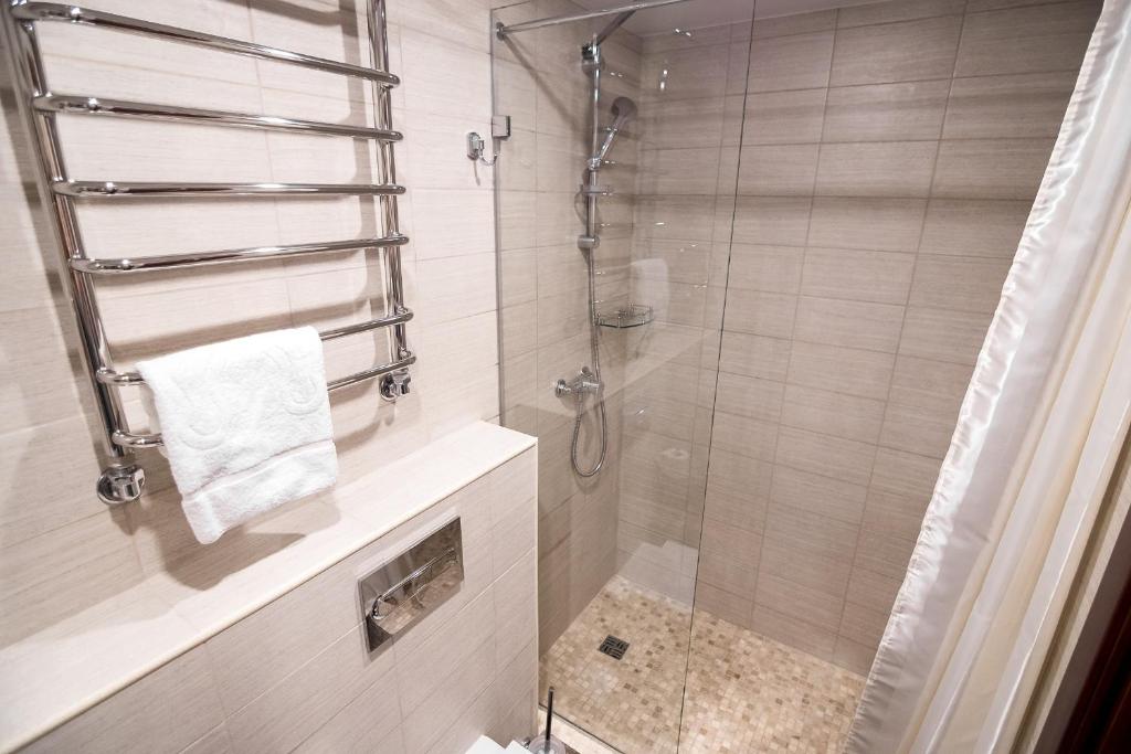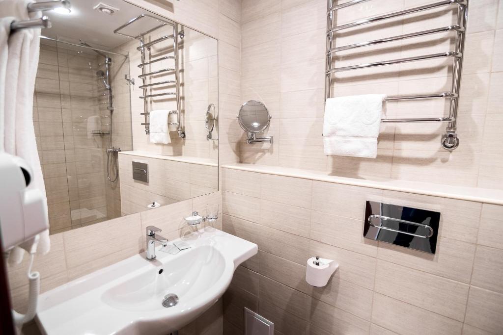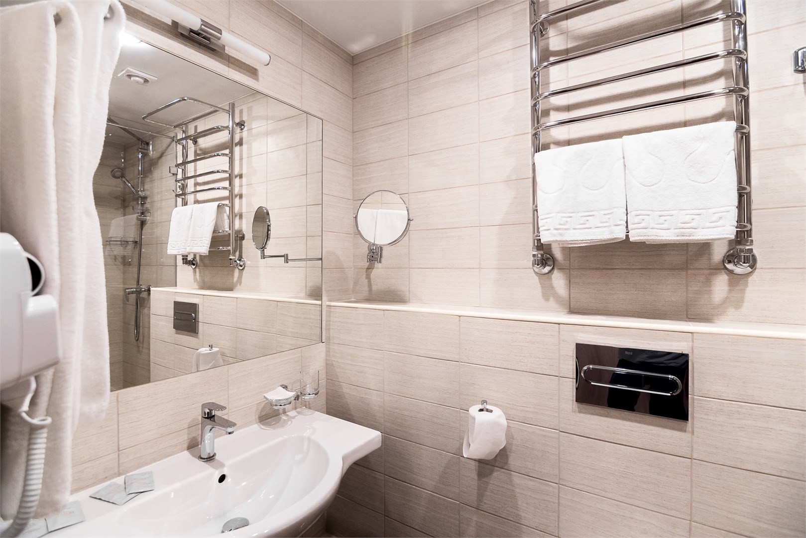 Санузел: с ванной или душевой кабиной, тапочки, туалетные принадлежности, фен, халат