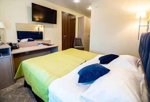 В номере: вешалка, зеркало, кровать двуспальная, прикроватные тумбочки, стол, шкаф, набор посуды, телевизор, телефон, холодильник, электрочайник