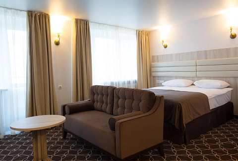 В номере: вешалка, диван, зеркало, кровать двуспальная, прикроватные тумбочки, стол, шкаф, кондиционер, набор посуды, телевизор, телефон, холодильник, электрочайник