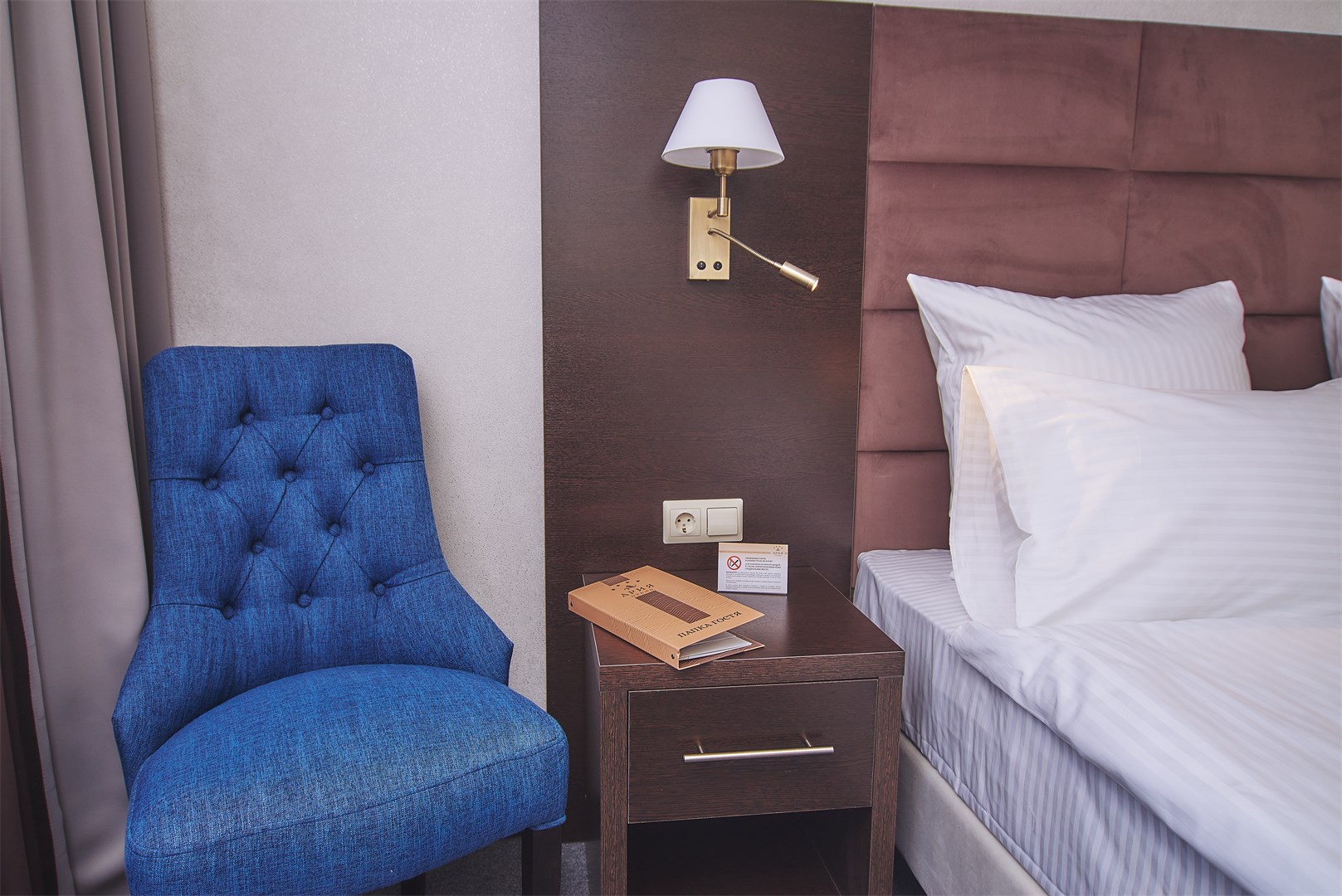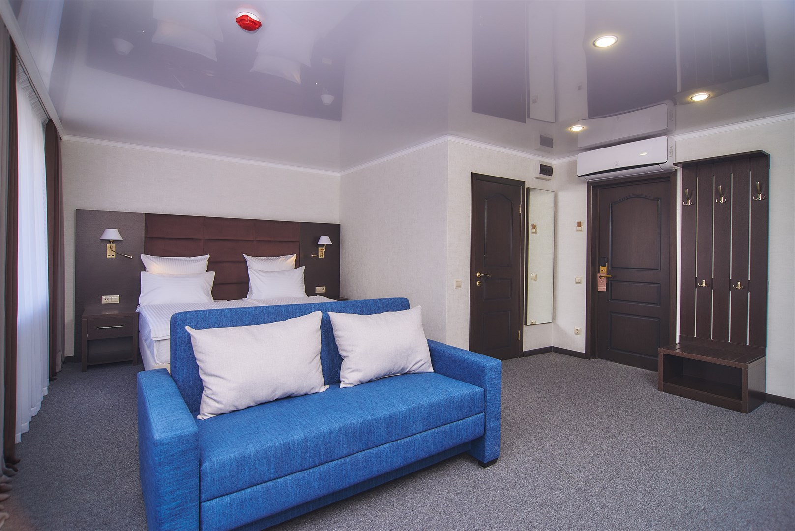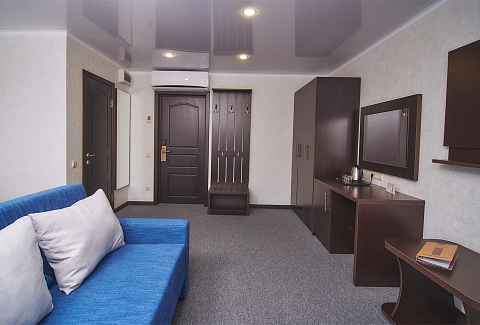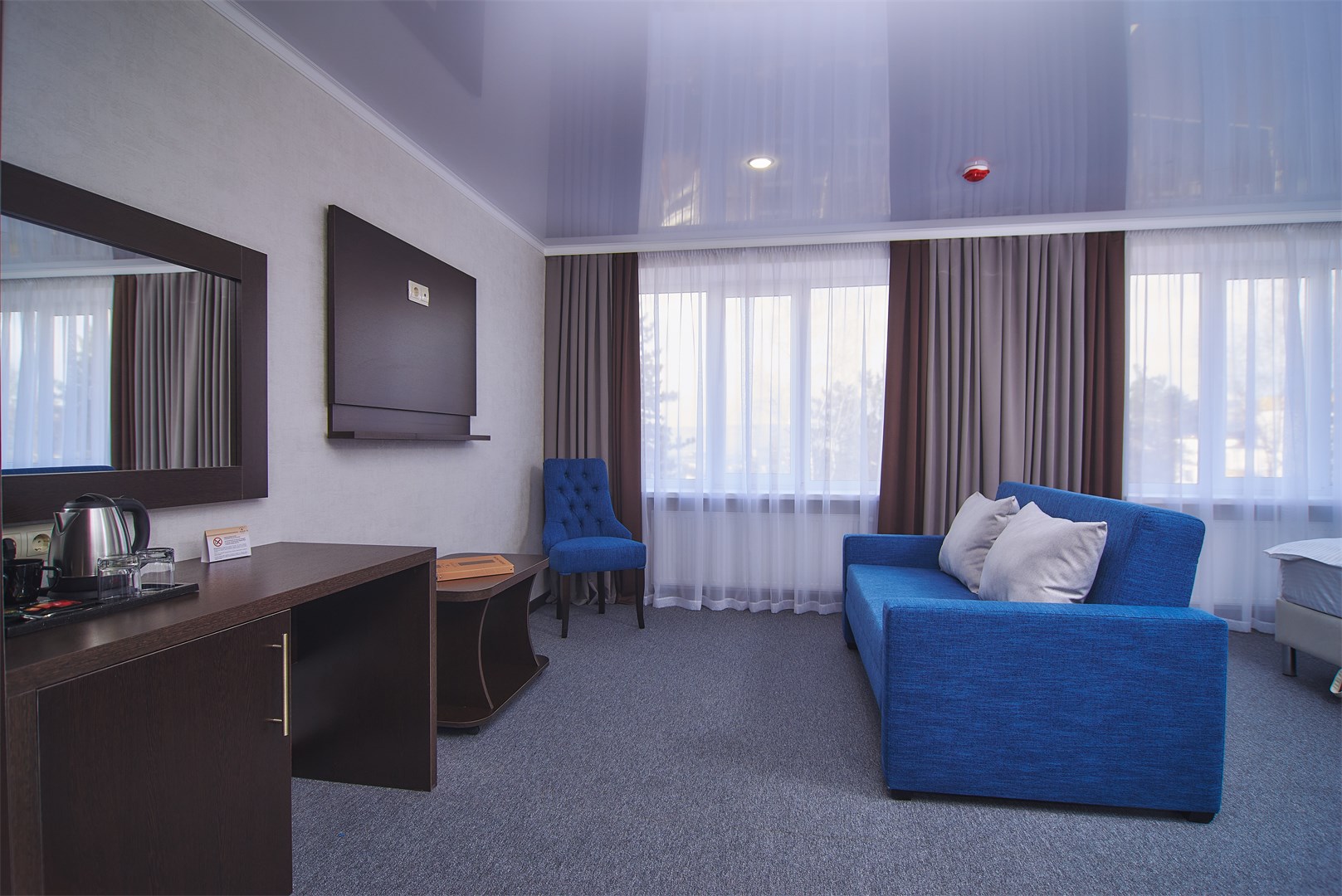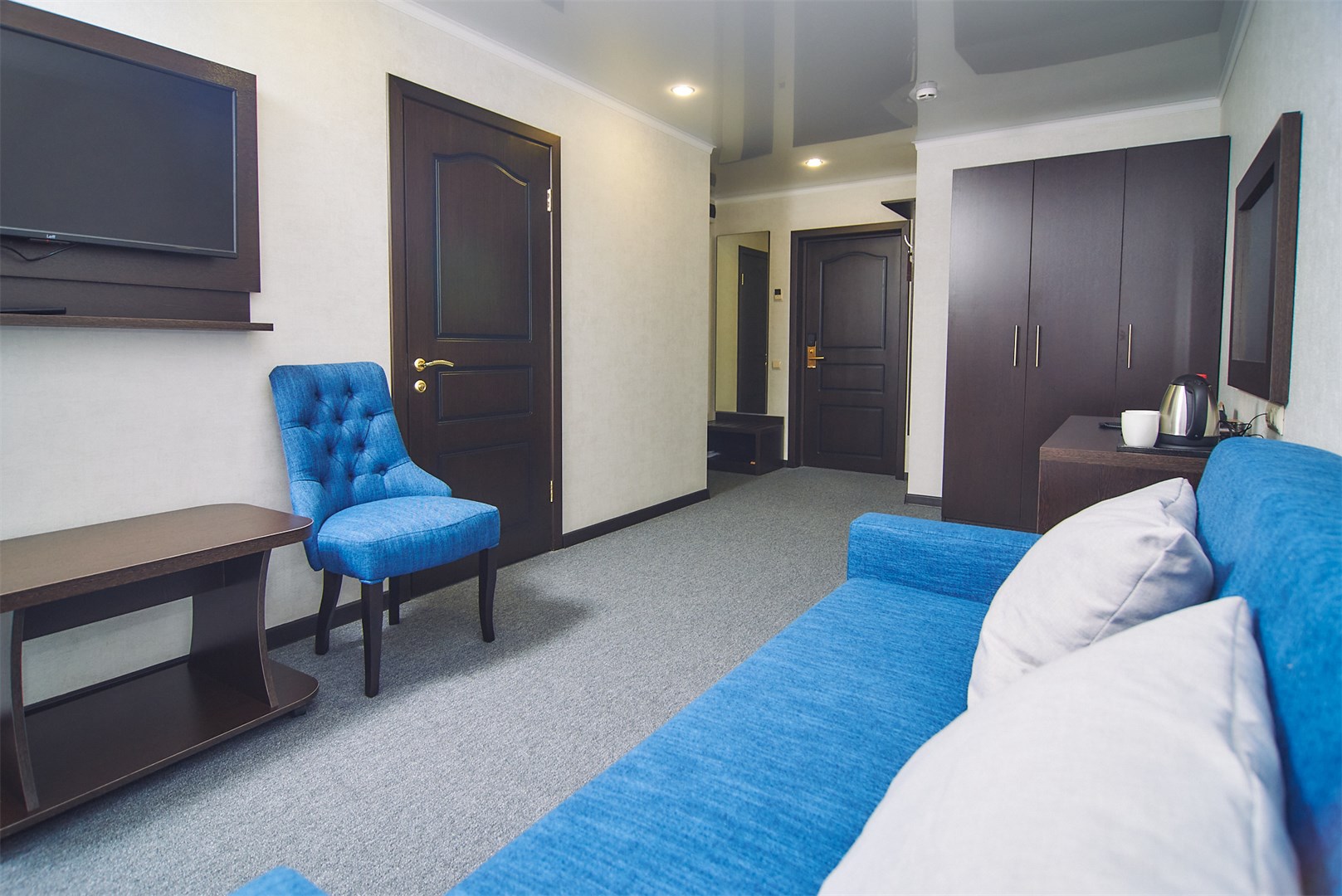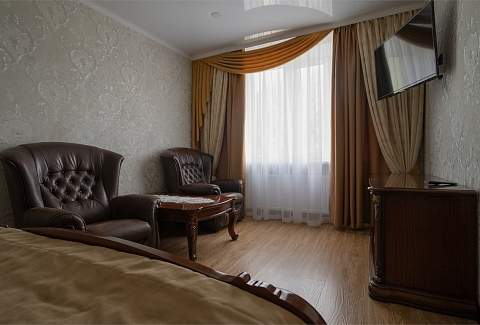 В номере: вешалка, диван, зеркало, кресло, кровать двуспальная, прикроватные тумбочки, стол, стул, шкаф, кондиционер, мини-холодильник, сейф, телевизор, телефон, чайный набор посуды, электрочайник