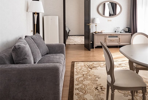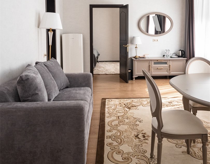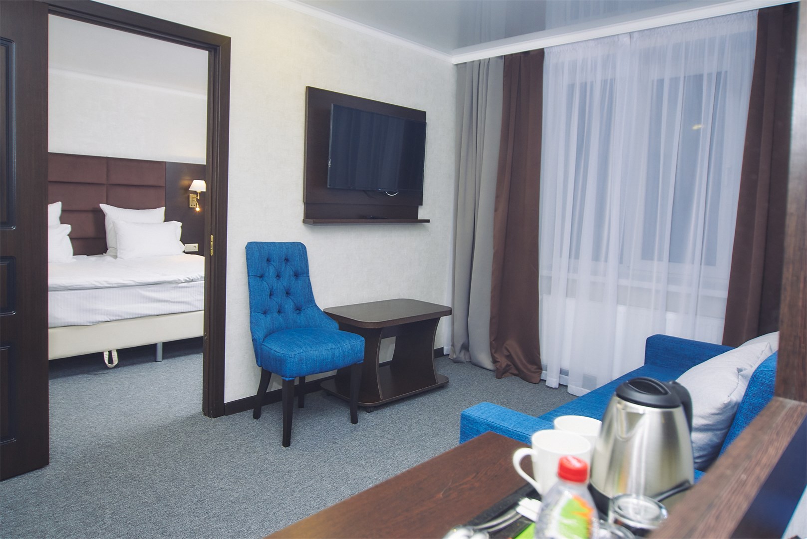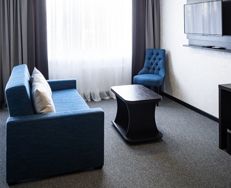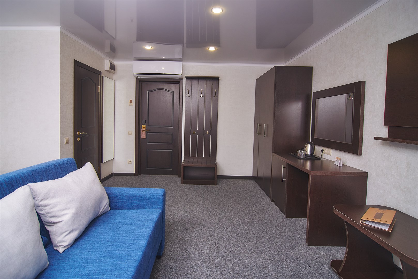 В номере: вешалка, диван, зеркало, кресло, кровать двуспальная, прикроватные тумбочки, стол, стул, шкаф, кондиционер, мини-холодильник, сейф, телевизор, телефон, чайный набор посуды, электрочайник