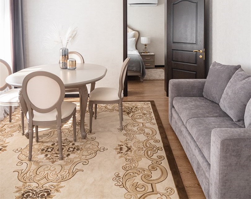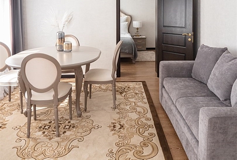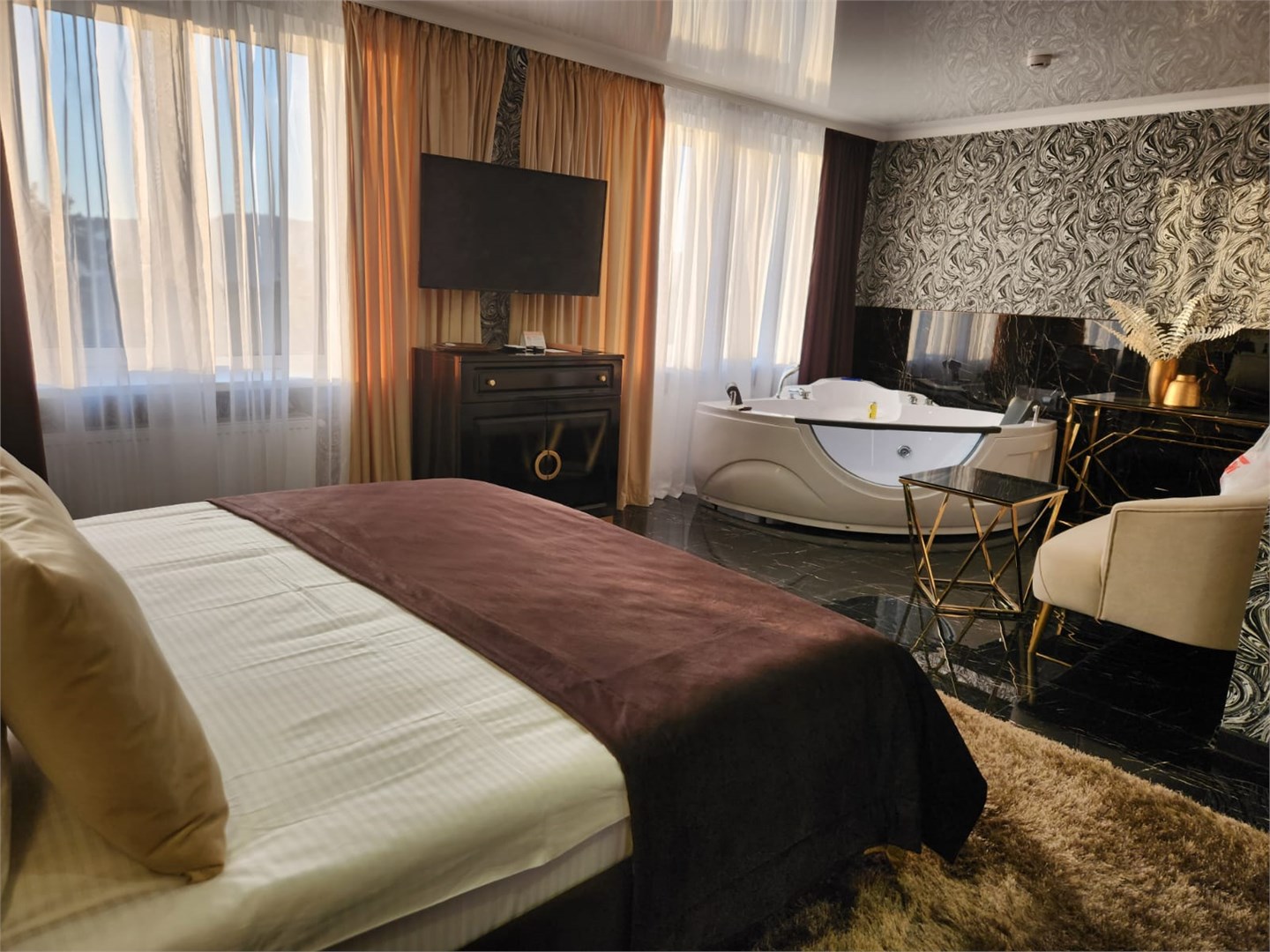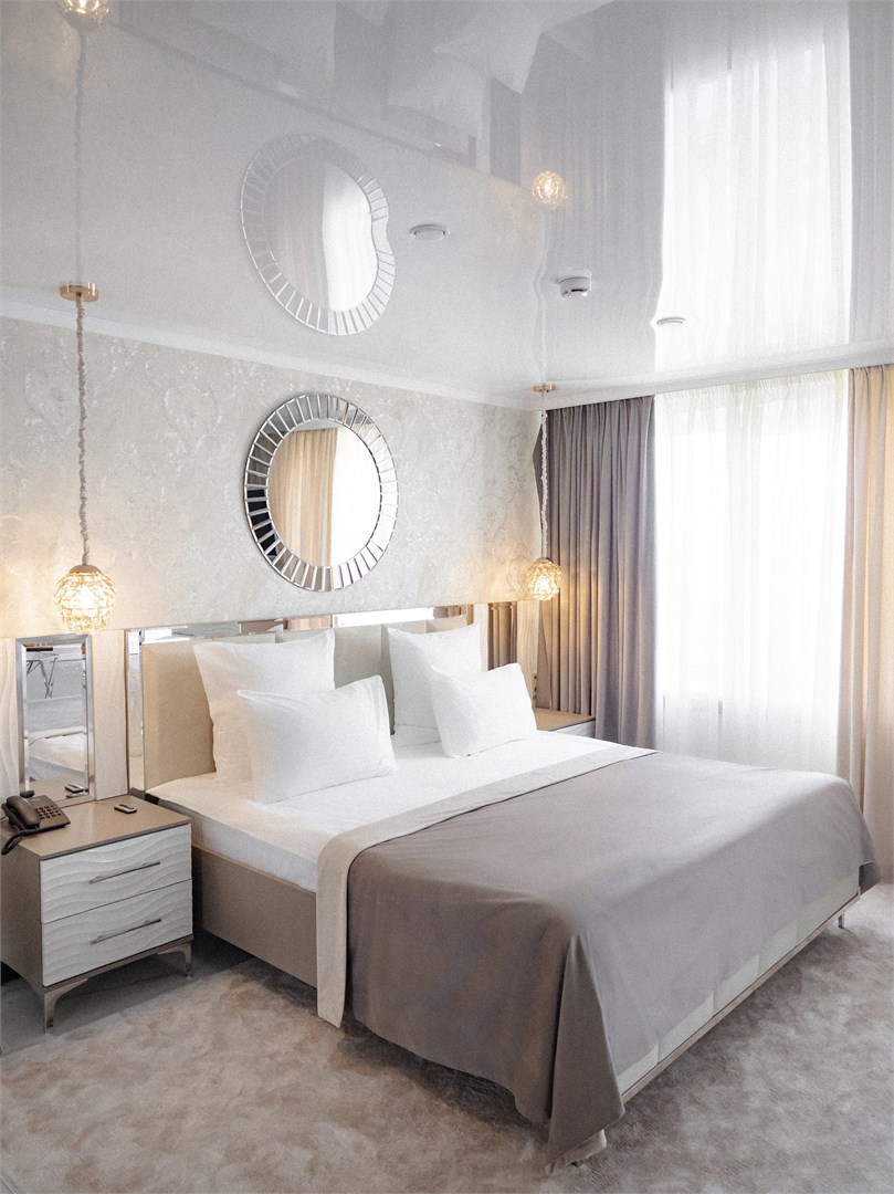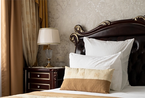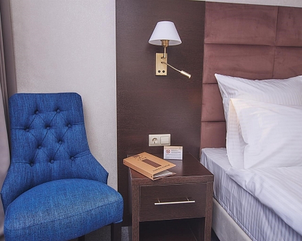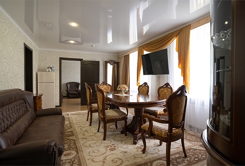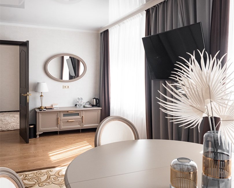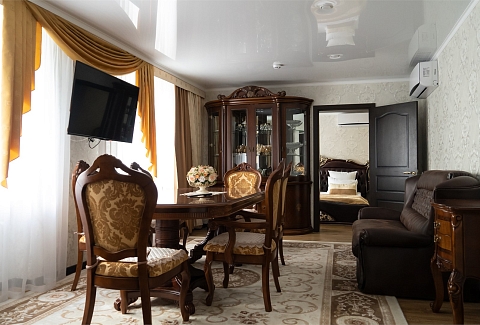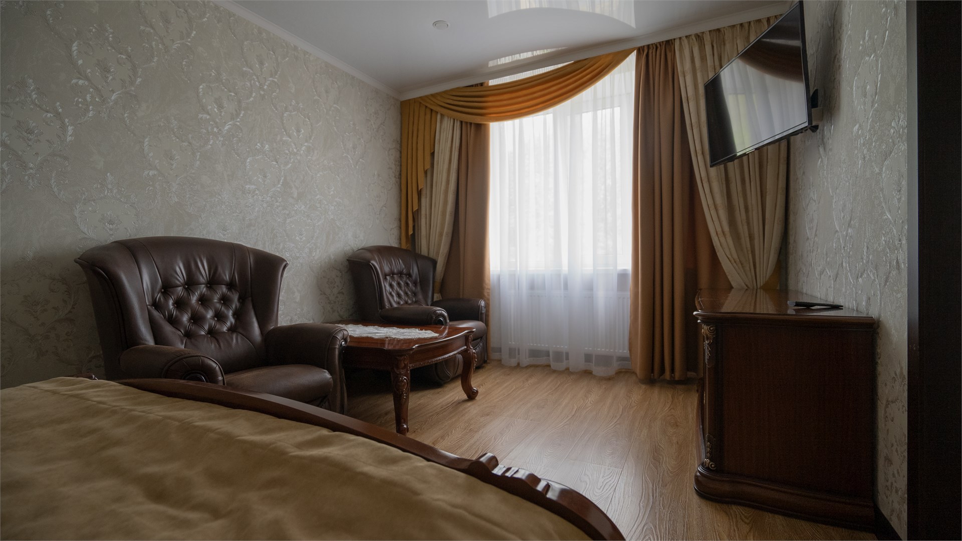 В номере: вешалка, диван, зеркало, кресло, кровать двуспальная, прикроватные тумбочки, стол, стул, шкаф, кондиционер, мини-холодильник, сейф, телевизор, телефон, чайный набор посуды, электрочайник
