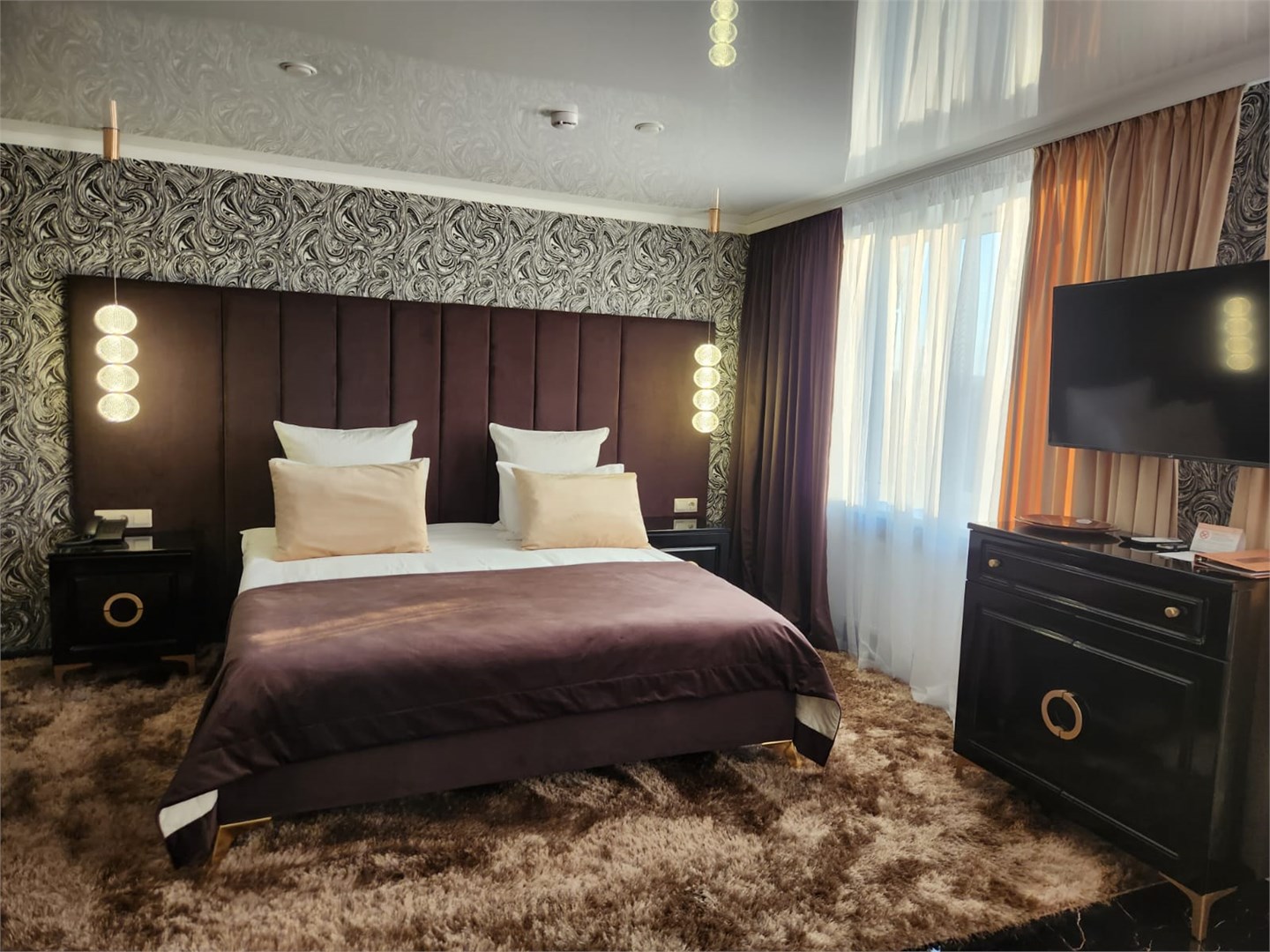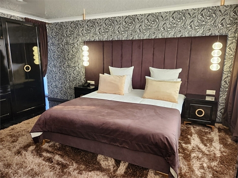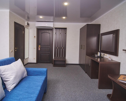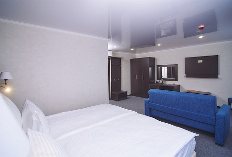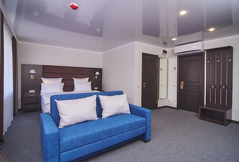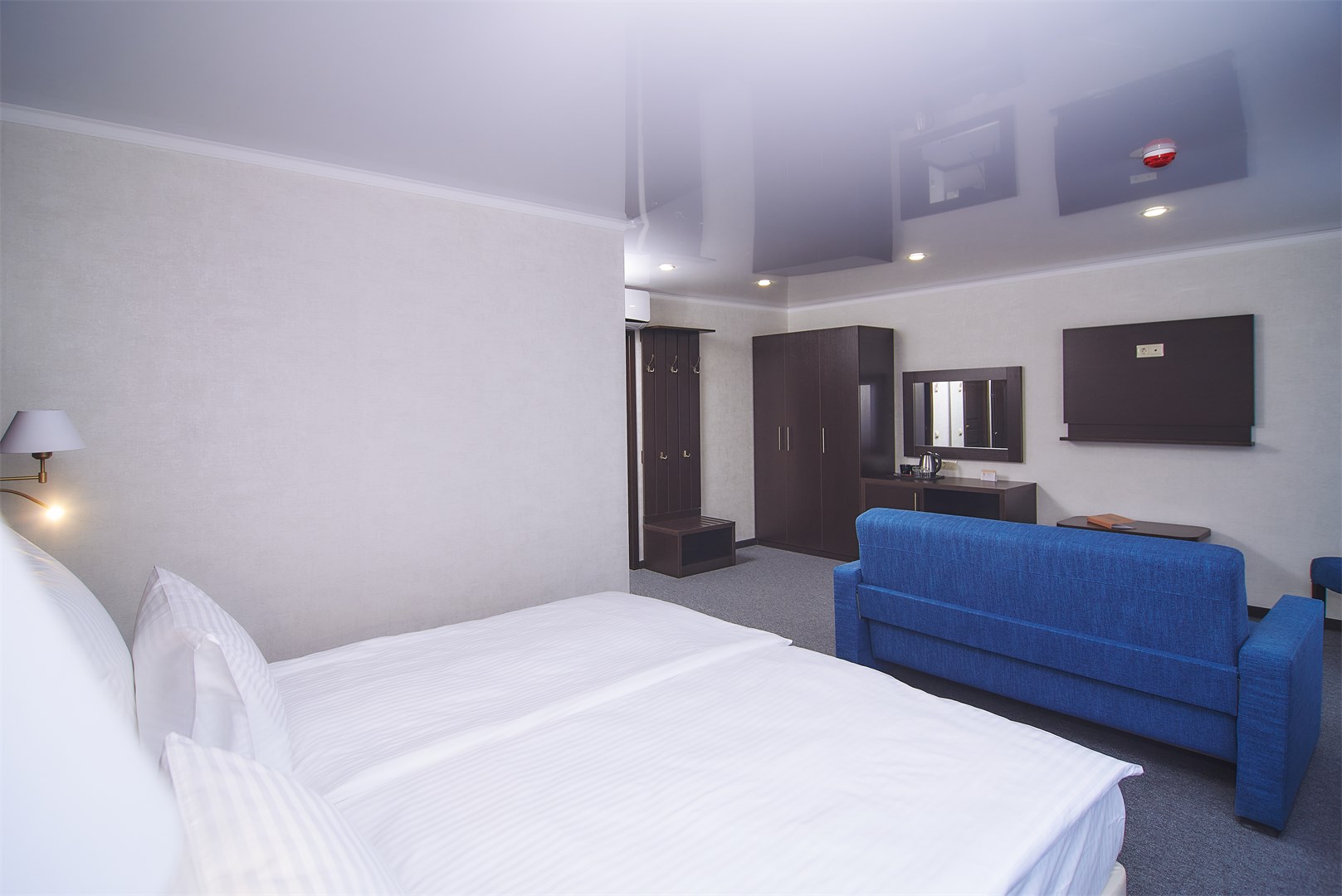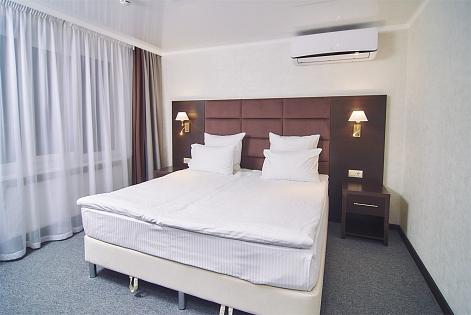 В номере: вешалка, диван, зеркало, кровать двуспальная, прикроватные тумбочки, стол, стул, шкаф, кондиционер, мини-холодильник, сейф, телевизор, телефон, чайный набор посуды, электрочайник