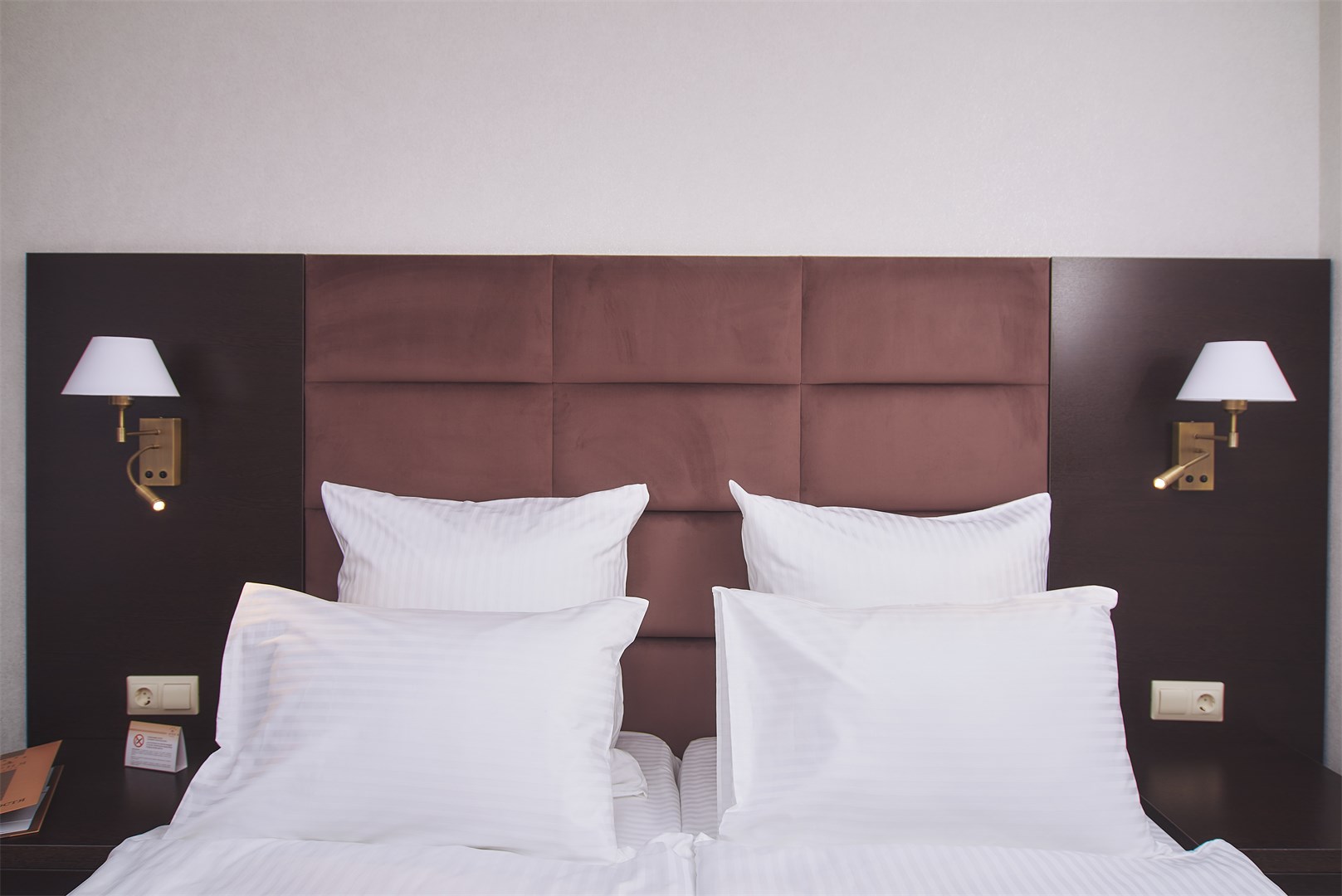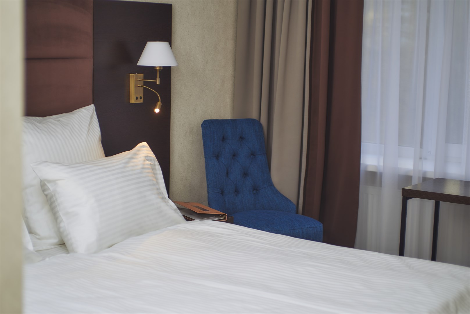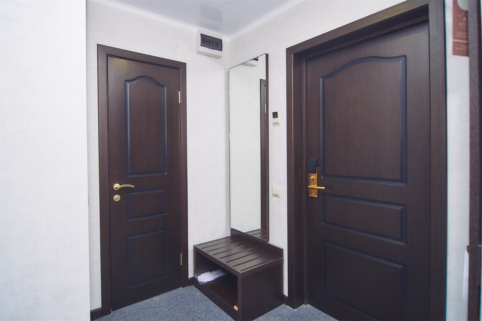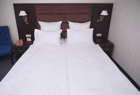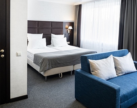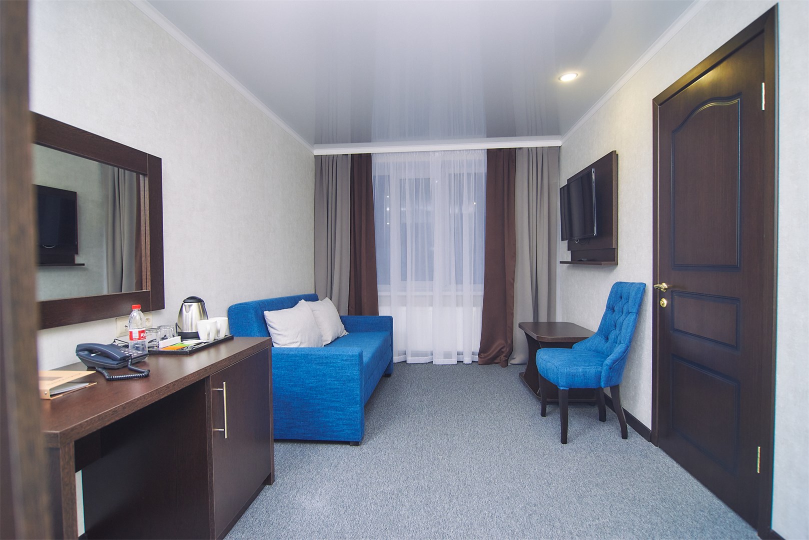 В номере: вешалка, диван, зеркало, кровати односпальные, прикроватные тумбочки, стол, стул, шкаф, кондиционер, мини-холодильник, сейф, телевизор, телефон, чайный набор посуды, электрочайник