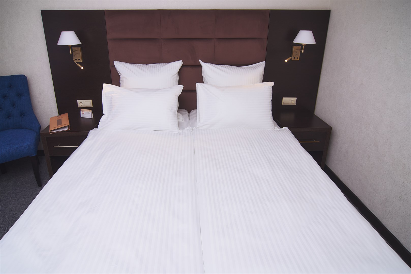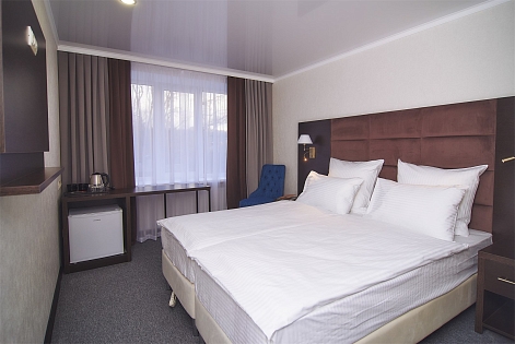В номере: вешалка, зеркало, кровати односпальные, прикроватные тумбочки, стол, стулья, шкаф, кондиционер, мини-холодильник, сейф, телевизор, телефон, чайный набор посуды, электрочайник