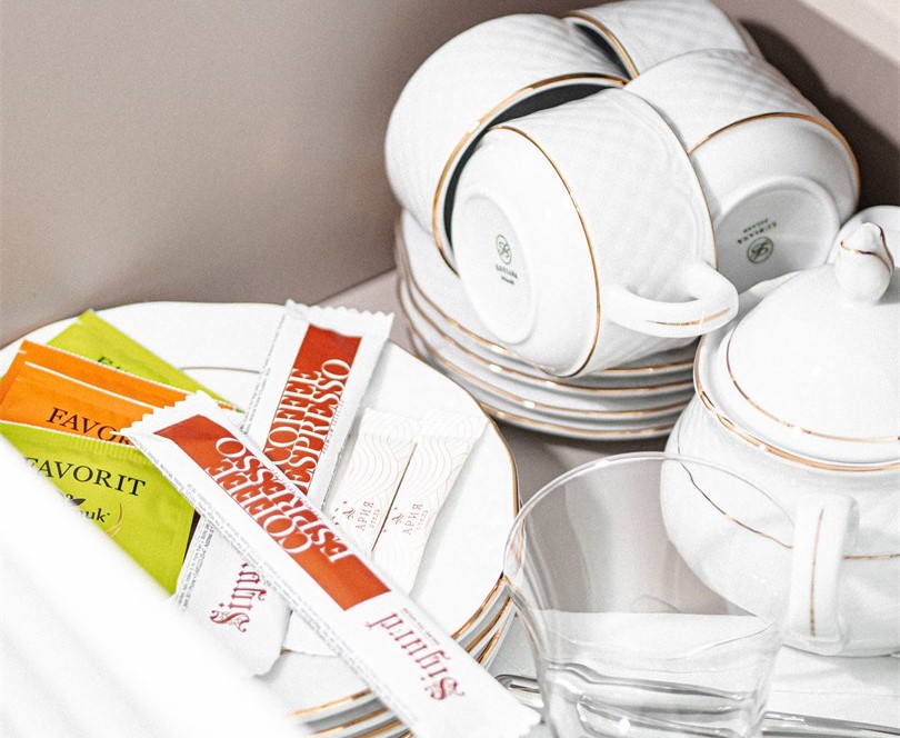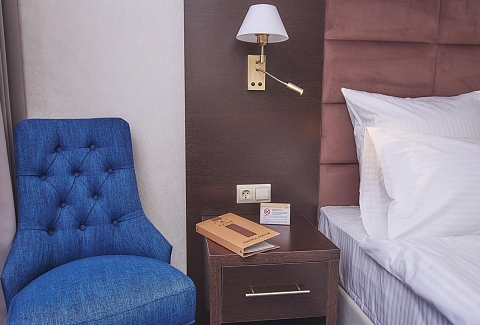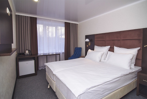 В номере: вешалка, зеркало, кровати односпальные /одна двуспальная кровать, прикроватные тумбочки, стол, стул, шкаф, кондиционер, мини-холодильник, сейф, телевизор, телефон, чайный набор посуды, электрочайник