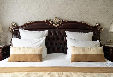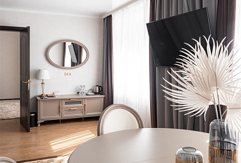 В номере: вешалка, диван раскладной, зеркало, кресло, кровать двуспальная, прикроватные тумбочки, стол, стул, шкаф, кондиционер, мини-холодильник, сейф, телевизор, телефон, чайный набор посуды, электрочайник