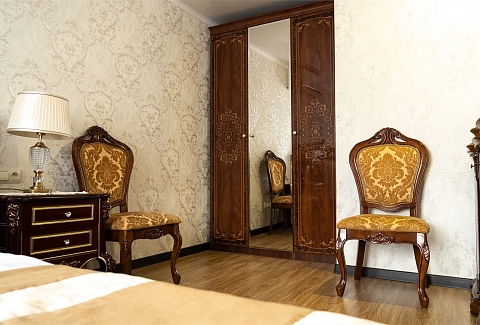 В номере: вешалка, диван, зеркало, кресла, кровать двуспальная, прикроватные тумбочки, стол, стулья, шкаф, кондиционер, набор посуды, сейф, телевизор, чайный набор посуды, электрочайник