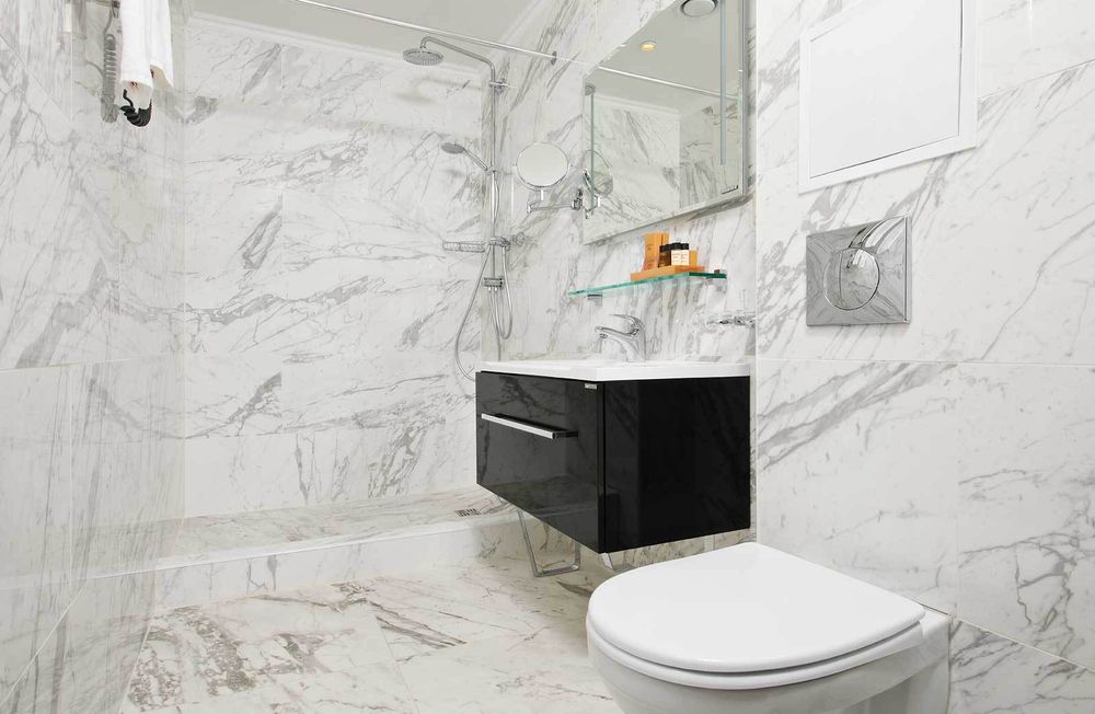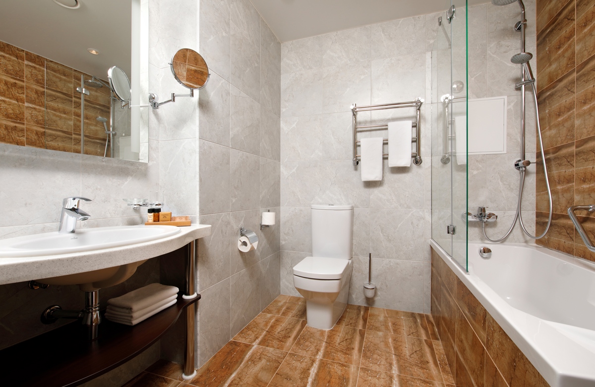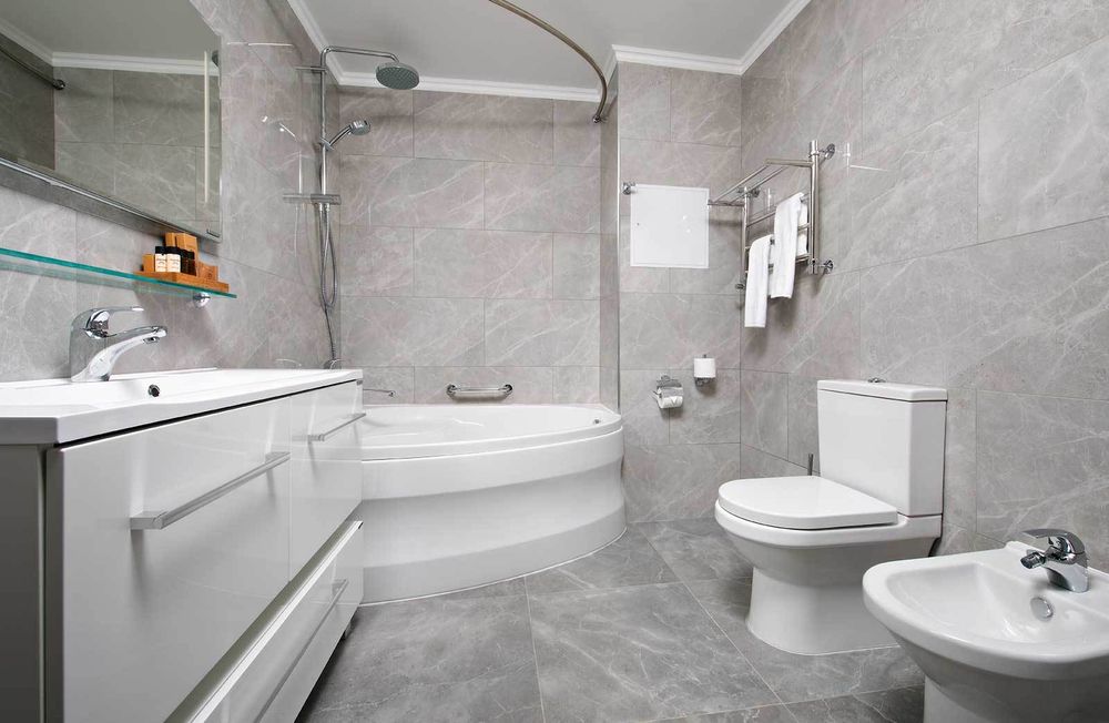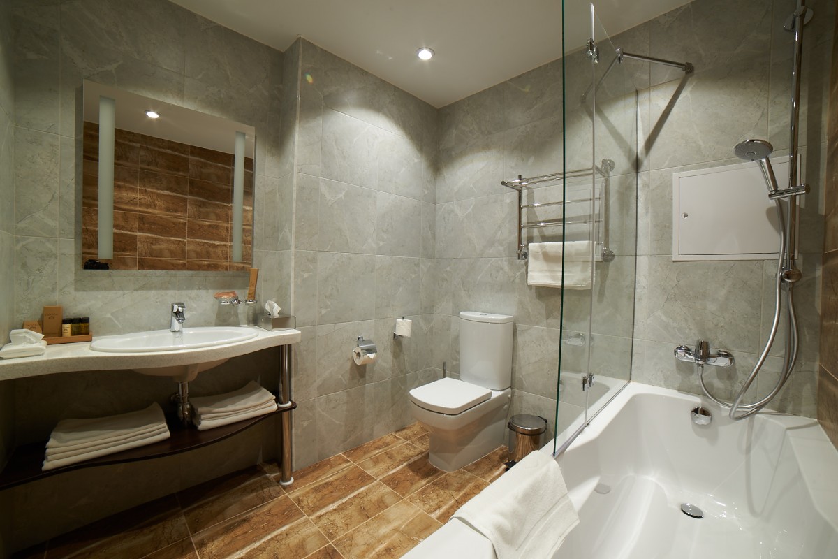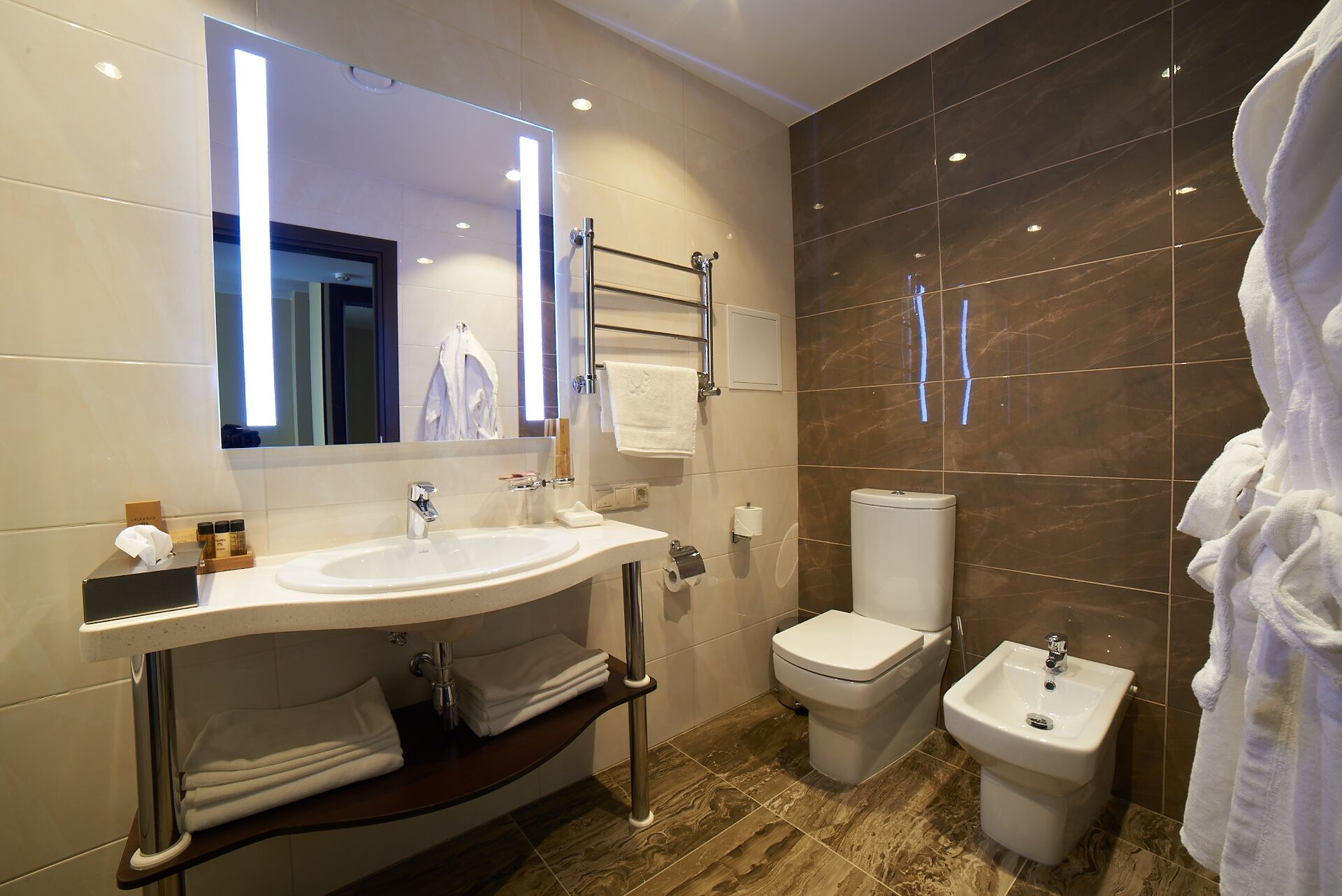 Санузел: с ванной и душевой кабиной, тапочки, туалетные принадлежности, фен, халат