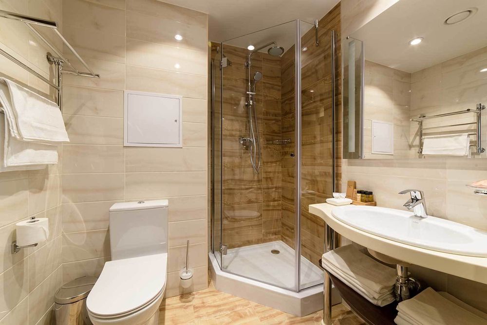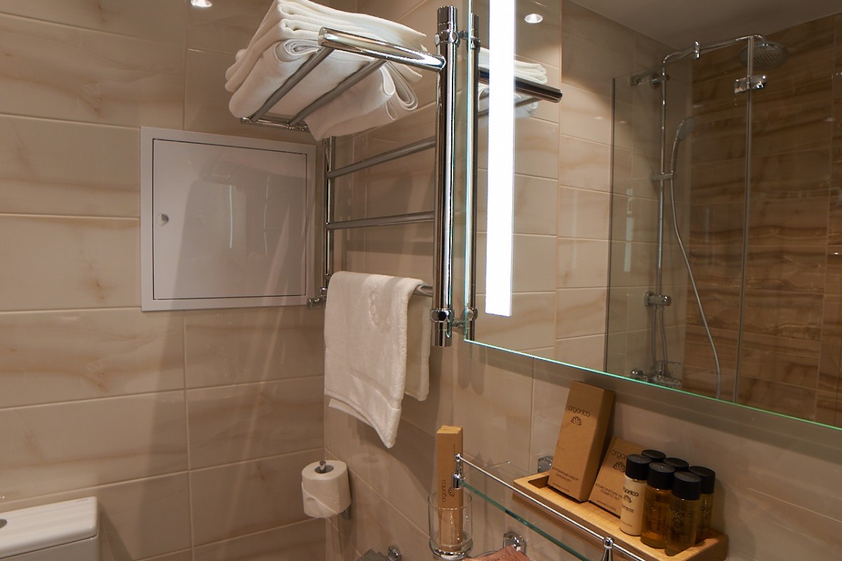 Санузел: с душевой кабиной, тапочки, туалетные принадлежности, фен, халат