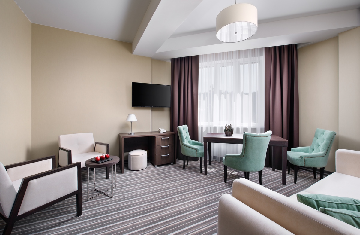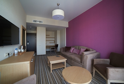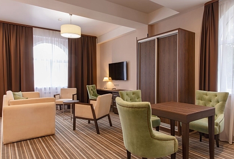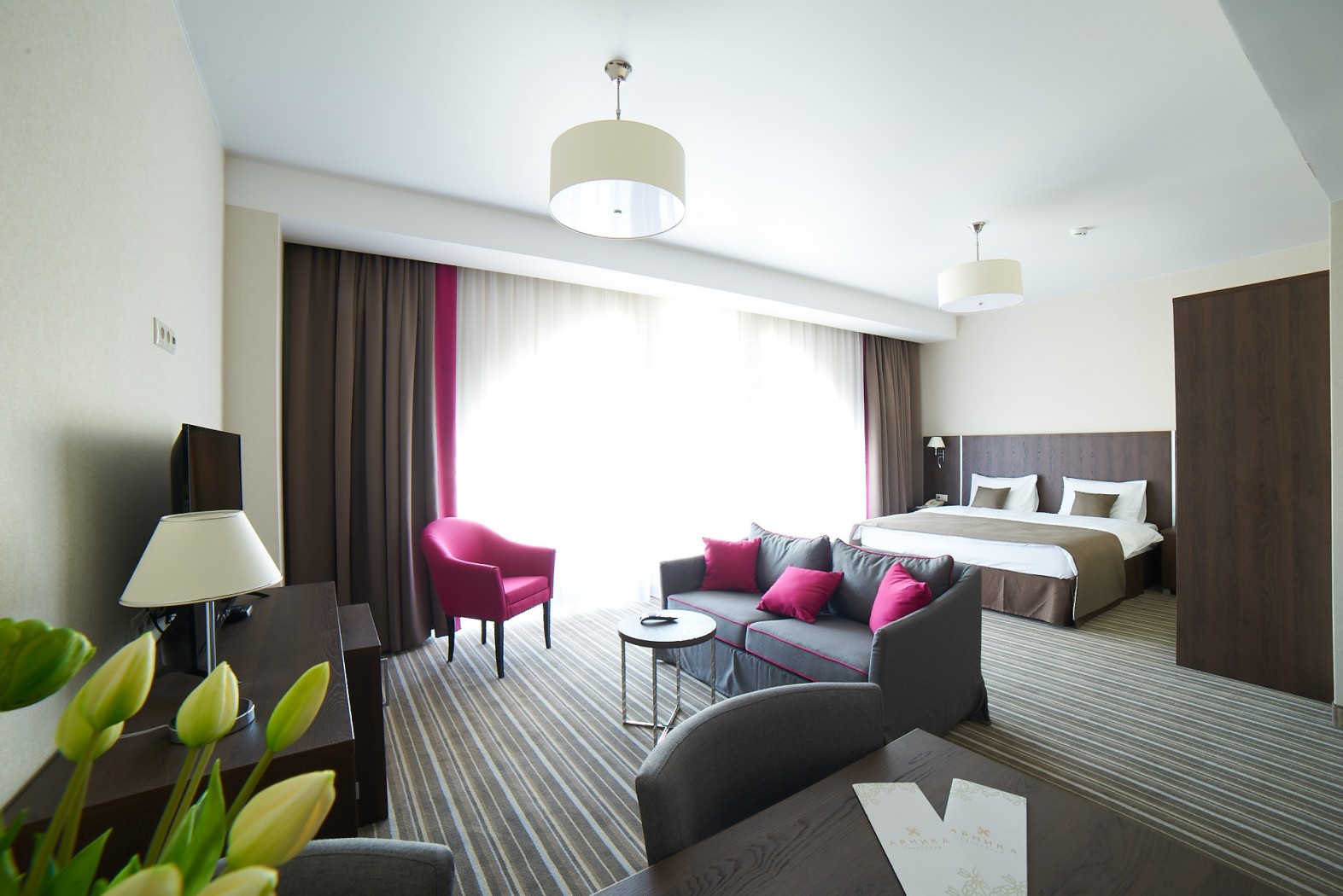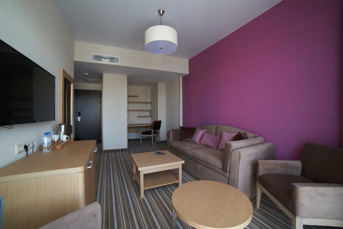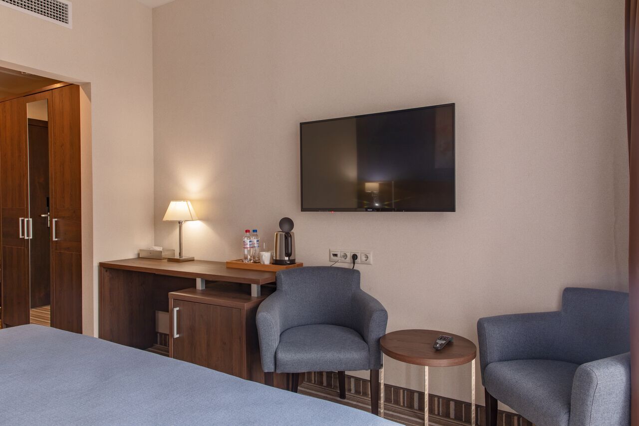 В номере: вешалка, диван, зеркало, кресла, кровать двуспальная, прикроватные тумбочки, стол, тумба багажная, шкаф, кондиционер, сейф, телевизор, телефон, холодильник, чайный набор посуды, электрочайник
