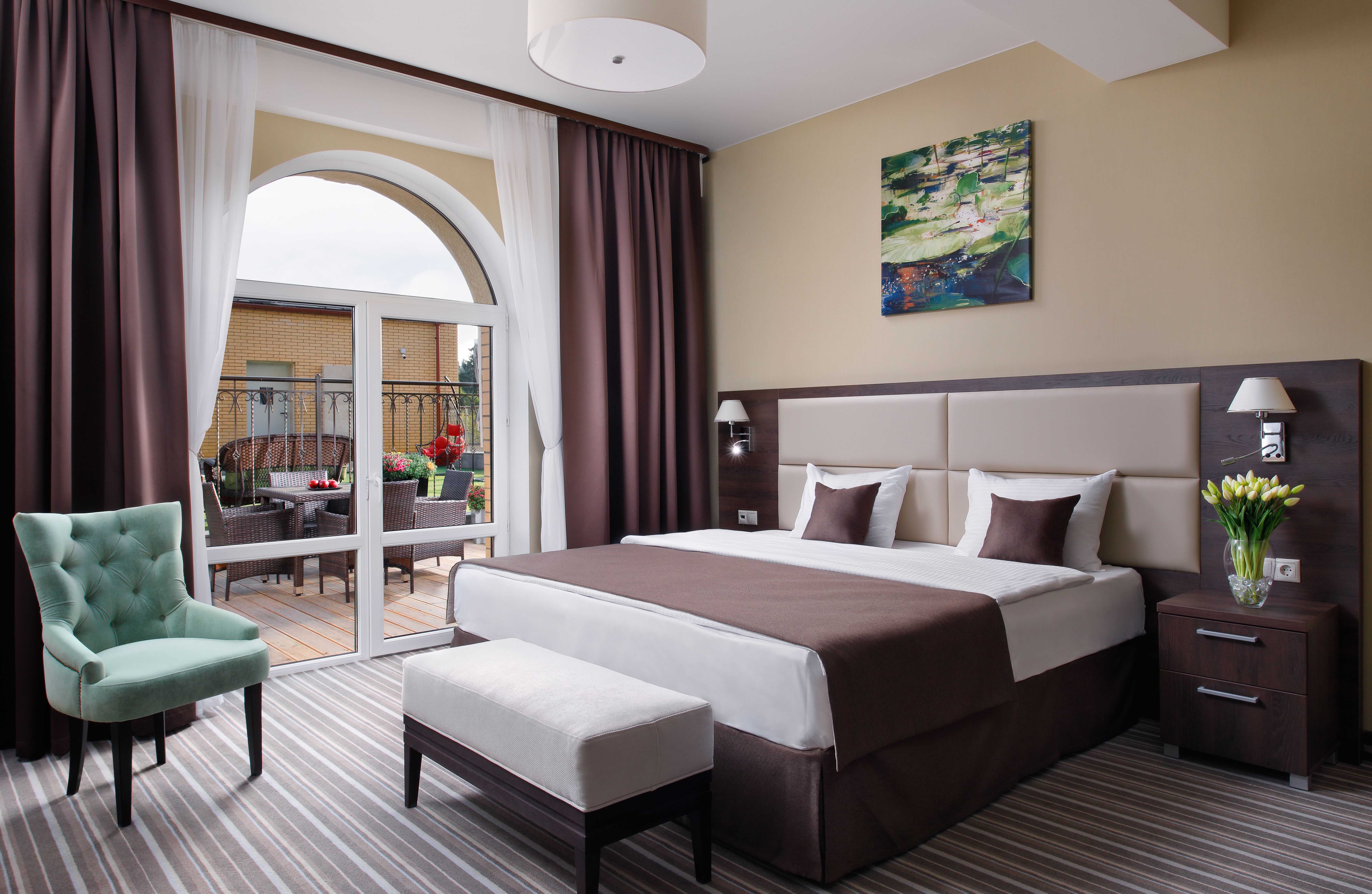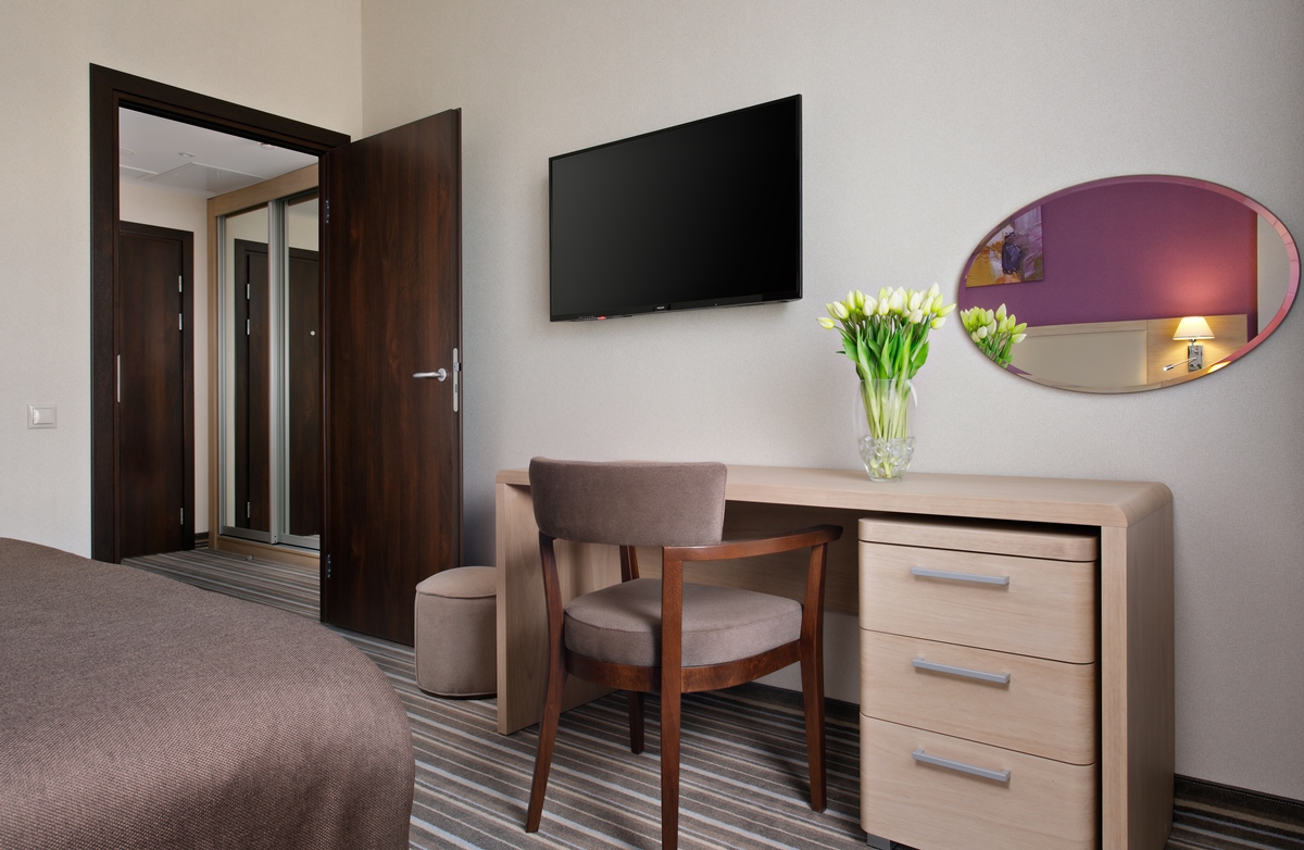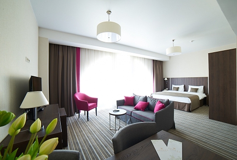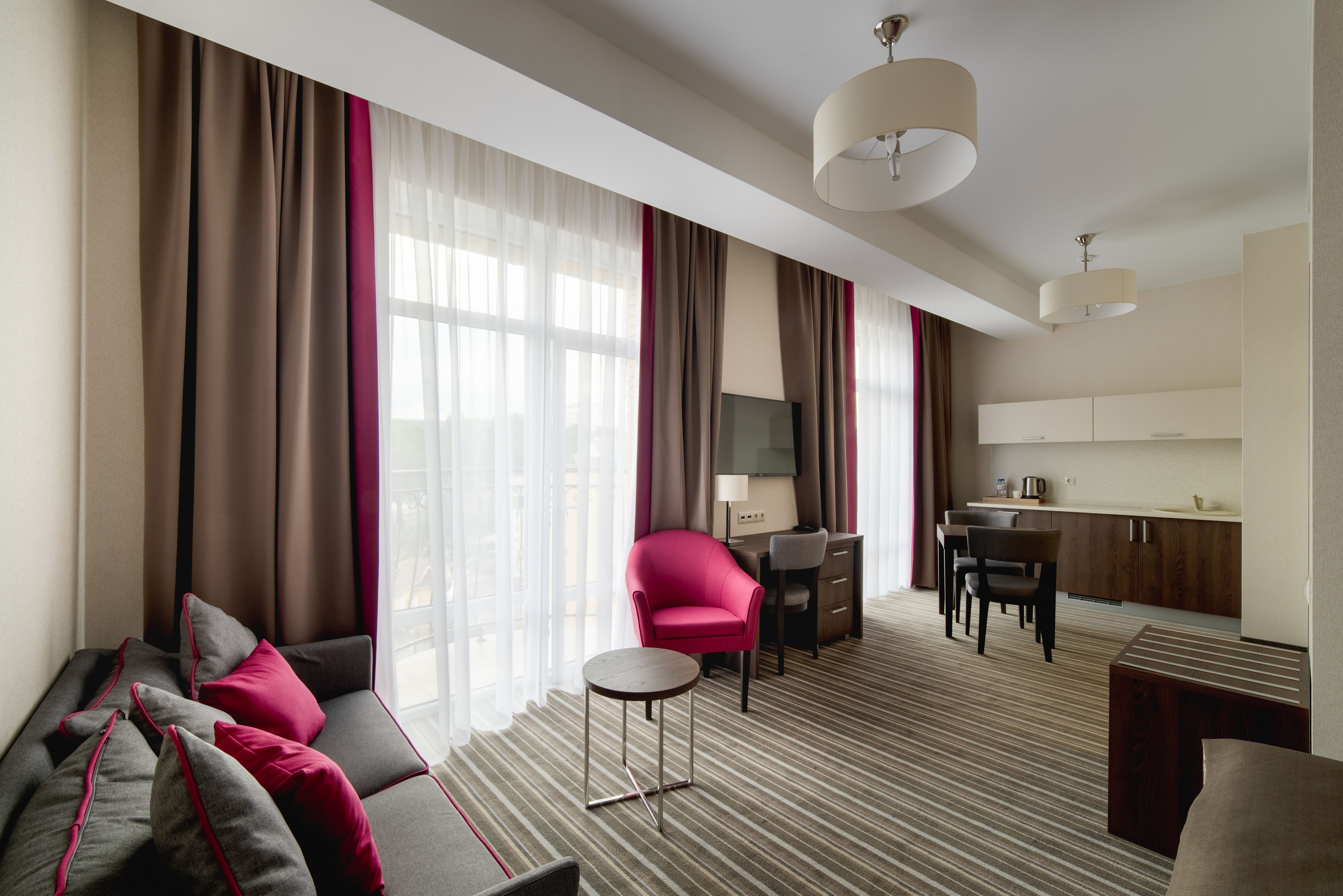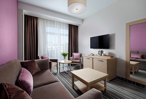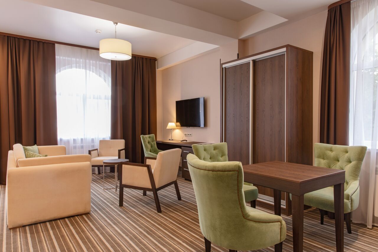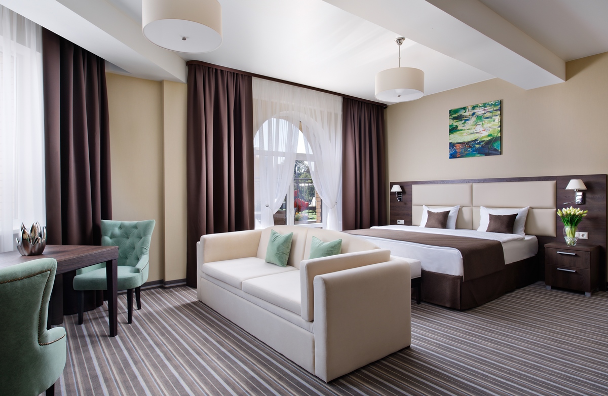 В номере: вешалка, диван, зеркало, кресла, кровать двуспальная, прикроватные тумбочки, стол, тумба багажная, шкаф, кондиционер, сейф, телевизор, телефон, холодильник, чайный набор посуды, электрочайник