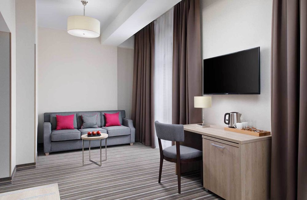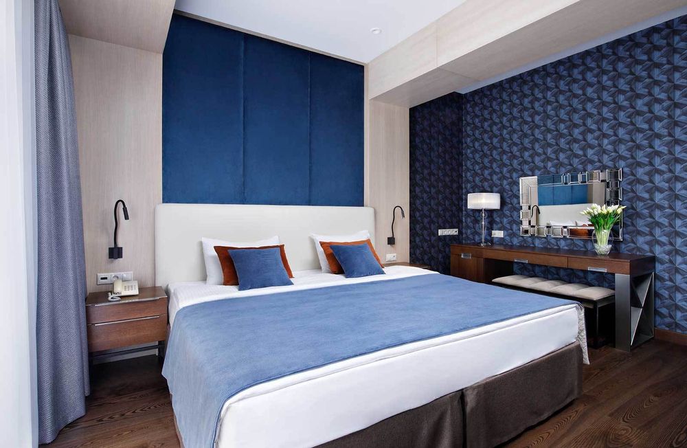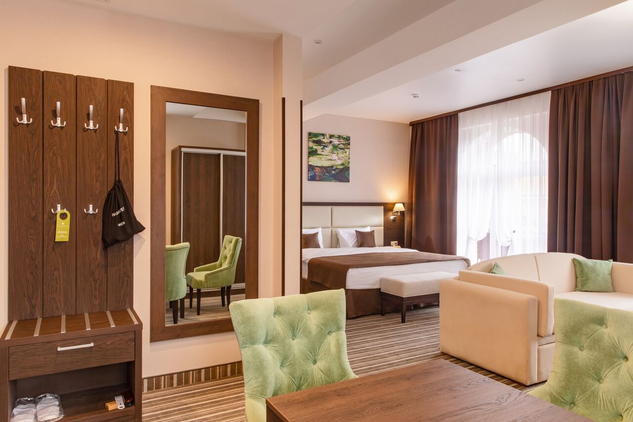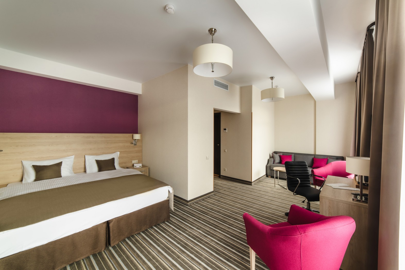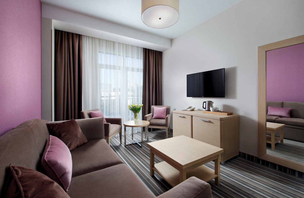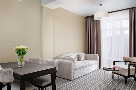 В номере: вешалка, диван, зеркало, кресла, кровать двуспальная, прикроватные тумбочки, стол, тумба багажная, шкаф, кондиционер, сейф, телевизор, телефон, холодильник, чайный набор посуды, электрочайник