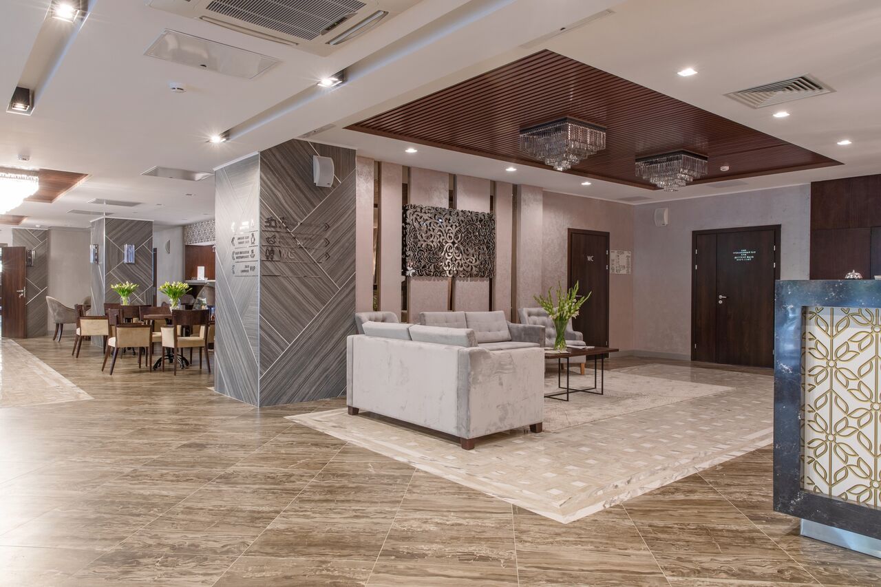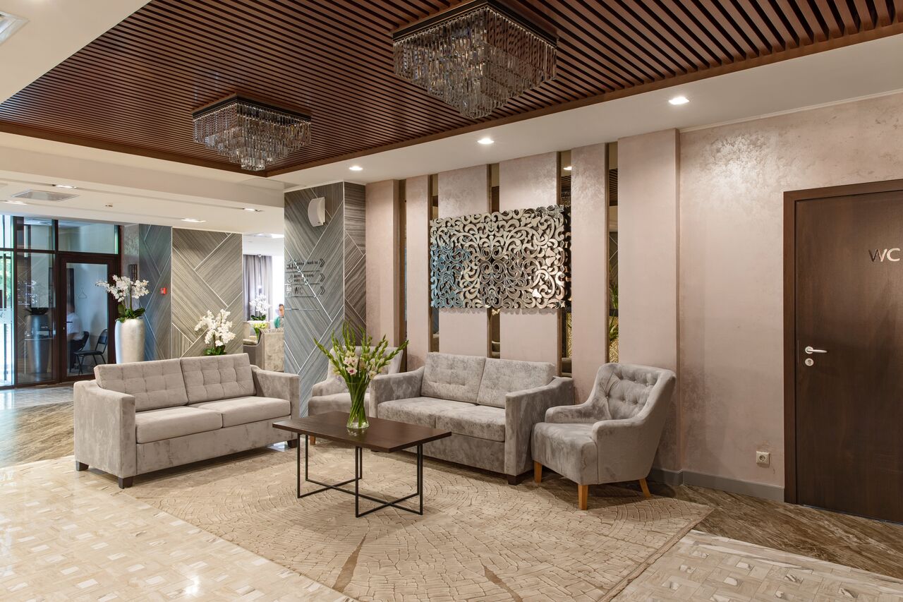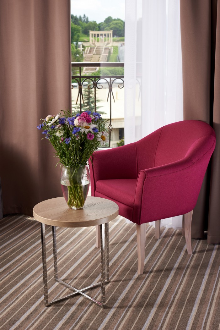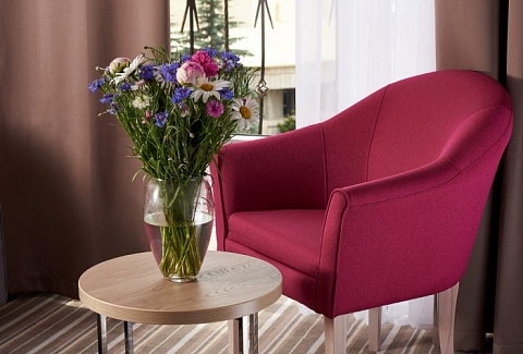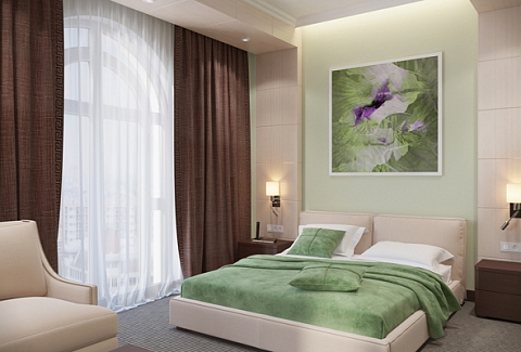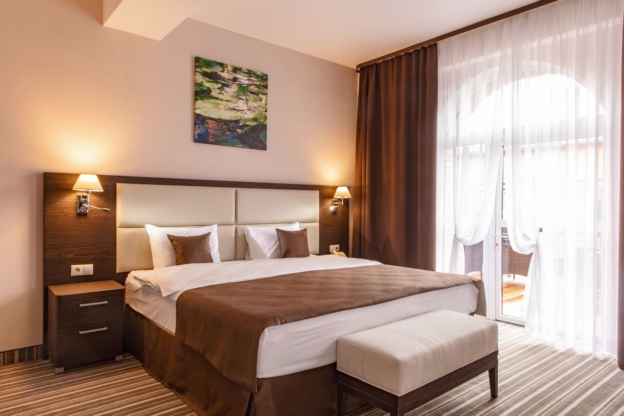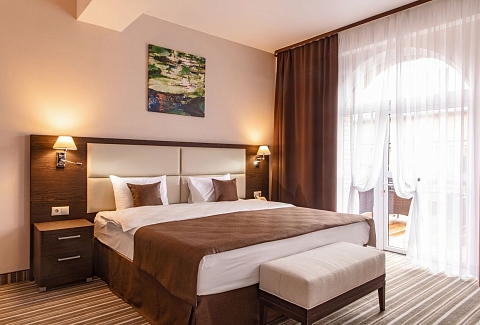В номере: вешалка, диван, зеркало, кресла, кровать двуспальная, прикроватные тумбочки, стол, тумба багажная, шкаф, кондиционер, сейф, телевизор, телефон, холодильник, чайный набор посуды, электрочайник